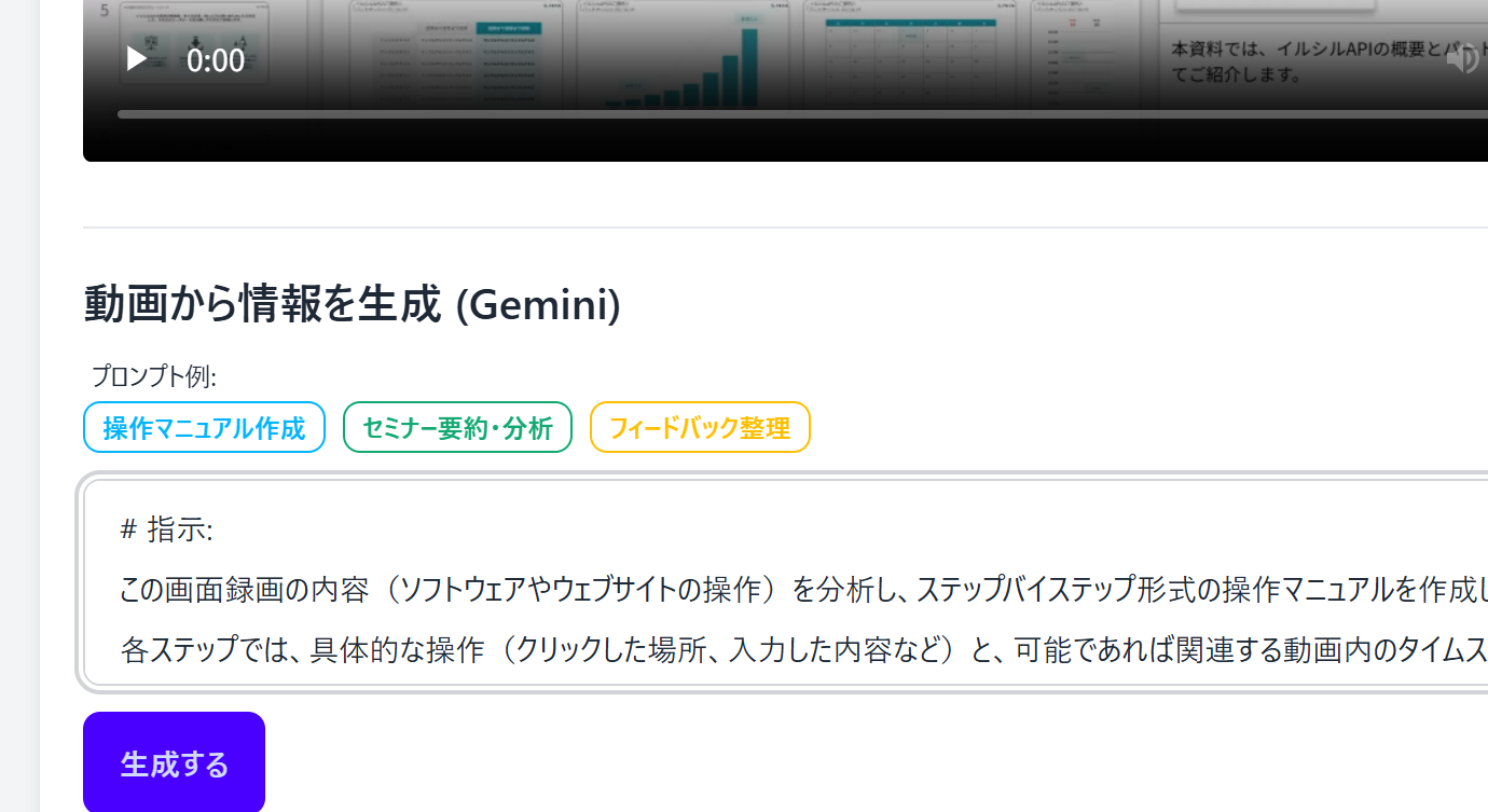 ブラウザだけで画面を録画して、製品の利用マニュアルやSNS投稿用に簡単に動画をシェアすることができます。 さらにAIにプロンプトを投げることで動画から製品のマニュアルを作ったり、書き起こしたり、資料にフィードバックをすることができます。