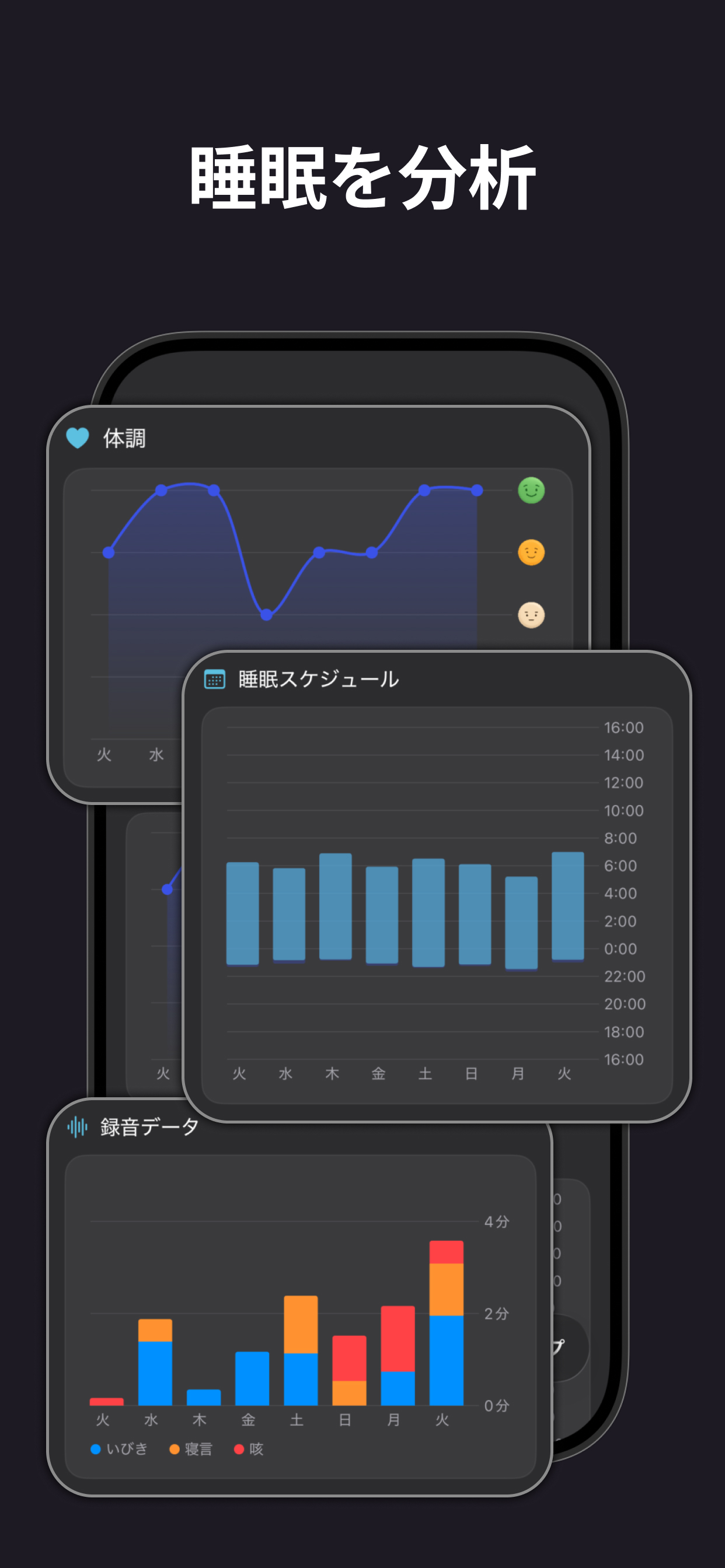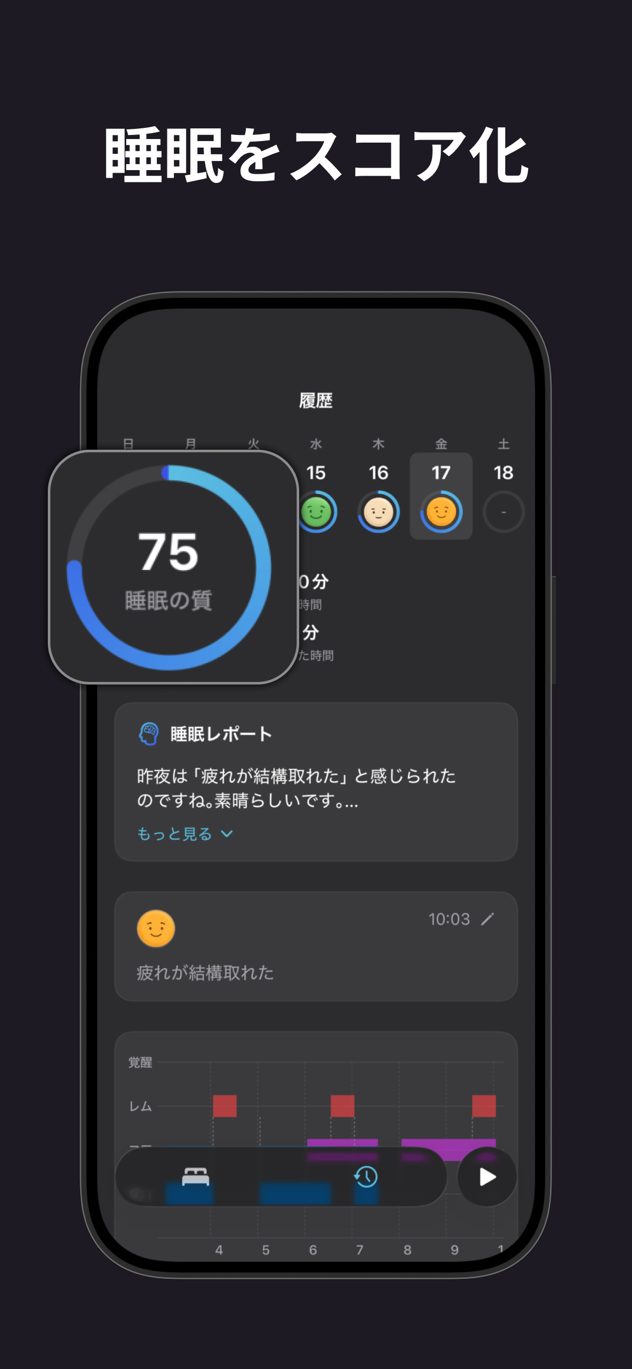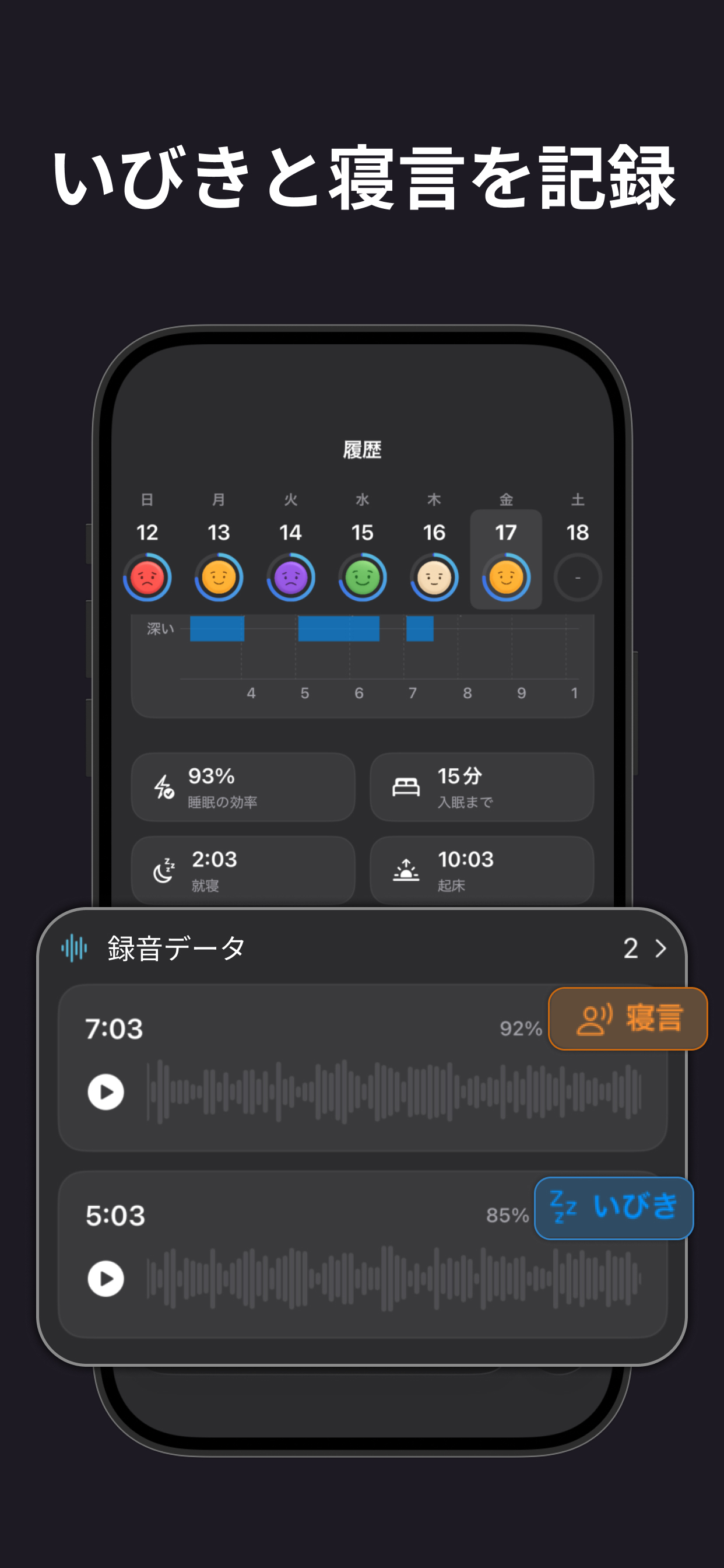 「日々の睡眠をより良くしたいですか?」 Dozunoは、最高の睡眠をサポートする睡眠記録アプリです。 寝る前にワンタップ、起きたらひと言メモ。それだけで、AIがあなたの眠りを分析し、やさしく改善ヒントを届けます。 スマートアラームがあなたの眠りが浅くなったベストなタイミングで起こしてくれます。 できること ・いびき・寝言を録音し、聞くことができる ・眠りが浅いタイミングで起こすスマートアラーム ・睡眠時間・深さのグラフ ・睡眠トレンドを分析 — 睡眠・体調・いびきの変化を一目で把握 ・起床時の気分をワンタップ記録、日々の「睡眠ジャーナル」に ・AIが毎日のフィードバックで習慣改善をサポート こんな人におすすめ ・寝ても疲れが取れない、朝スッキリ起きられない ・自分がいびきをかいているか確かめたい ・パートナーに「いびきがうるさい」と言われた ・睡眠の質を数字で把握して改善したい ・難しい設定なしで続けられる睡眠記録がほしい 3ステップだけで簡単に続けられる 1. 寝る前にボタンを押すだけ 2. 起きたら気分をひと言入力 3. AIのフィードバックをチェック アカウント登録不要、プライバシーを大切にしています。 今夜から、最高の睡眠を送りましょう。