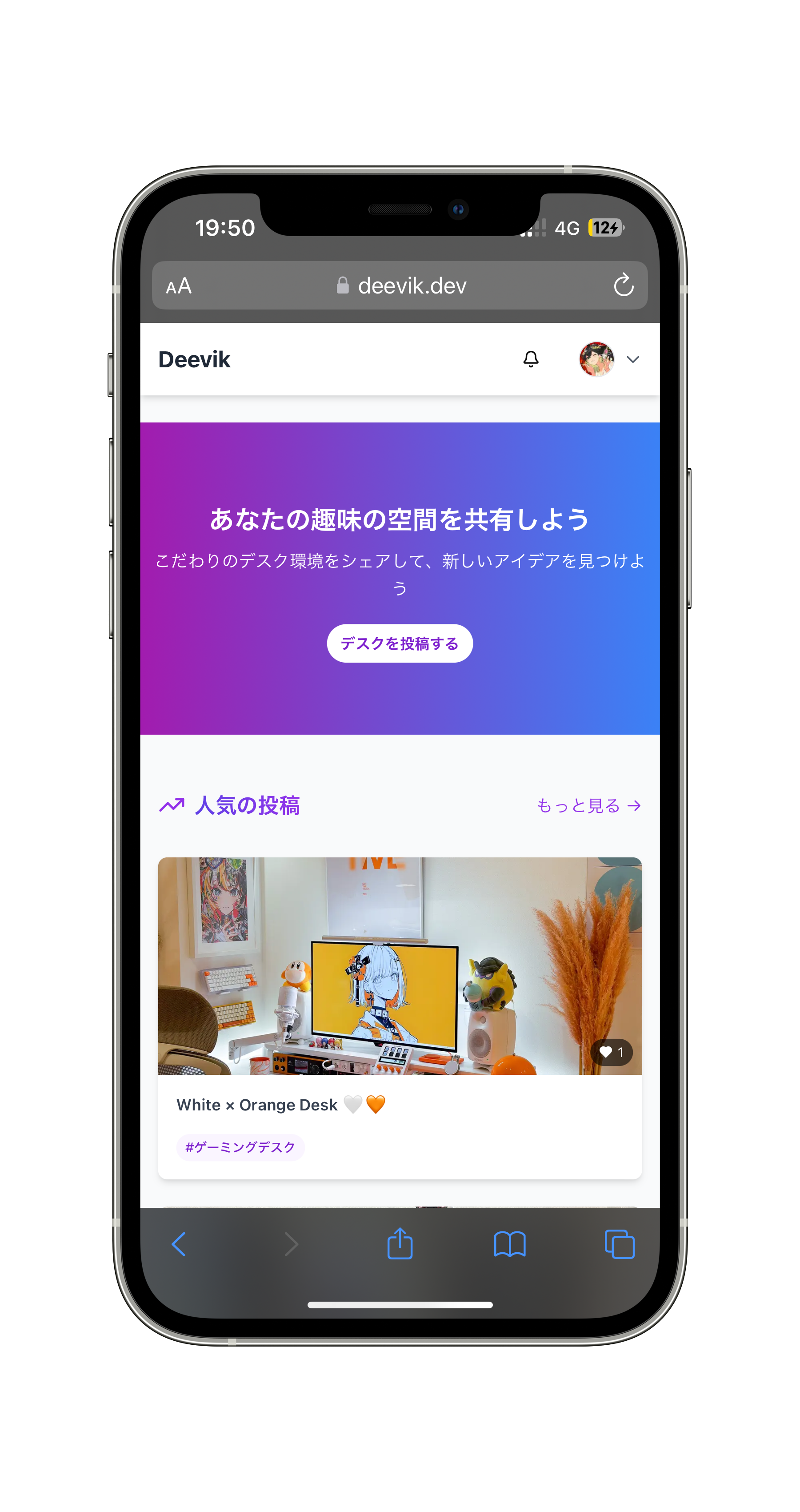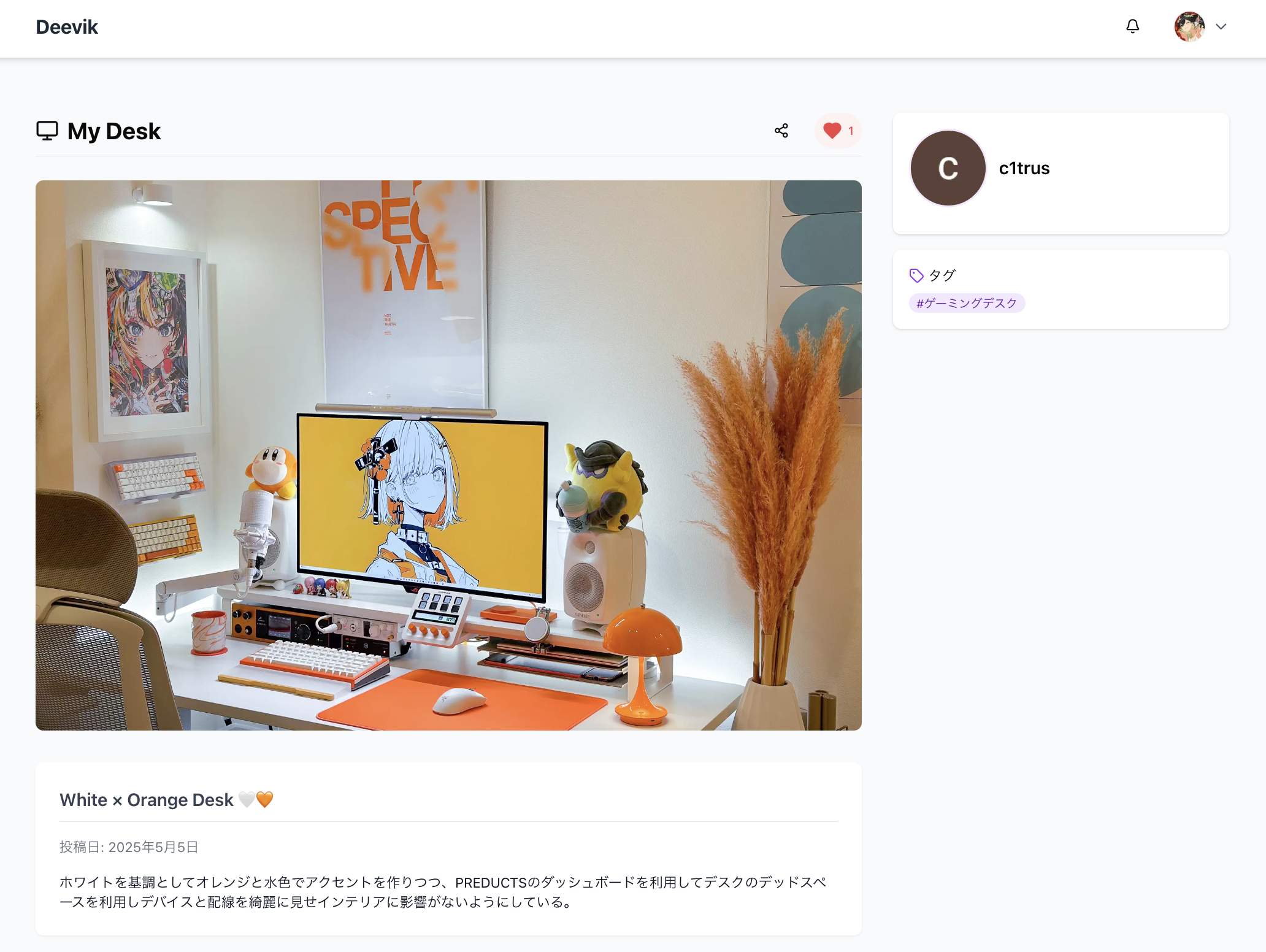 Deevikは、自分のデスク環境をシェアできるプラットフォームです。 お気に入りのデスク写真やデバイスを投稿して、あなたの趣味の空間を共有しよう ✅ 現在ご利用いただける機能 ・デスク写真投稿 自分のワークスペースを撮影して、ギャラリー形式で公開 ・デバイス投稿 キーボードやモニター、チェアなどお気に入りのガジェットを詳しく紹介 ・プロフィール設定 自己紹介やSNSリンクを充実させて、フォロワーを増やそう ・タグ検索 #ゲーミングデスク #在宅ワーク…気になるタグですぐ探せる 📝 今後リリース予定の機能 ・デバイスランキング 人気のガジェットをランキング形式でチェック ・“このデバイスを使っているデスク”検索 気になるデバイスを使ったワークスペース例をすぐに見つける
