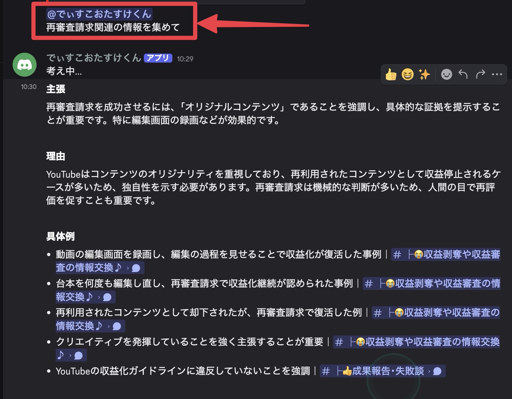Discord サーバーの会話履歴を AI で検索・分析する高性能ボットシステムです。 メンバーがボットに質問すると、過去の関連する会話を自動的に検索し、AIが文脈を理解した上で的確な要約を生成します。 キーワード検索とセマンティック検索を組み合わせたハイブリッド検索により、単純な文字列マッチングでは見つからない関連情報も発見できます。 また、要約時に参照したメッセージへのリンクも出力されるので、本当にこんなこと言ってたのかなと思った時に過去の会話をすぐに確認できます。 主な特徴: - 会話の文脈を理解して構造化された回答を生成 - 最新情報を優先する独自のスコアリングシステム - 日本語の自然な検索と要約に完全対応 - 参照元メッセージへのリンク生成 技術コミュニティ、教育サーバー、大規模ゲーミングコミュニティなど、重要な情報が流れてしまいがちな Discord サーバーに最適です。