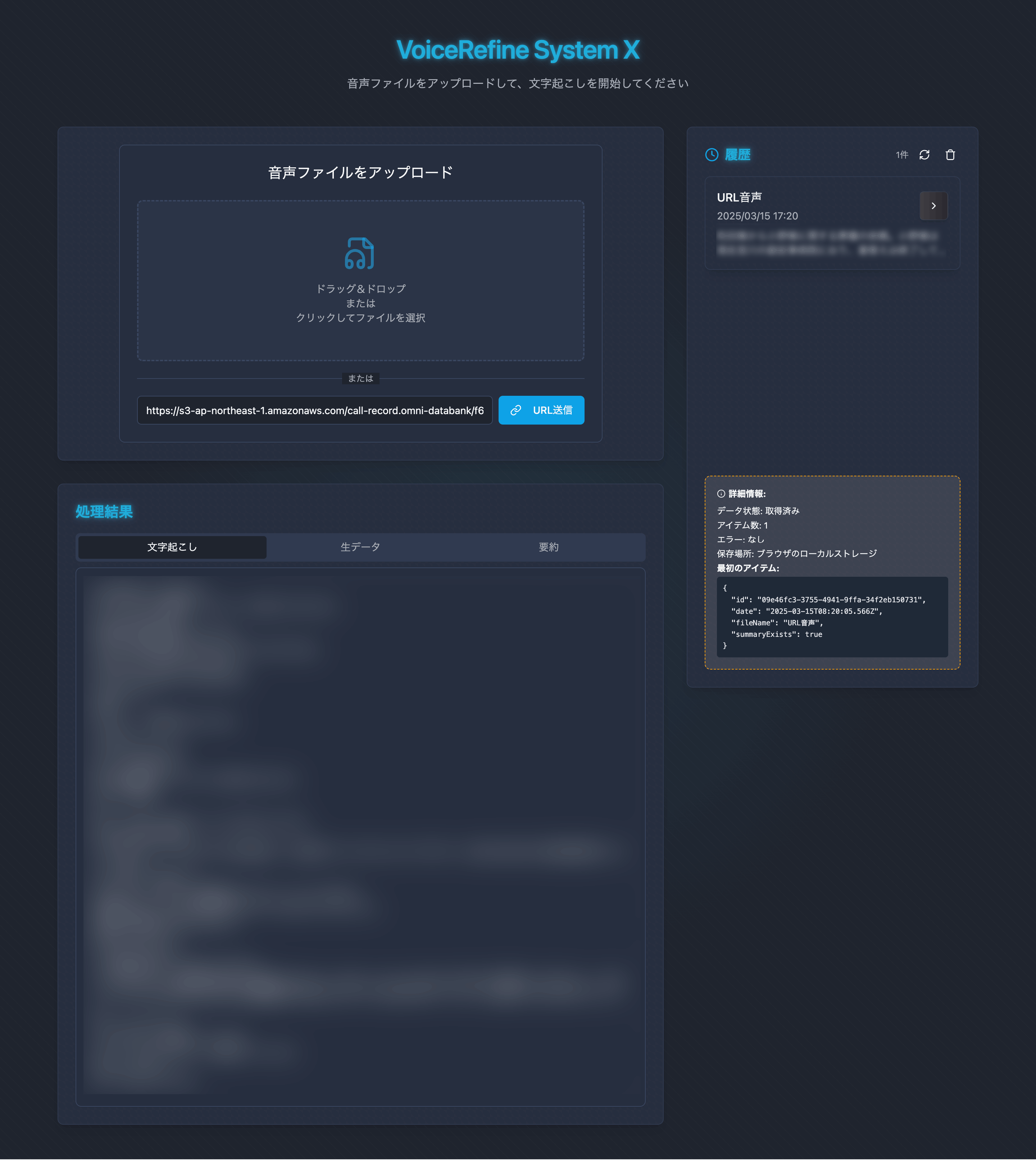 主な機能は: ・音声ファイルをアップロードして自動で文字起こし ・文字起こし結果を見やすく表示 ・ボタン一つで音声内容の要約を生成 ・過去の文字起こしや要約を履歴としてブラウザベースで保存・閲覧 特別な知識がなくても直感的に操作でき、議事録作成や会議内容の共有など、日常的なコミュニケーションの効率化に役立ちます。