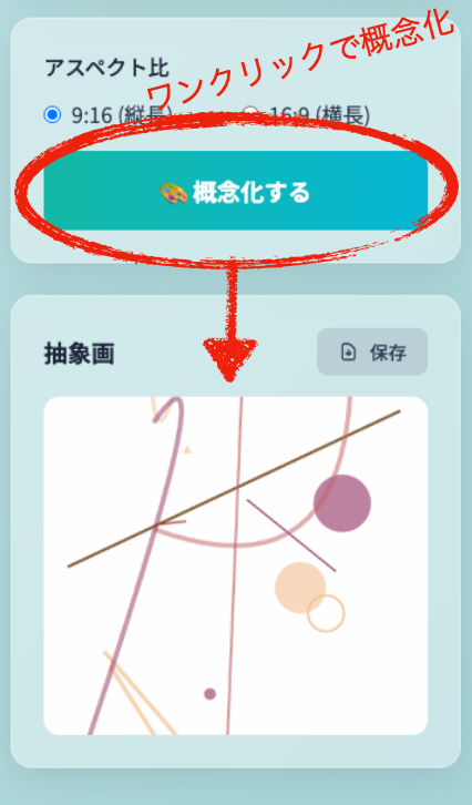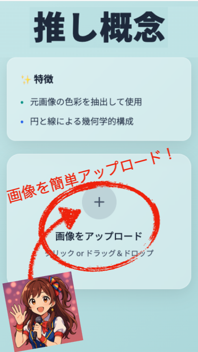 好きなアイドルやキャラクターを、もっとあなただけの“秘密のアート”に変身させよう! 職場でも、家族の前でも気兼ねなく楽しめる―― スマホのロック画面やSNSのプロフィールに、推しをカンディンスキー風の抽象画でさりげなく飾れば、周りの視線も気にならない! 『推し概念』なら、 あなたの推しをスタイリッシュな幾何学アートに一瞬で変換 シェアしても恥ずかしくない、おしゃれな仕上がり 日常に彩りを添える新感覚の“推し活”をサポート さあ、『推し概念』で、いつもの推し活をもっとクールに、もっとワクワクに!
