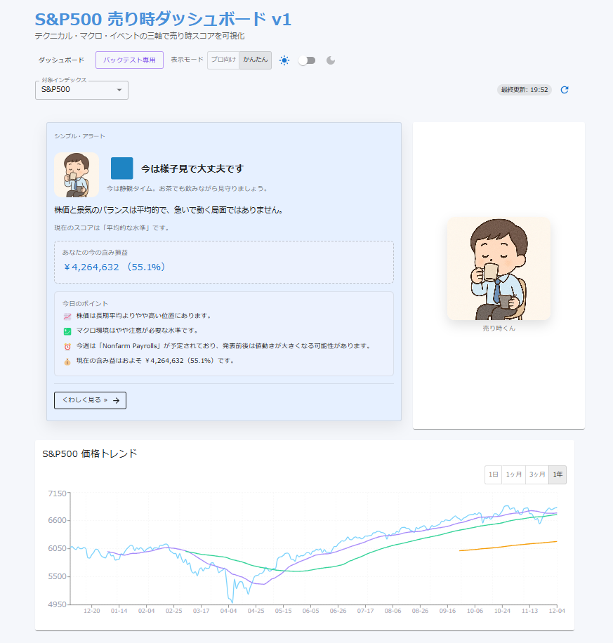 🧭 これは何? 売り時くんは、インデックス投資の「売りどき」を自動で見える化するWebアプリです。 S&P500 / TOPIX / 日経225 / NIFTY50 などの指数を切り替えるだけで、最適な売買タイミングを即時シミュレーションできます。 🎯 特徴(3ポイントで伝える) 1クリックで最適な売買タイミングを可視化 → 初心者でも理解できるシンプルUI 指数ごとの“最適戦略”が分かる → 例:S&P500=ほぼホールド、TOPIX=売買型 即時バックテスト機能付き → 手間ゼロでプロ級の分析 📈 対応インデックス(β版) S&P500 TOPIX 日経225 NIFTY50(インド株) ※順次拡張予定 🧪 現在のステータス β版 UI改修中 インデックス追加中 バックテスト精度アップ中 💬 フィードバック募集 改善要望・機能追加リクエストを受け付けています! Solomaker / X / GitHub どこからでもどうぞ。