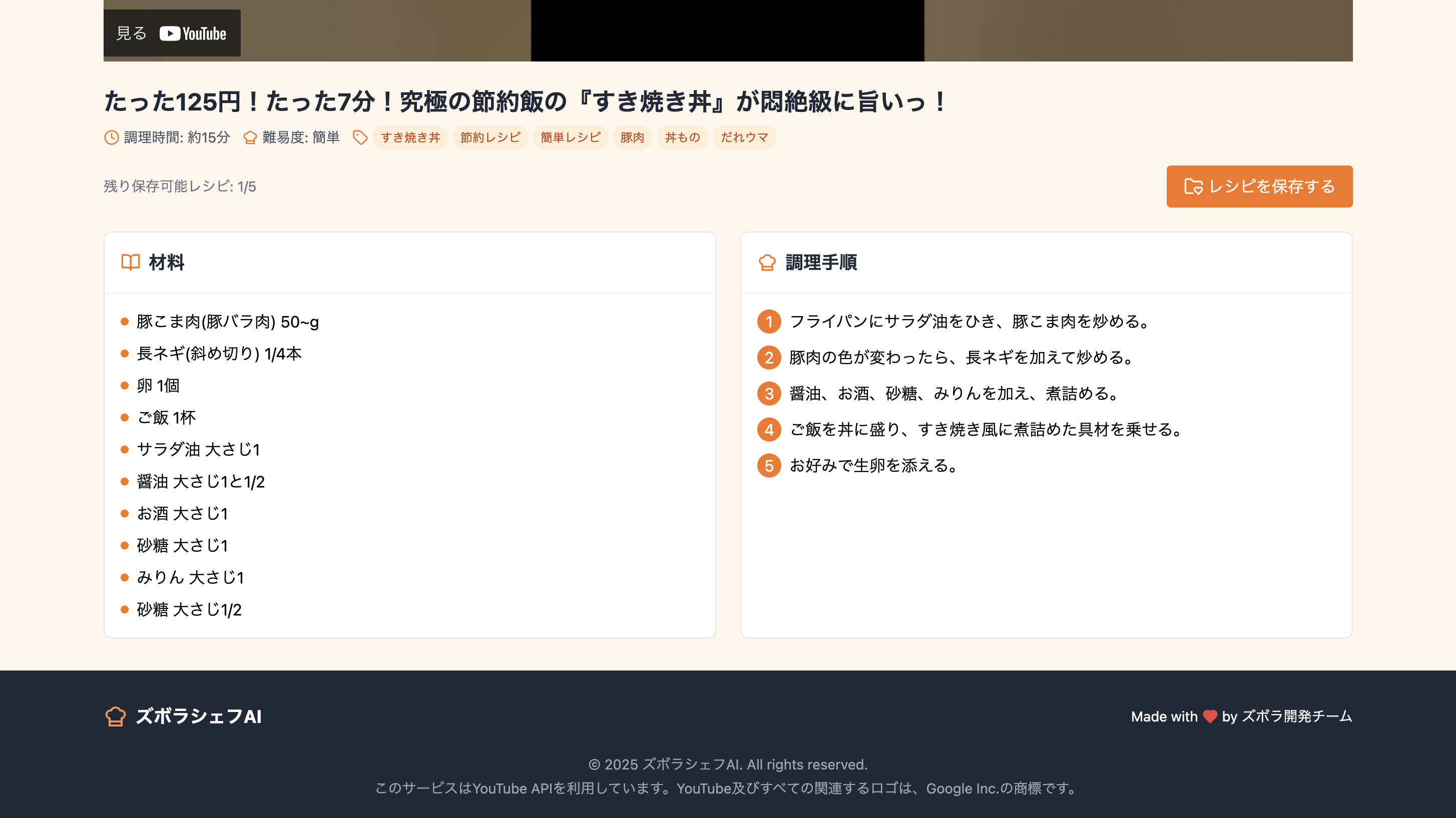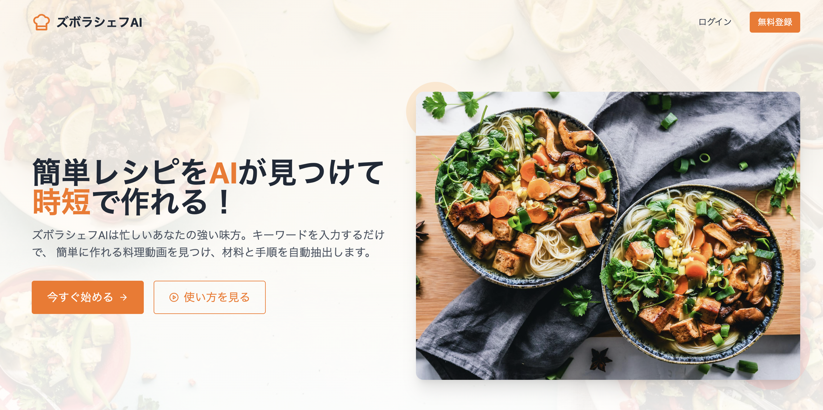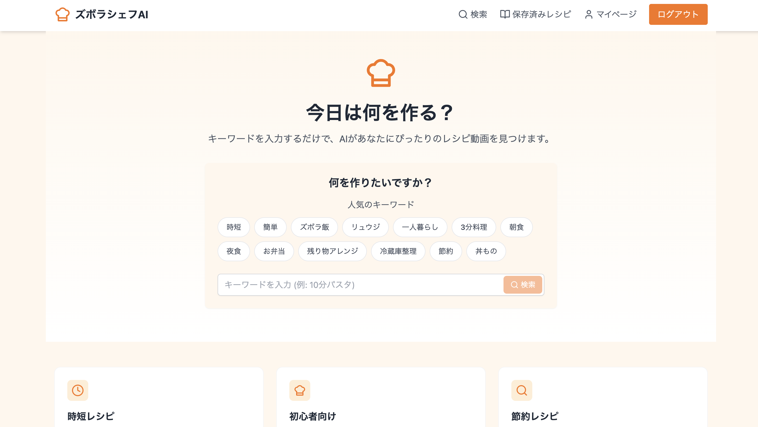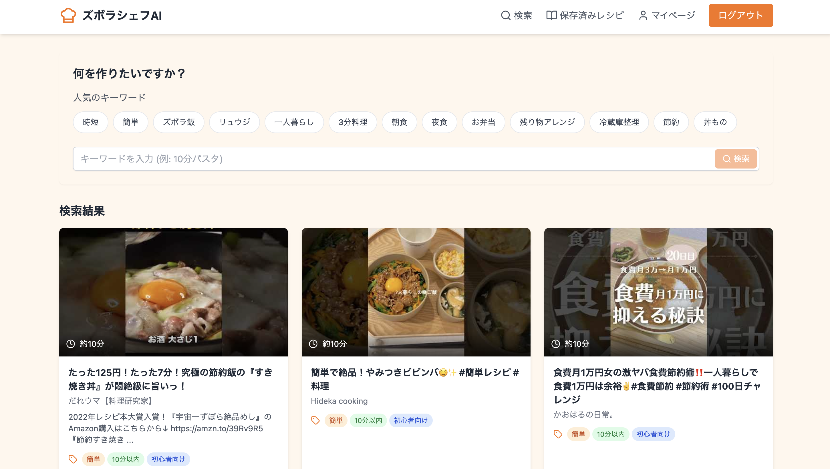 ズボラシェフAIは、YouTubeの料理動画から材料とレシピ手順を自動抽出して、テキスト形式で簡単に閲覧できるウェブサービスです。キーワードを入力するだけで、AIが自動的に関連する料理動画を見つけ、材料リストと調理手順を抽出・整理します。忙しい人や料理初心者でも、動画をいちいち見なくても必要な情報だけをテキストで確認できます。 PWAとして実装されているため、スマホのホーム画面に追加してアプリのように使用できます。インストールの必要がなく、オフライン時でも基本機能が利用可能です。スマホの容量を気にせず、ネイティブアプリと同じような使い心地を実現しています。