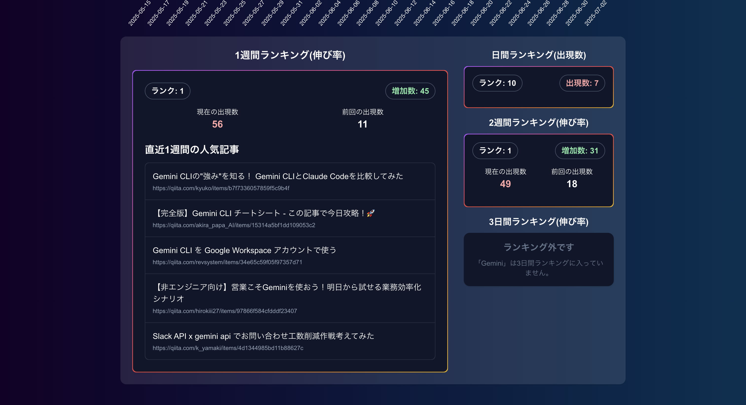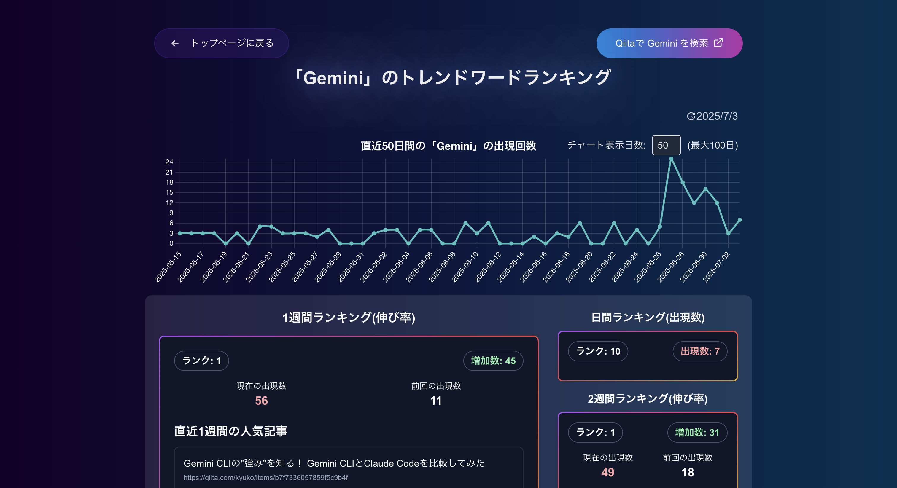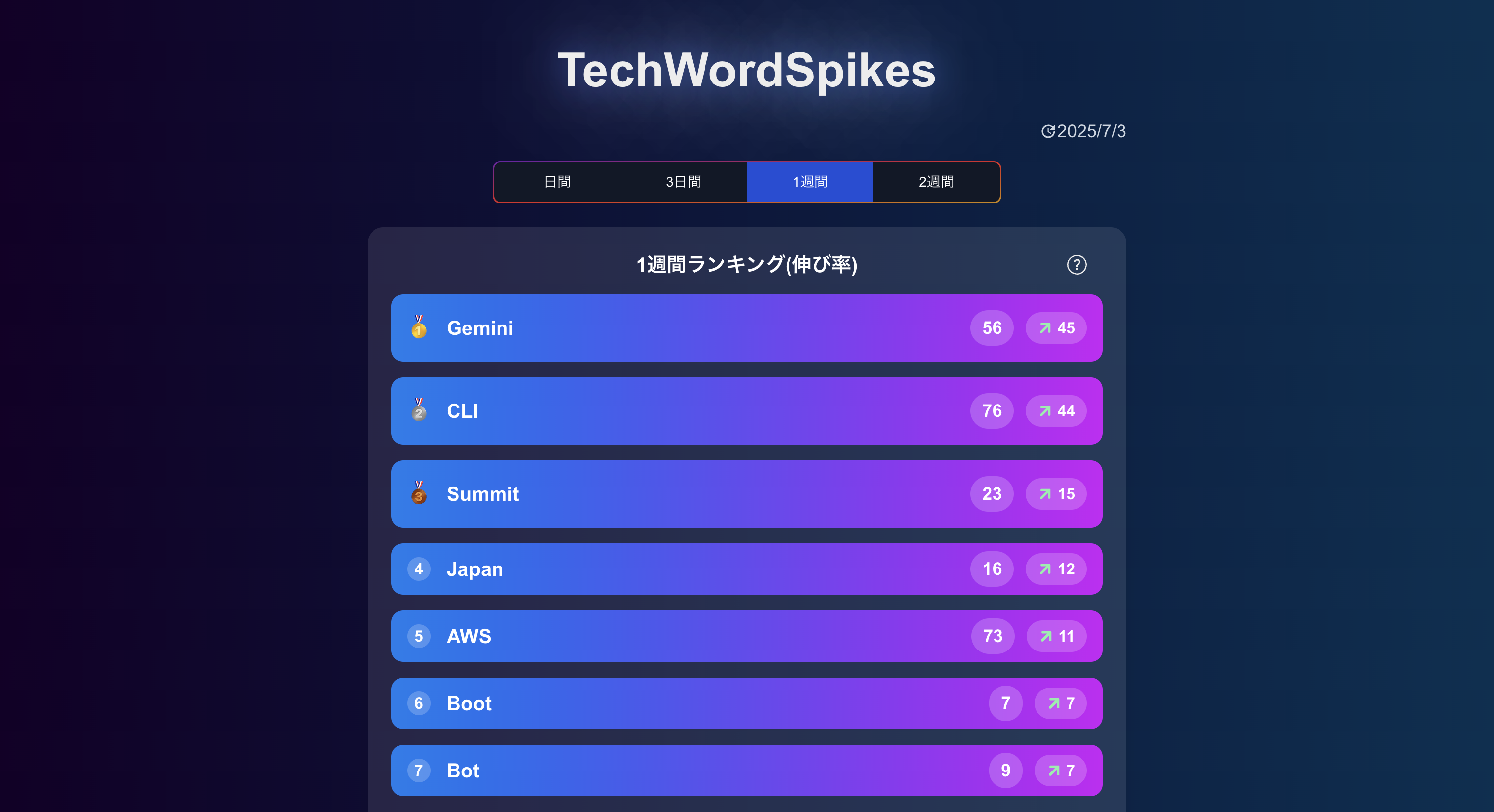 「ITのトレンドって、めまぐるしく移り変わる。特にAI関連なんて、次々に新サービスや新技術が誕生して、追いきれない!」 そんな悩みを持つエンジニアのあなたへ──。 TechWordSpikesは、Qiitaに投稿された記事タイトルをベースに「本当にエンジニアが注目しているキーワード」を抽出し、「伸び率」を見ることで、定番ワードではなく、急上昇中ワードをチェックすることのできるサイトです。 - 流行のITワードがわかる Qiita記事のトレンドワードを分析し、今エンジニアの関心を集めているワードをランキングに。 - “今”を捉える“伸び率ランキング” React/Pythonといった常連ではなく、最近急伸している「Gemini CLI」などの新キーワードを検出。 - 気になったワードはそのまま記事へジャンプ! ワード詳細ページからを人気関連記事やQiita検索画面に移動できます。 - 過去推移をグラフで視覚的に理解 ワードごとの出現回数の過去チャートを用意。最大100日間の折れ線グラフで、ワードの波が一目瞭然。