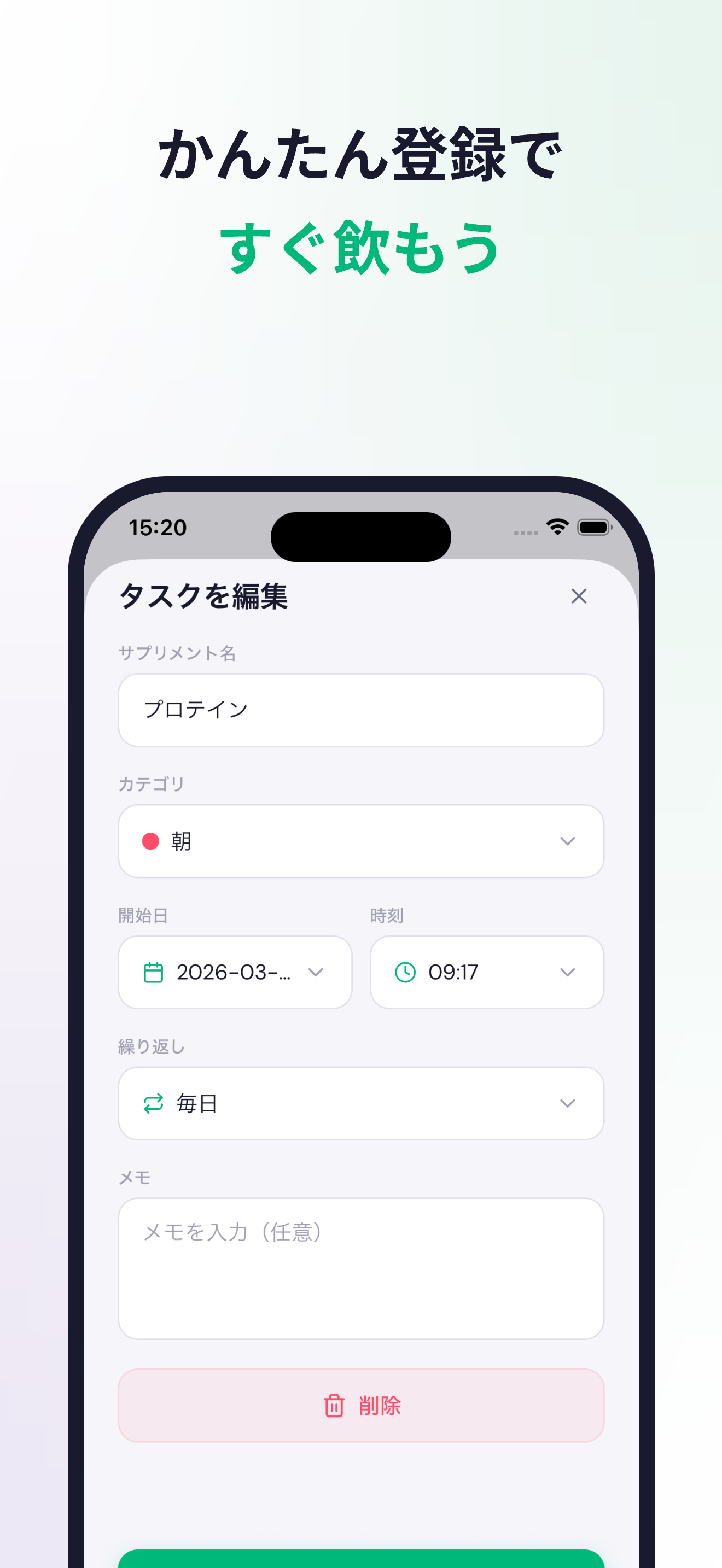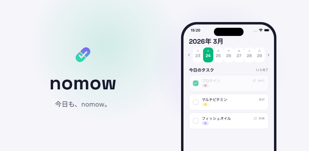 サプリメントや薬の飲み忘れを、もう心配する必要はありません。 nomow(のもう)は、毎日のサプリメントや薬の摂取をシンプルなチェックリストで管理するアプリです。登録不要、完全オフラインで、あなたのプライバシーを守りながら健康習慣をサポートします。 ▼ nomow でできること 【チェックリストで簡単管理】 サプリメントや薬をリストに登録し、毎日チェックするだけ。摂取状況を一目で確認できます。 【飲み忘れ防止の通知機能】 設定した時間にリマインダー通知でお知らせ。飲み忘れを防ぎます。 【カテゴリで整理】 サプリ、薬、ビタミンなどをカテゴリ別にカラーで分類。たくさんの種類も すっきり管理できます。 【繰り返し設定】 毎日、毎週、特定の曜日など、柔軟な繰り返しスケジュールに対応。 【完全オフライン・プライバシー重視】 すべてのデータはお使いの端末にのみ保存。サーバーへの送信は一切ありません。アカウント登録も不要です。 【8言語対応】 日本語、English、中文、한국어、Español、Français、Deutsch、Português に対応。 ▼ こんな方におすすめ ・複数のサプリメントを飲んでいる方 ・薬の飲み忘れが多い方 ・健康習慣を始めたい方 ・プライバシーを重視する方 ・シンプルな管理アプリを探している方 ▼ 料金 基本無料。すべての機能を無料でお使いいただけます。 プレミアム(¥500 買い切り)で広告を非表示にできます。