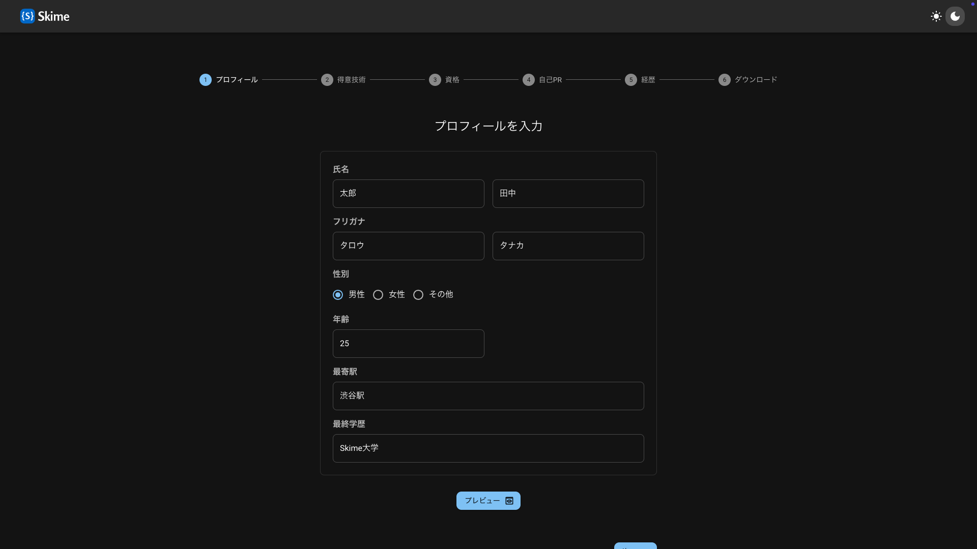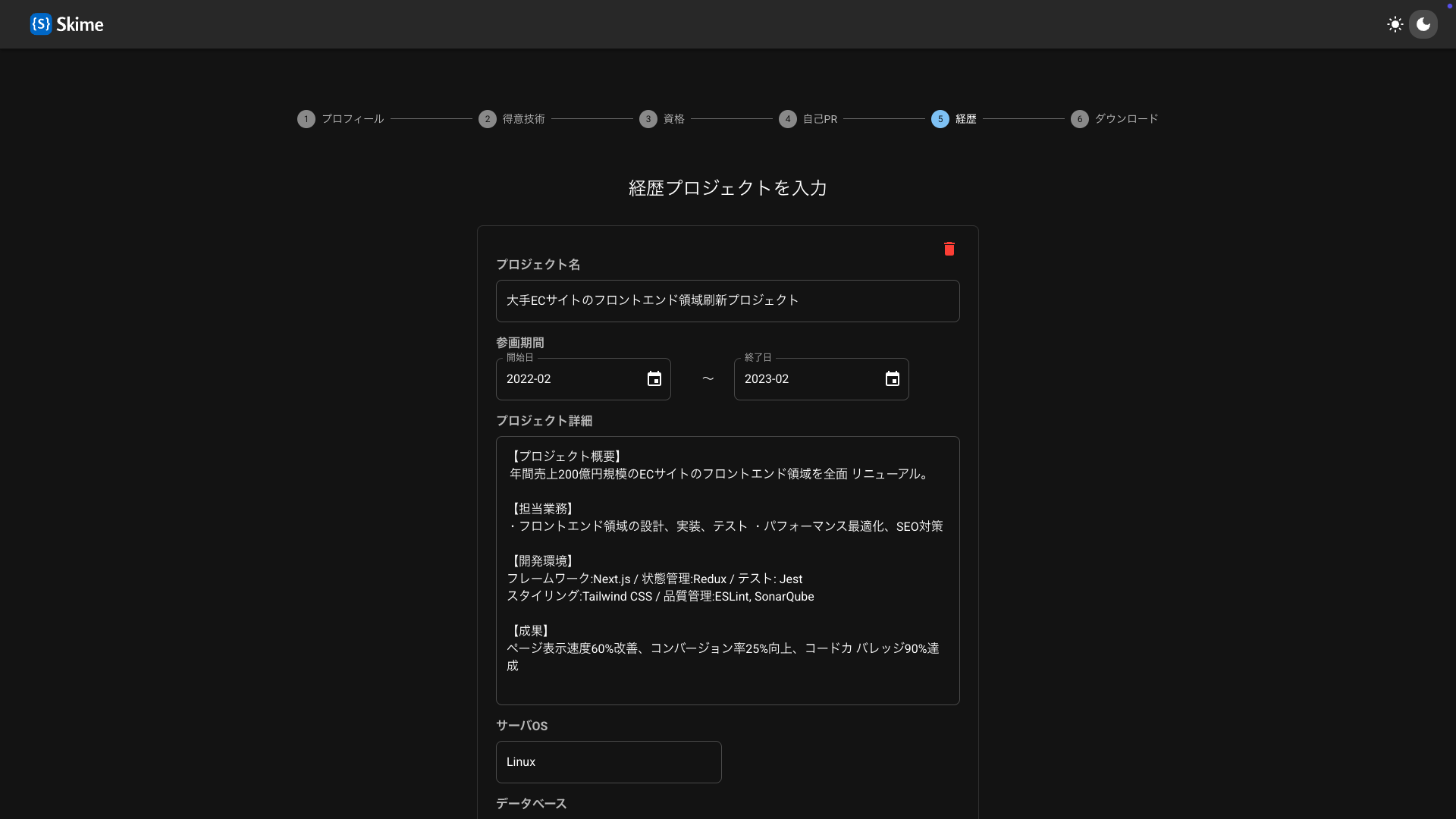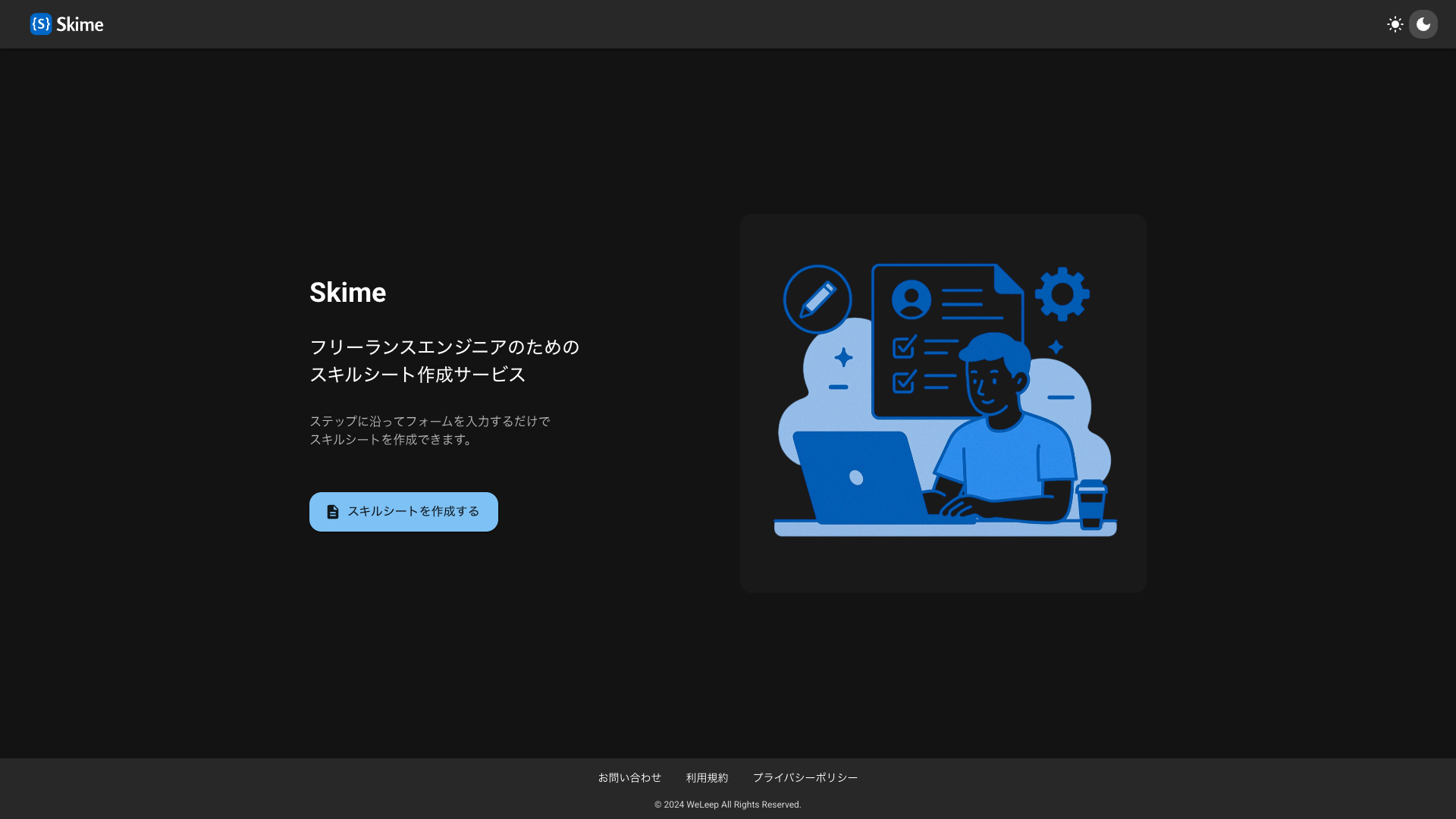 Skimeは現役のフリーランスエンジニアが作った、フリーランスエンジニアのためのスキルシート作成ツールです🚀 ステップに沿ってフォームを入力するだけで、質のいいスキルシートを簡単に作成できます。 出力は Excel(スプレッドシート)形式 に対応しています。