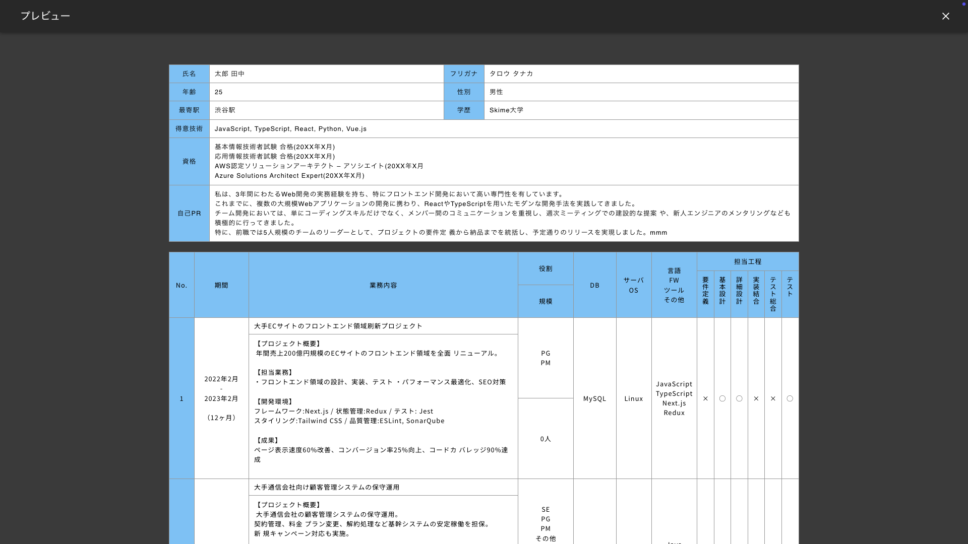 フリーランスエンジニア向けのフォーム入力でスキルシートを作成できるサービスです。