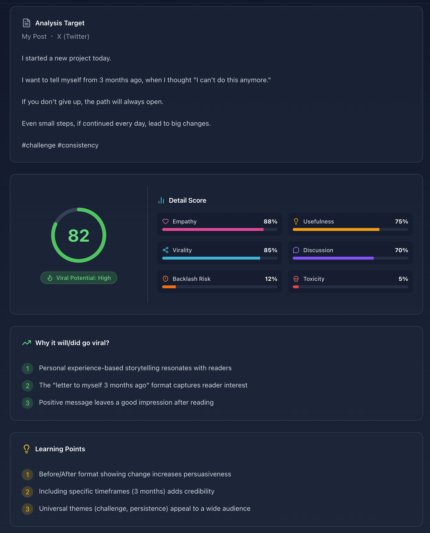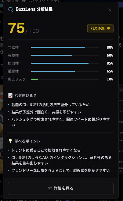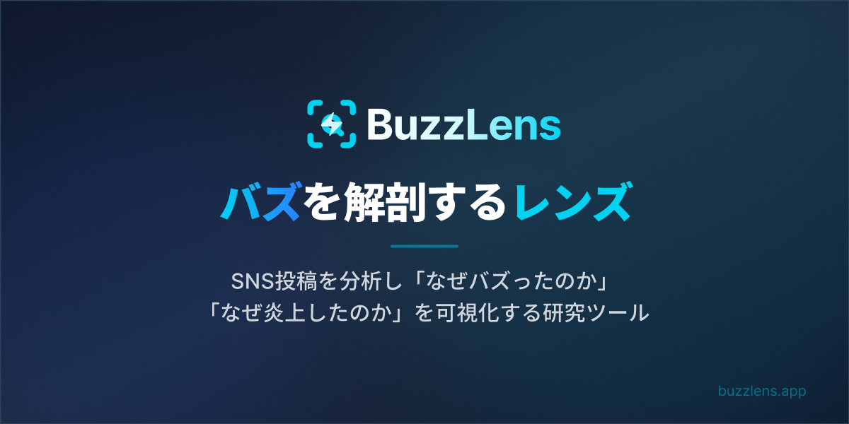 BuzzLensは、SNS投稿を分析してバズる理由を解明するAIツールです。 Twitter/Xの投稿を6つの指標(共感性・有益性・拡散性・議論喚起・炎上リスク・毒性)でスコアリング。 主な機能: • バズスコア(0-100)を即座に算出 • 成功する理由トップ3をAI解説 • 投稿のリライト候補を自動生成 • Chrome拡張機能で即座に分析 Gemini 2.0とClaude AIを搭載。無料プランあり。
