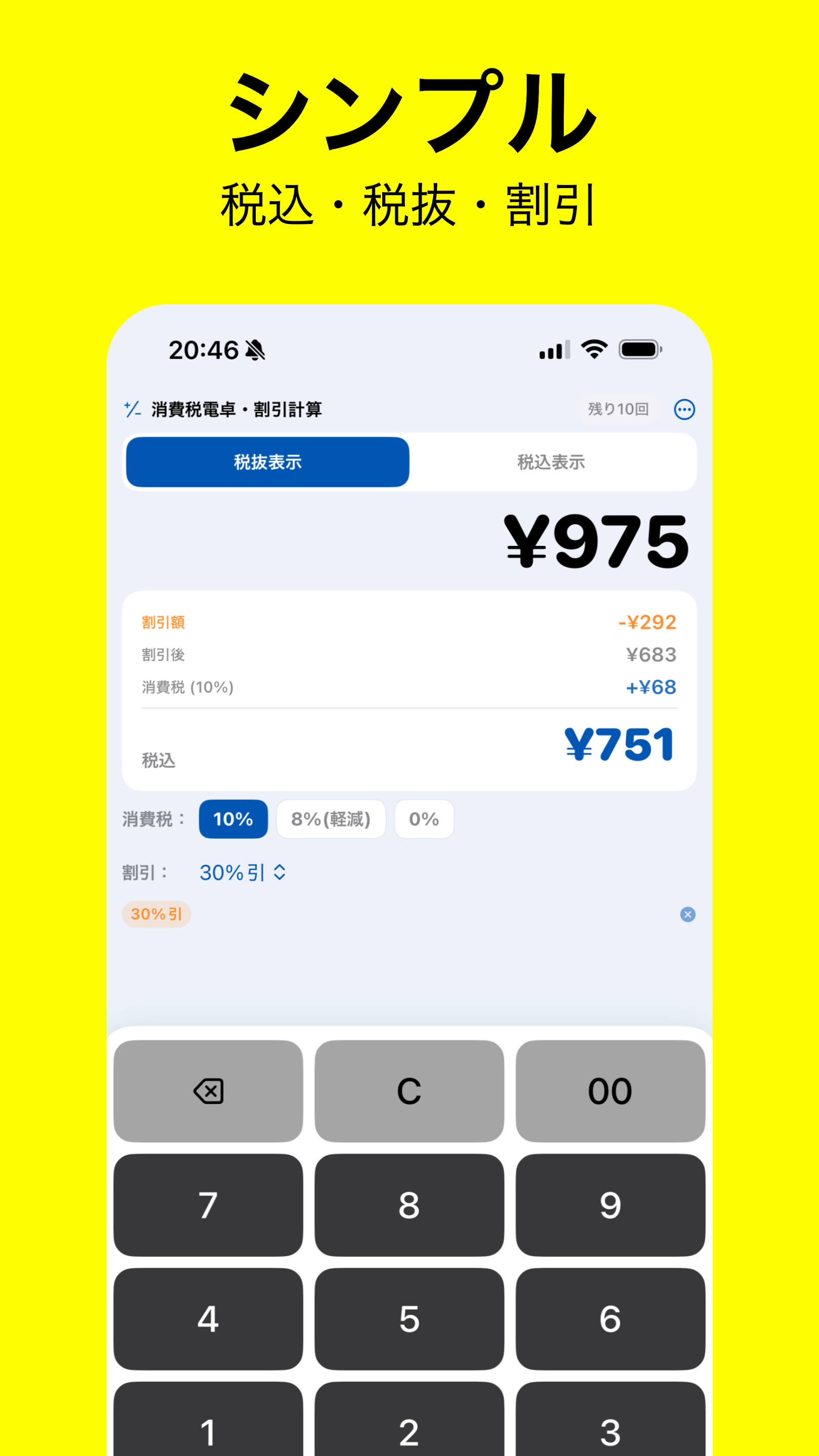 価格を入力するだけで、消費税額と税込価格、割引価格を瞬時に表示。