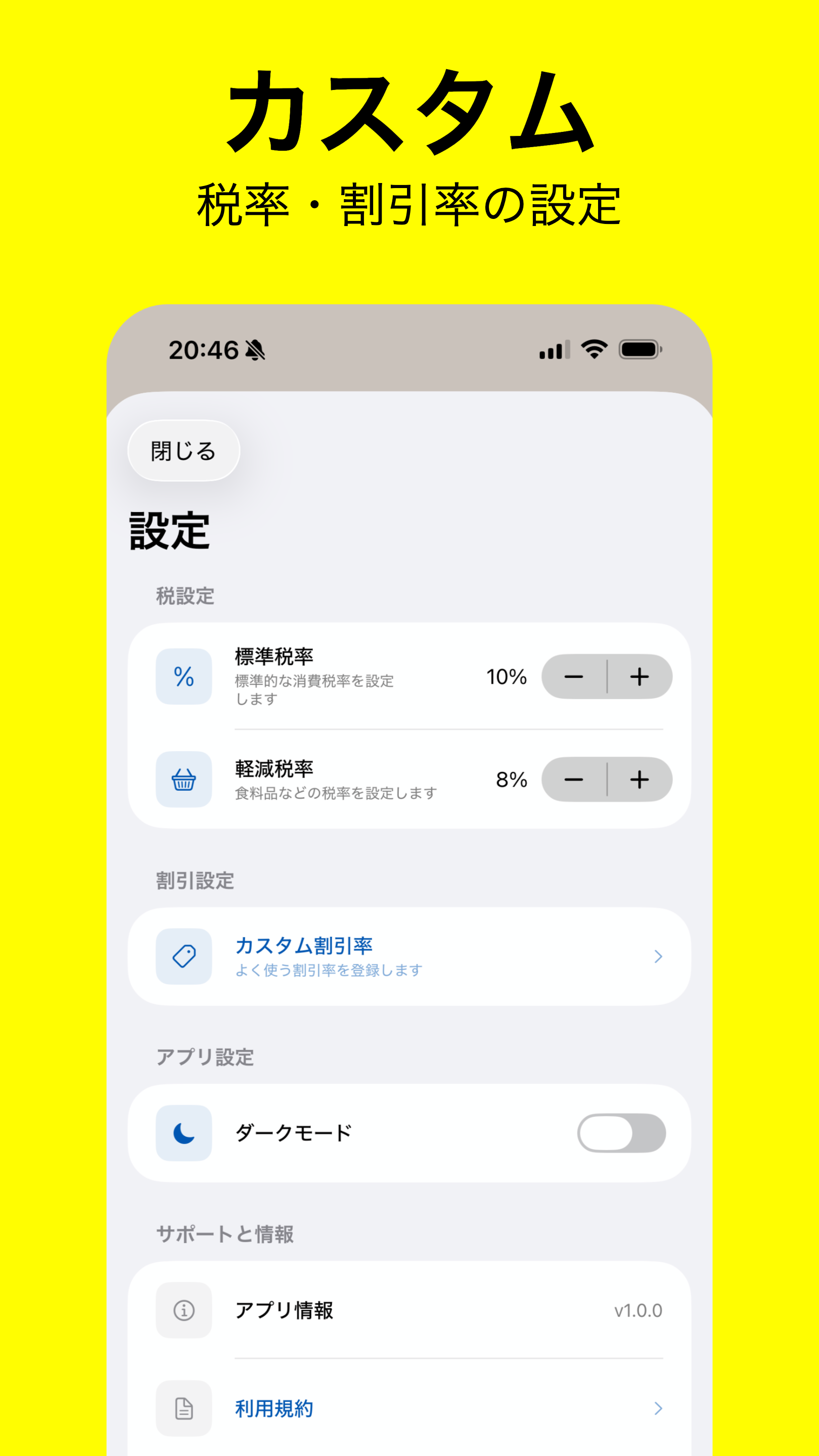 消費税電卓・割引計算は、スーパーや小売店で働くスタッフのために開発されたシンプルな税込計算アプリです。 ■ 主な機能 【消費税計算】 ・標準税率(10%)と軽減税率(8%)に対応 ・税抜→税込、税込→税抜の双方向計算 ・端数は切り捨て処理で正確な計算 【割引計算】 ・5%〜50%の割引率をワンタップで設定 ・割引後の金額に消費税を自動計算 ・割引額も一目で確認 【計算履歴】 ・計算結果を自動保存 ・過去の計算をいつでも確認