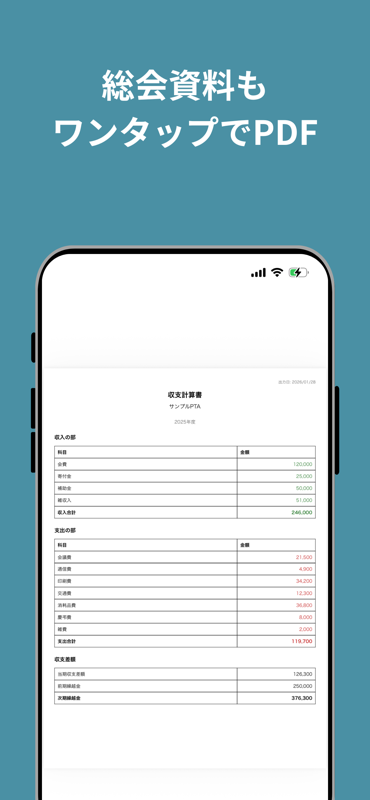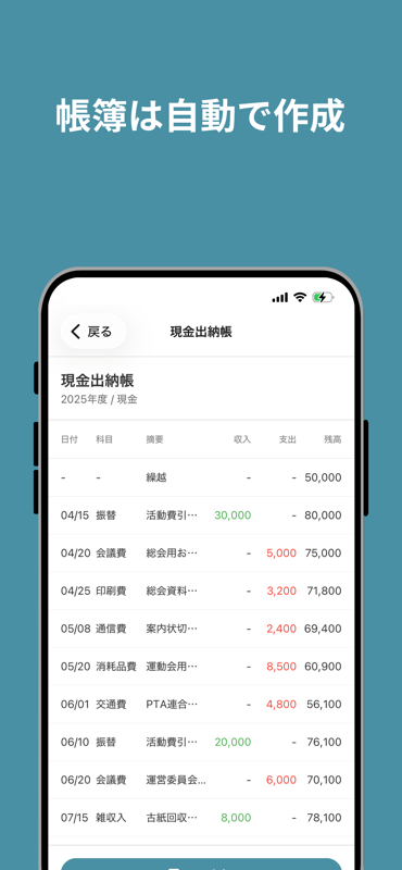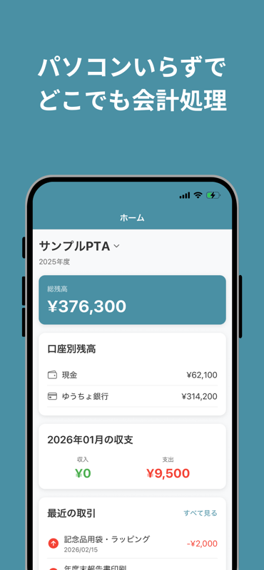 PTAや町内会の会計係、もう悩まない。PCいらず、スマホだけで収支入力から帳簿作成、決算報告書まで完結。引き継ぎもラクラク。無料で始められる団体会計アプリ