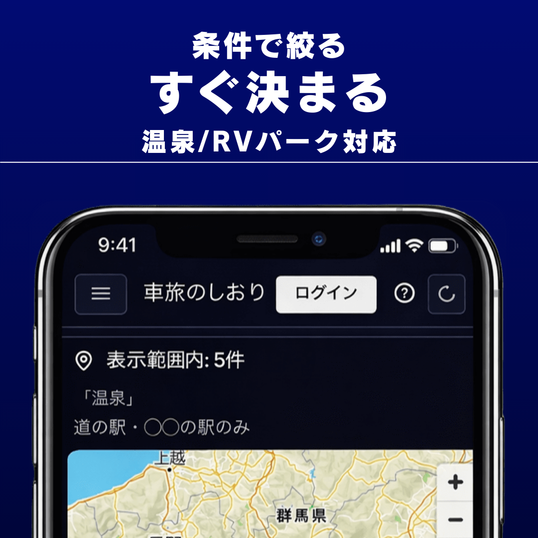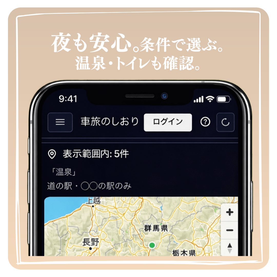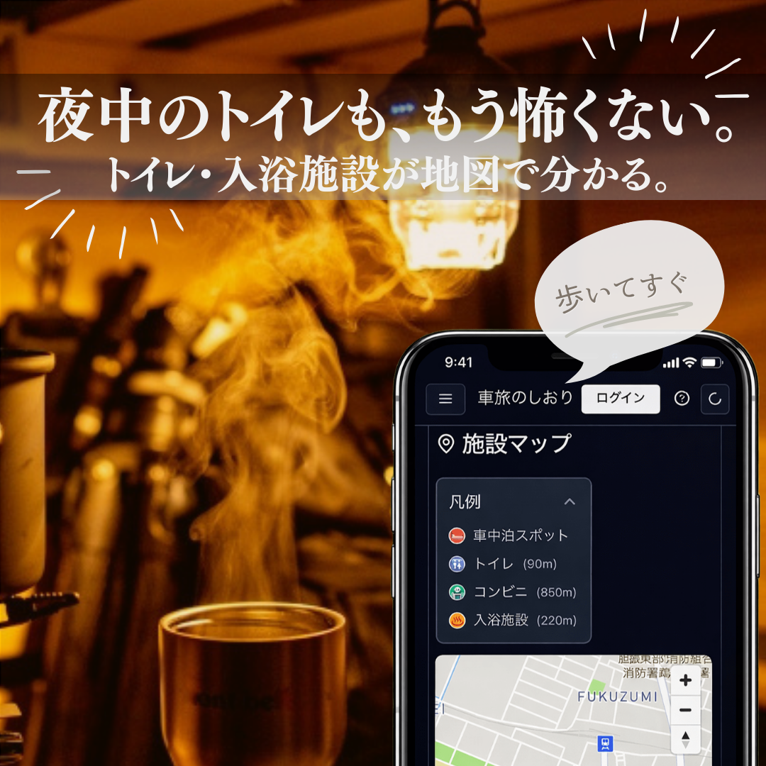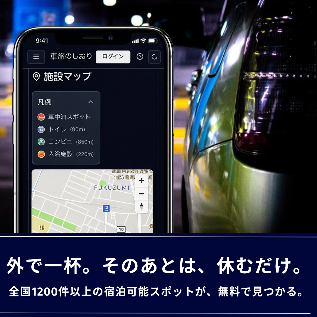 旅行計画の作成から実施までをサポートするウェブアプリケーションです。 Google Maps 連携により効率的な旅程管理を実現し、カーナビゲーション(Android Auto・Apple CarPlay)との連携を前提に設計されています。 全国の車中泊スポット情報(トイレ・入浴施設、安全性、静けさなど)を地図で検索でき、気になるスポットは旅程に直接追加可能。 ユーザー投稿機能により、コミュニティで情報を共有できます。
