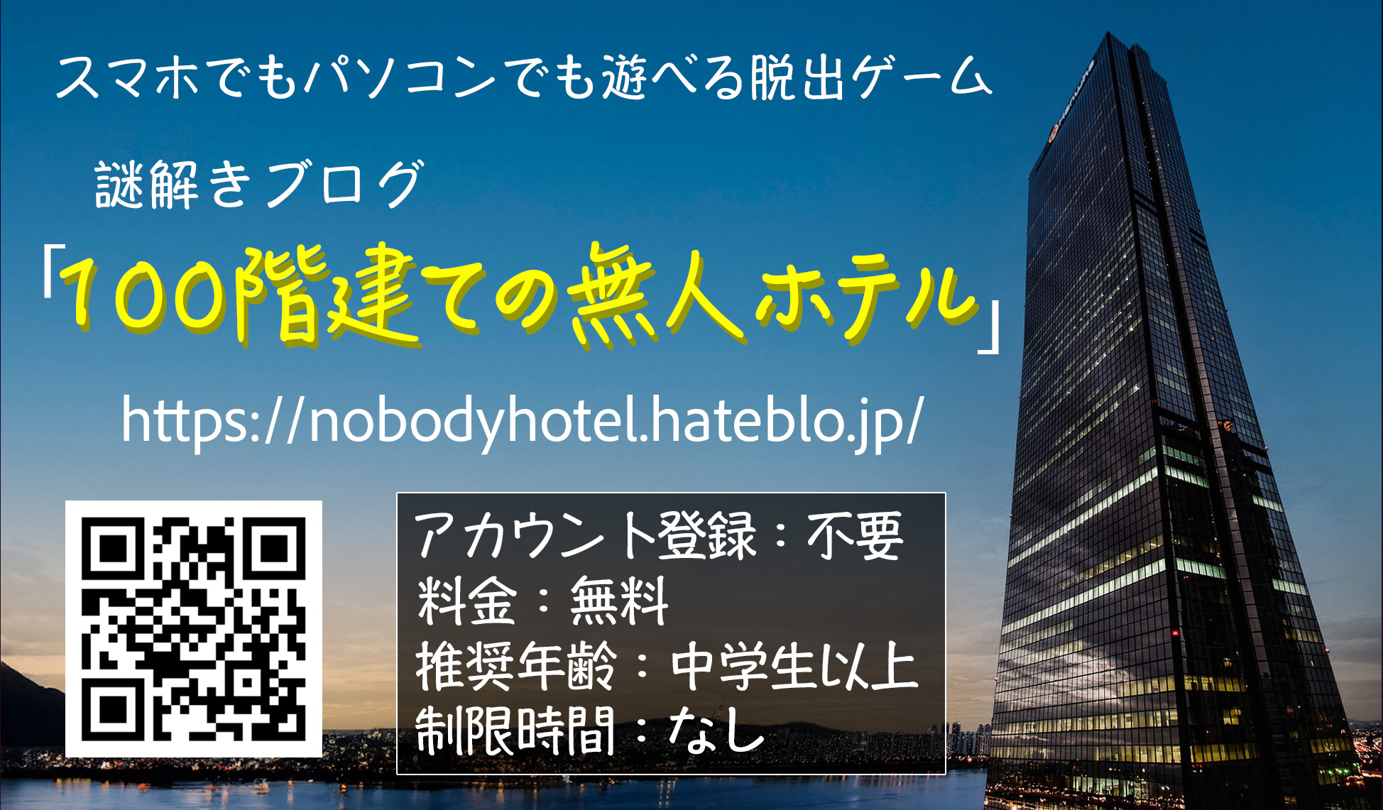 リアル脱出ゲームの面白さが誰でも味わえるよう ブログ上に投稿した各記事をゲームブックのようにリンクでつなげ、 ホテル内を探索しながら謎解きが楽しめるようにした無料サイトです。 ブログなのでページをまたぐ形で変数が持ち越せないのが厄介ですが、 そのあたりも支障が出ないよう工夫しています。 逆に、最近のブログはレスポンシブデザインのため、 スマホでもタブレットでもパソコンでもブラウザさえあれば遊べます。 プレイの過程で入手できるPDF形式の用紙データは 印刷した方が作業しやすいですが、 スクリーンショットを撮ってデバイス上で書き込んだり 記入したい内容だけ適当な紙にメモしても大丈夫です。