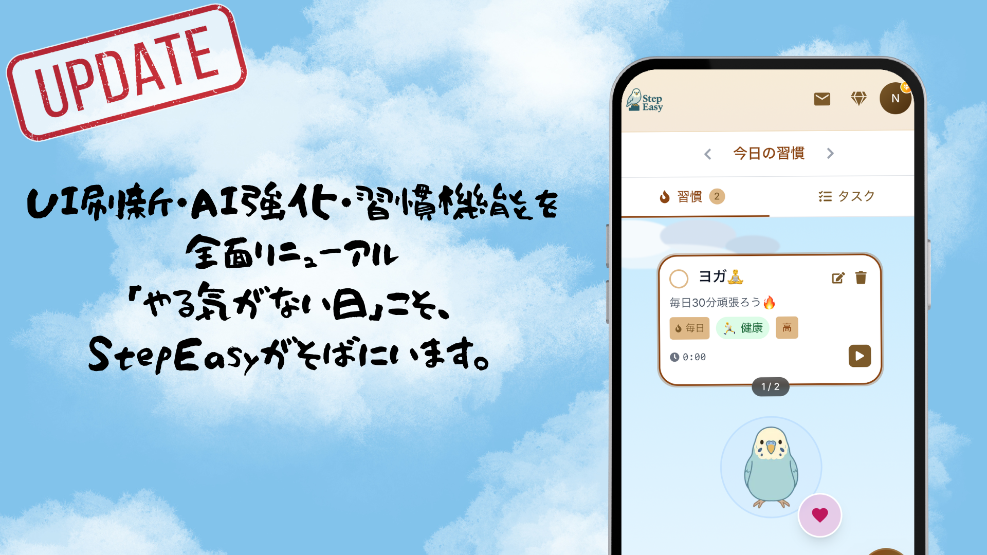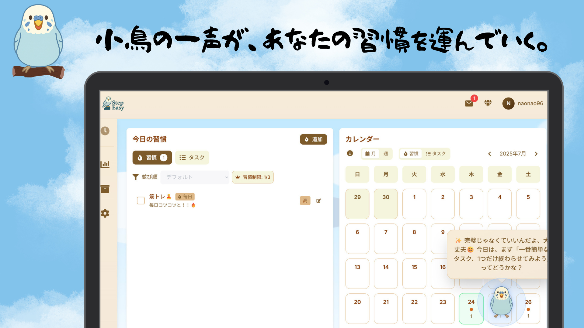 🕊️StepEasy とは 朝、小鳥のひと言に背中を押される── StepEasy は “変わりたい” 気持ちをやさしく支える 習慣 & タスク管理 Web アプリ です。 🗝 主要機能 1. 毎朝 9 時、あなた専用の小鳥が応援メッセージをお届け 2. タスク & 習慣の 継続日数・曜日傾向を自動で可視化 3. 達成も休憩も肯定する “やさしい継続体験” を提供 🧑🏫 こんな人におすすめ • タスクより 自分の気持ち を大切にしたい • 生活リズムを整え、習慣を育てたい • 急がず 自分のペース で小さな変化を積み重ねたい 1 日続けば、それはもう変化の始まり。 まずは 、「ゲストモード」で、登録なしのやさしい体験をどうぞ。