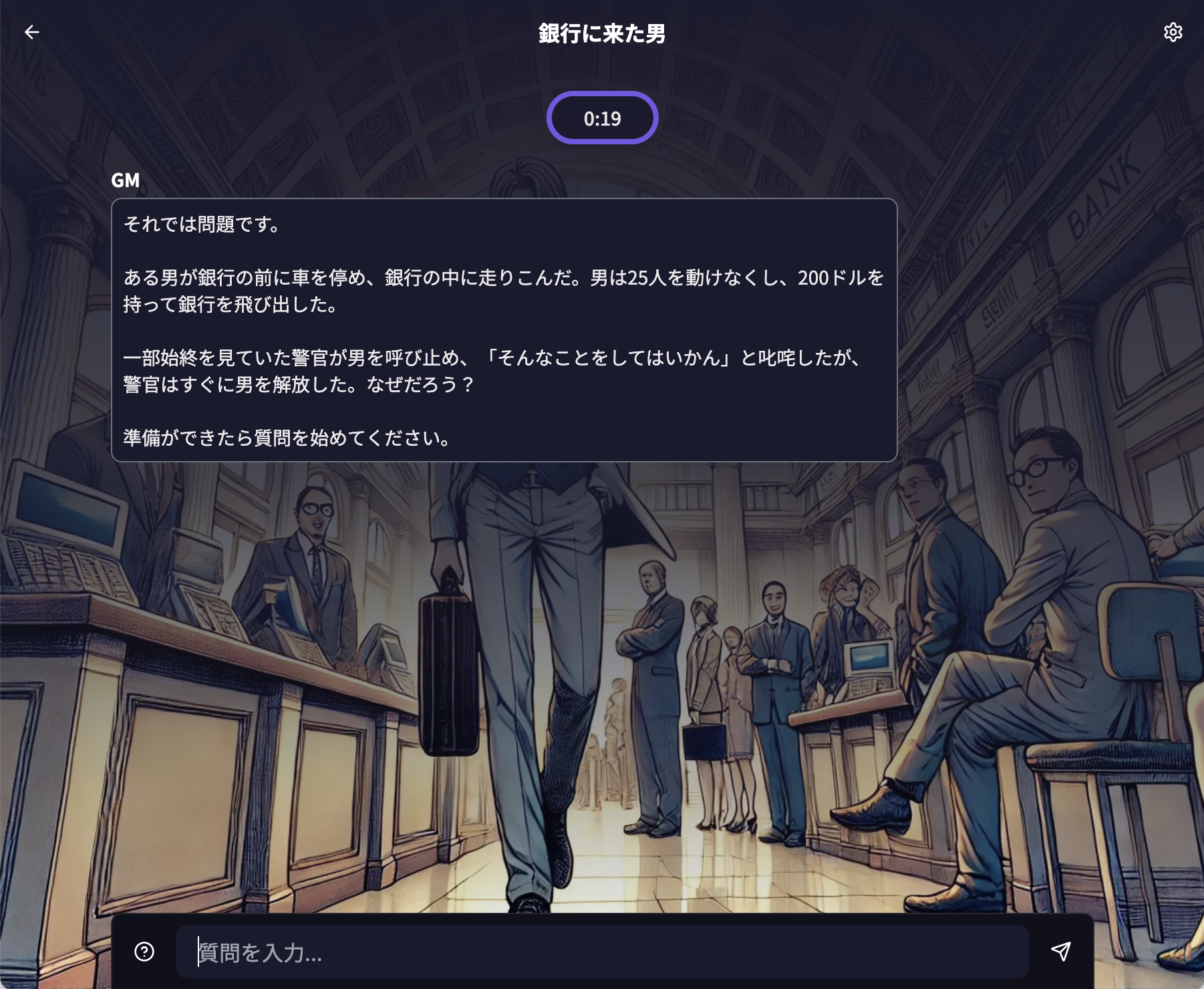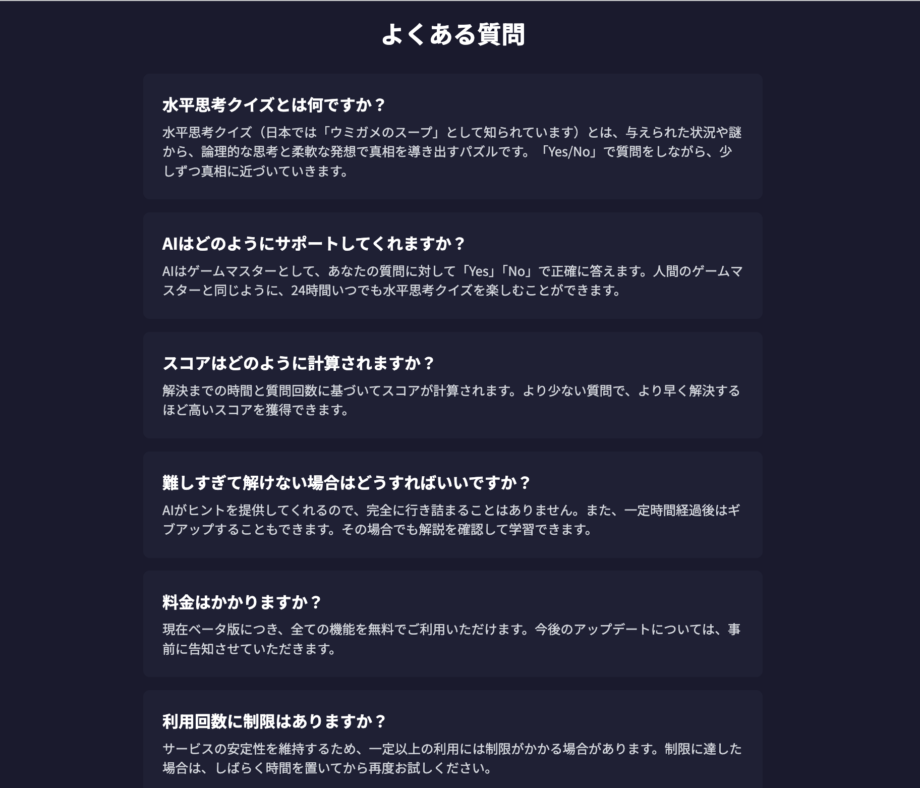 AIがゲームマスターとなって水平思考クイズを出題します。いつでも好きな時に、何度でも新しい謎解きに挑戦できます。