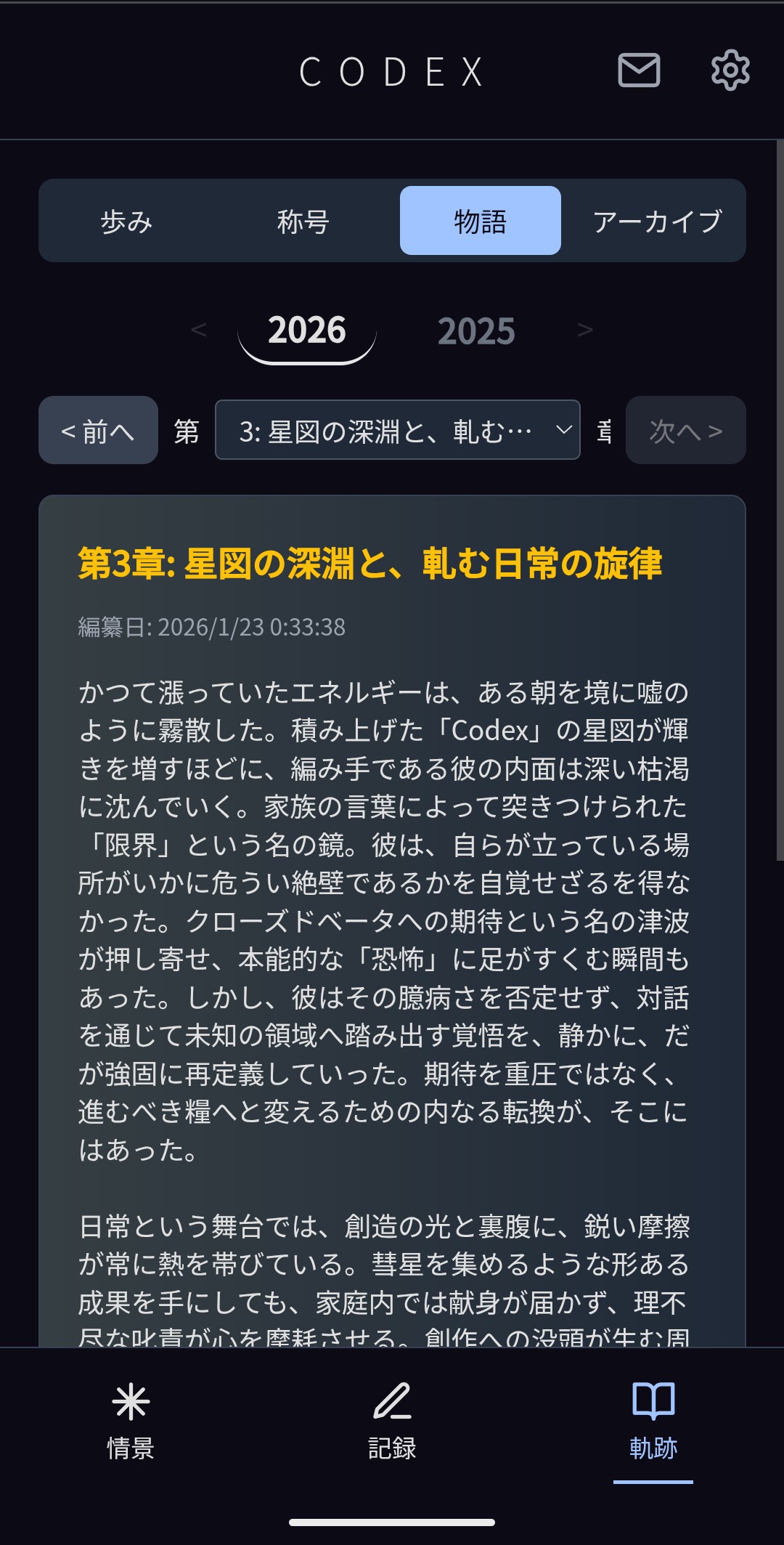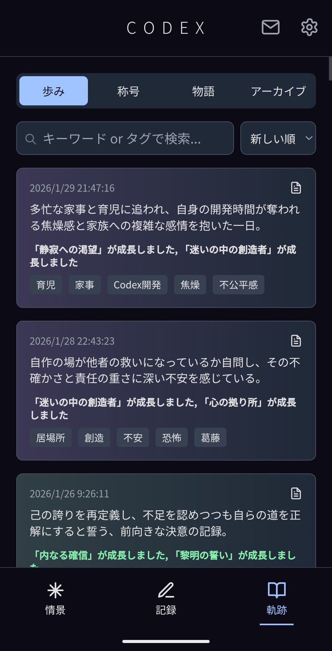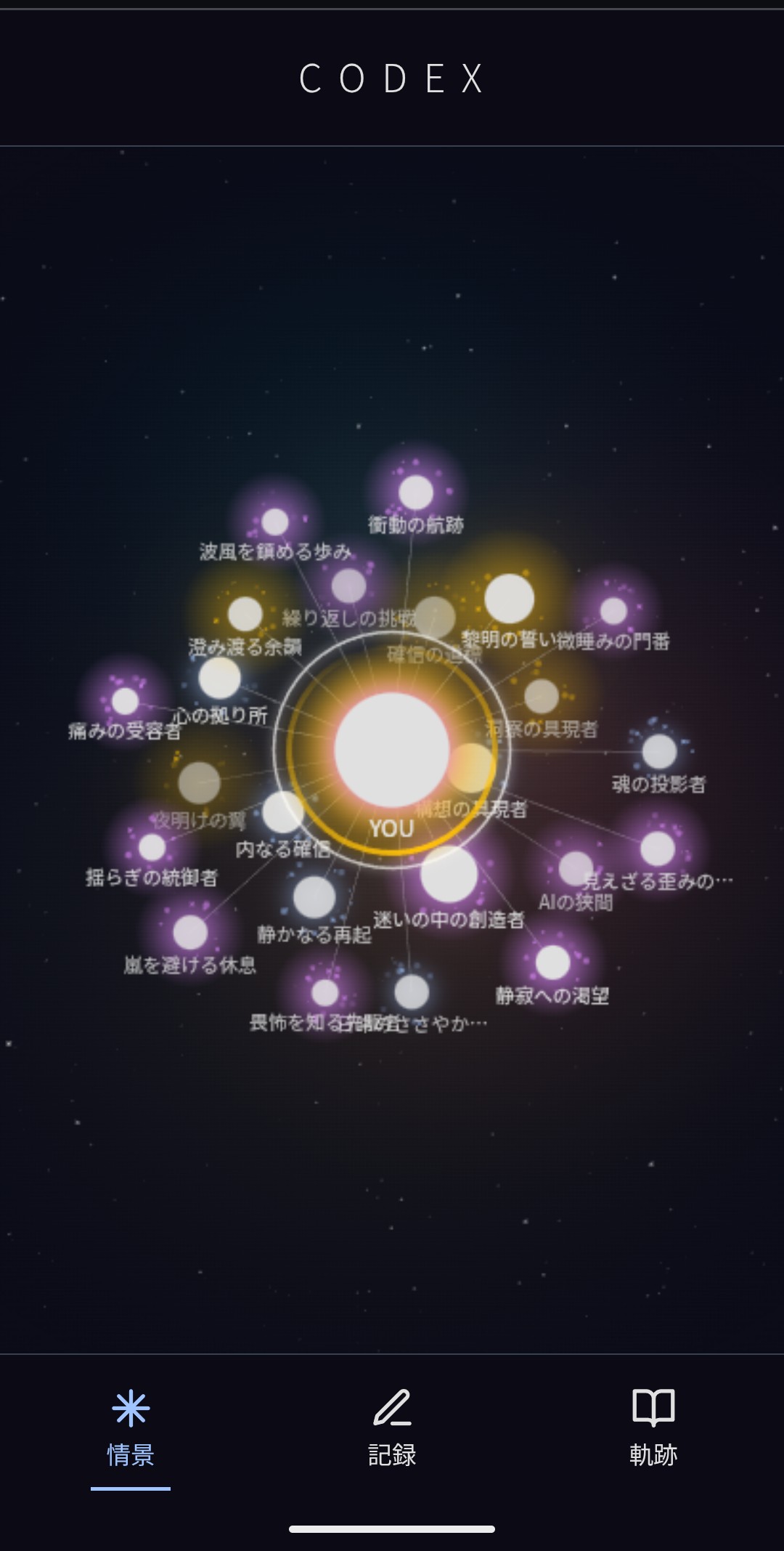 忘れたくない出来事、誰にも吐き出せない悩み。書くとAIがそっと星に変えます。 何気ない日常に、栞を挟むような体験を。 ここには、他人のキラキラしたタイムラインも、急かすような通知もありません。あるのは、あなただけの静かな「星空」だけです。 【Codexができること】 ・独り言を「星」にする 誰にも言えない言葉を書き込むと、光の粒が集まって一つの「星」が生まれます。 ・AIは「執筆家」 AIはあなたを評価しません。その代わり、あなたの日常に『荒波での航海』や『賑やかな食卓』といった名前(タイトル)をつけてくれます。 ・人生を小説のように読む 溜まった記録は、週に一度、AIが「あなたを主人公にした物語」として紡ぎ直します。自分の人生を、第三者の視点で小説のように読む体験です。 【Codexにできないこと】 ・「いいね」はもらえません。 人と関われません。暇つぶしにはなりません。 ・悩みは解決できません。 AIはアドバイスもしないし、共感もしません。ただ言葉を黙って受け取り記すだけです。 SNSの喧騒に疲れたとき、ふらっと立ち寄って、星を眺めてください。
