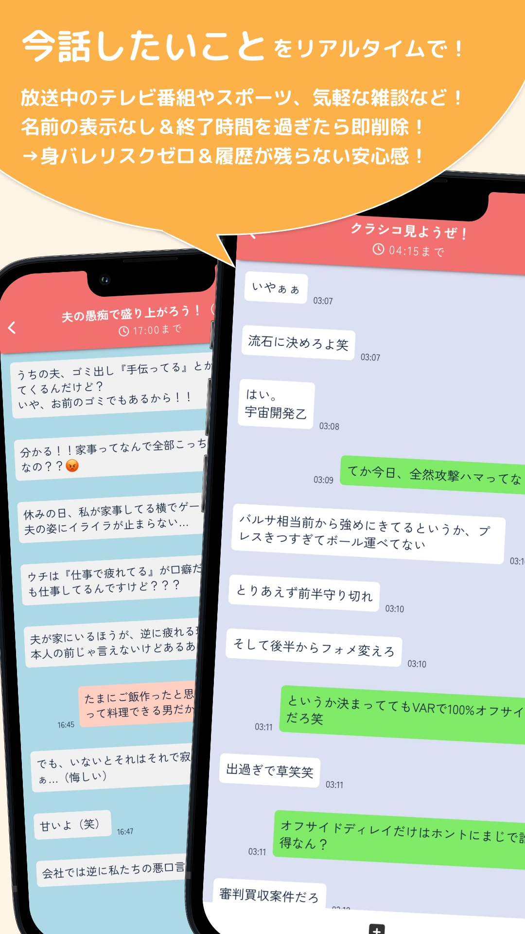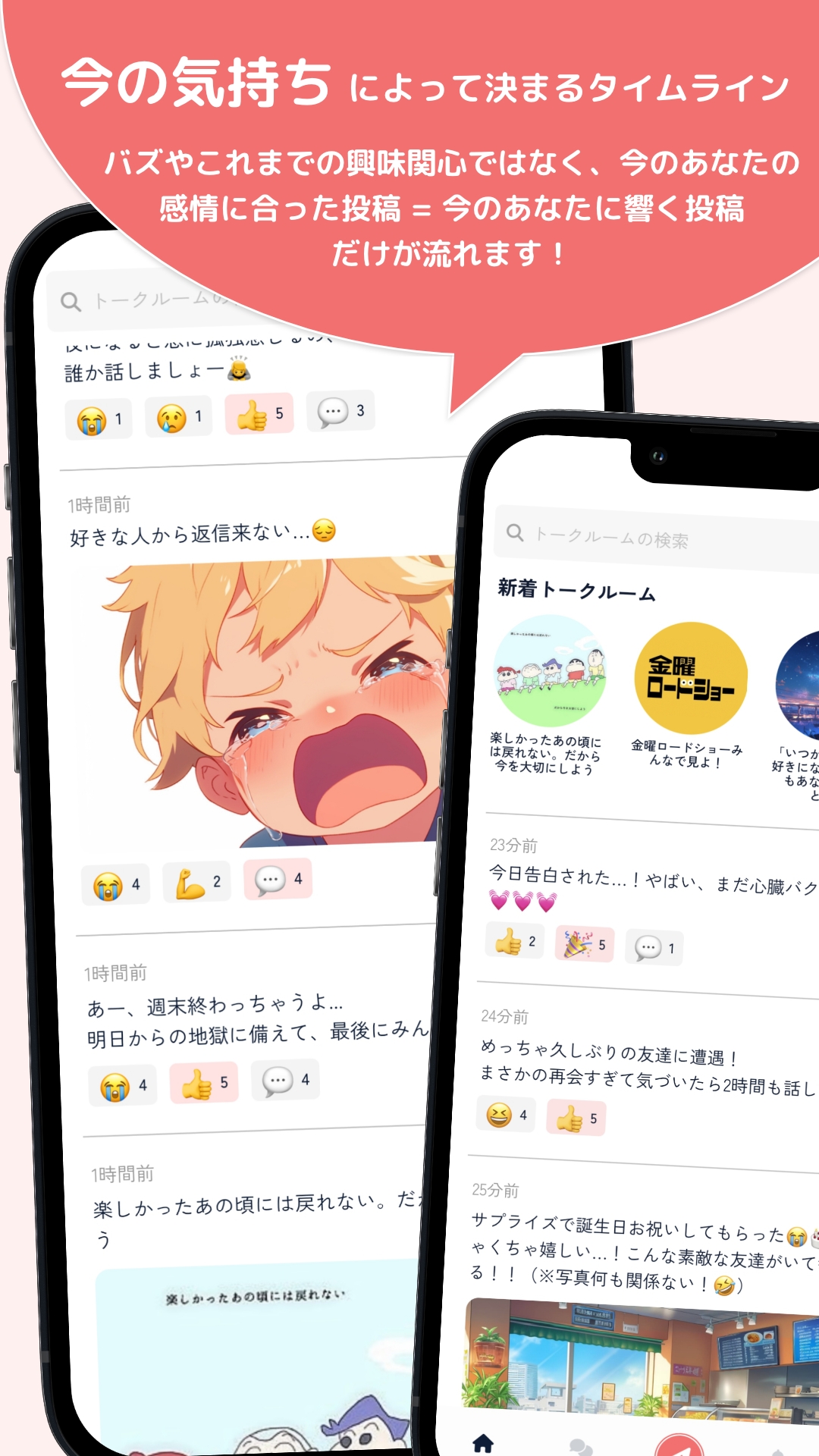 イマトモは、「今この瞬間の感情」や「今話したいこと」が同じ人同士でつながるSNSです。 バズやフォロー機能、過去のデータによるパーソナライズはなく、固有の友達もできません。 その瞬間の気分や感情によって、「その場限りの気軽なつながり」を繰り返すので、「今だけの友達」= イマトモという名前にしました。 「タイムライン」→ 今の感情に合わせた投稿が流れる 「トークルーム」→ 今話したいことをリアルタイムで話せる の2軸で構成。 身バレなく気軽に投稿・会話したい人に使って欲しいサービスです。