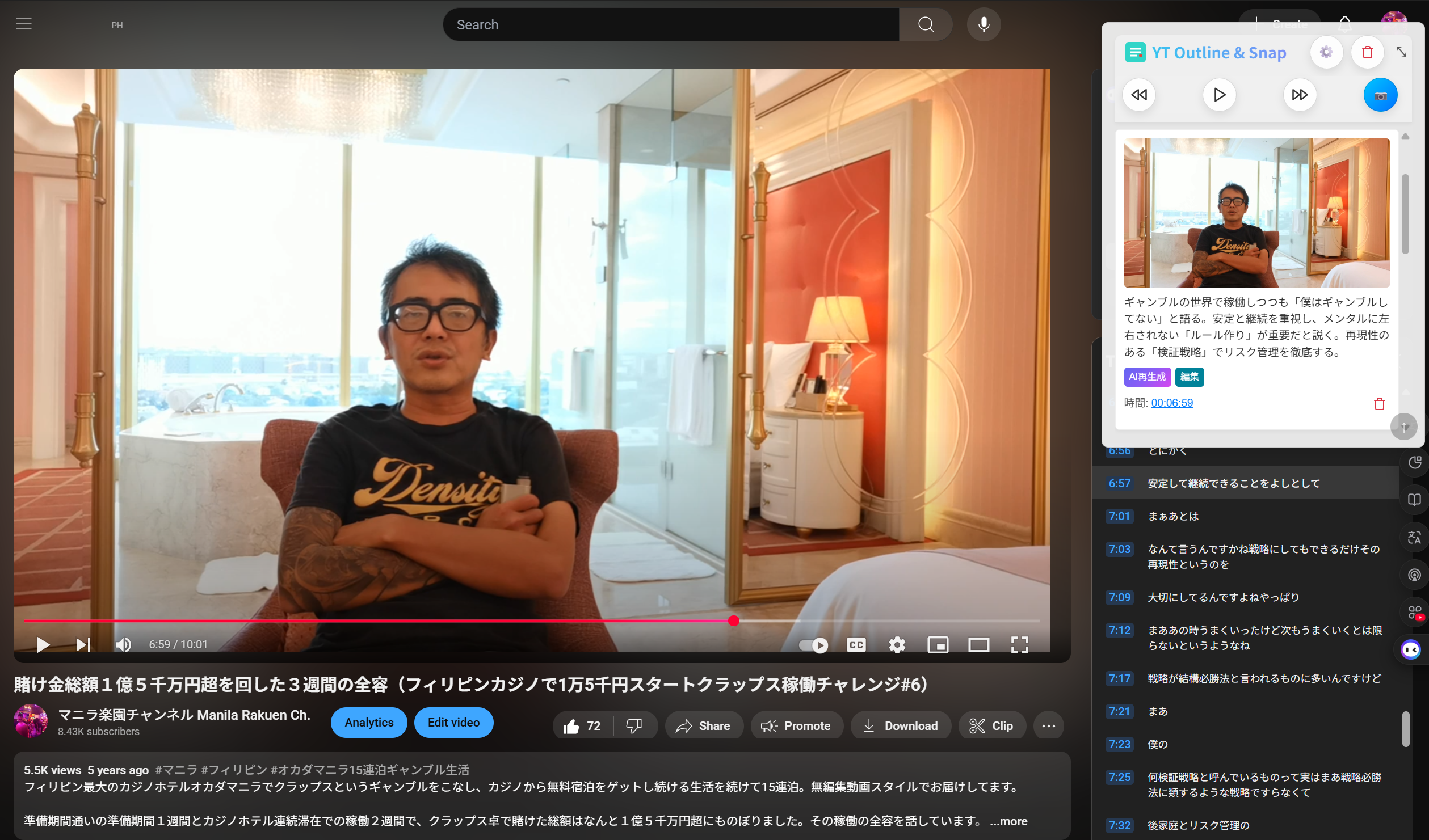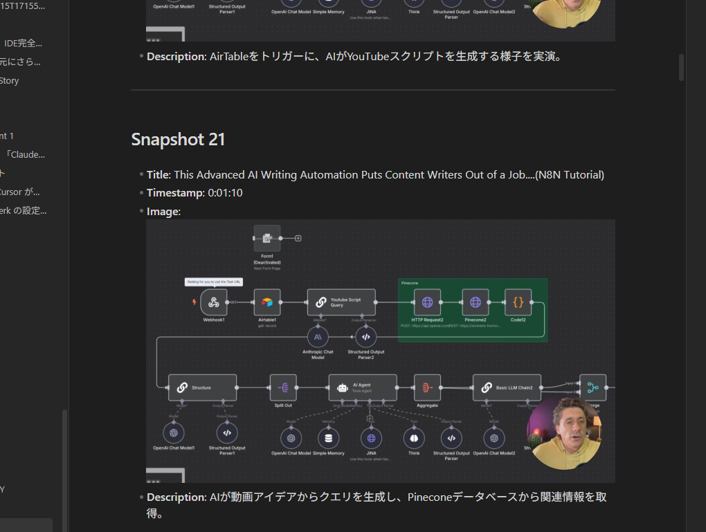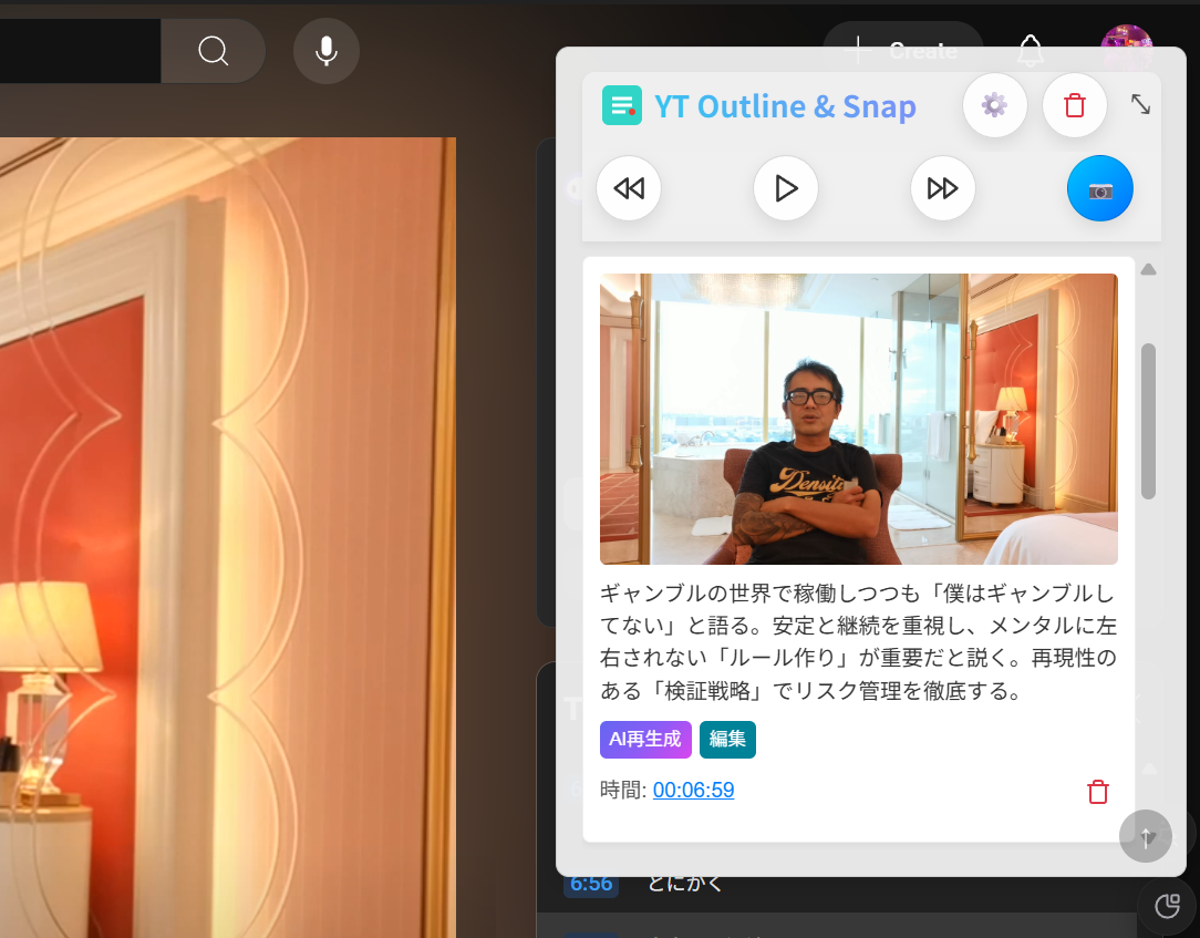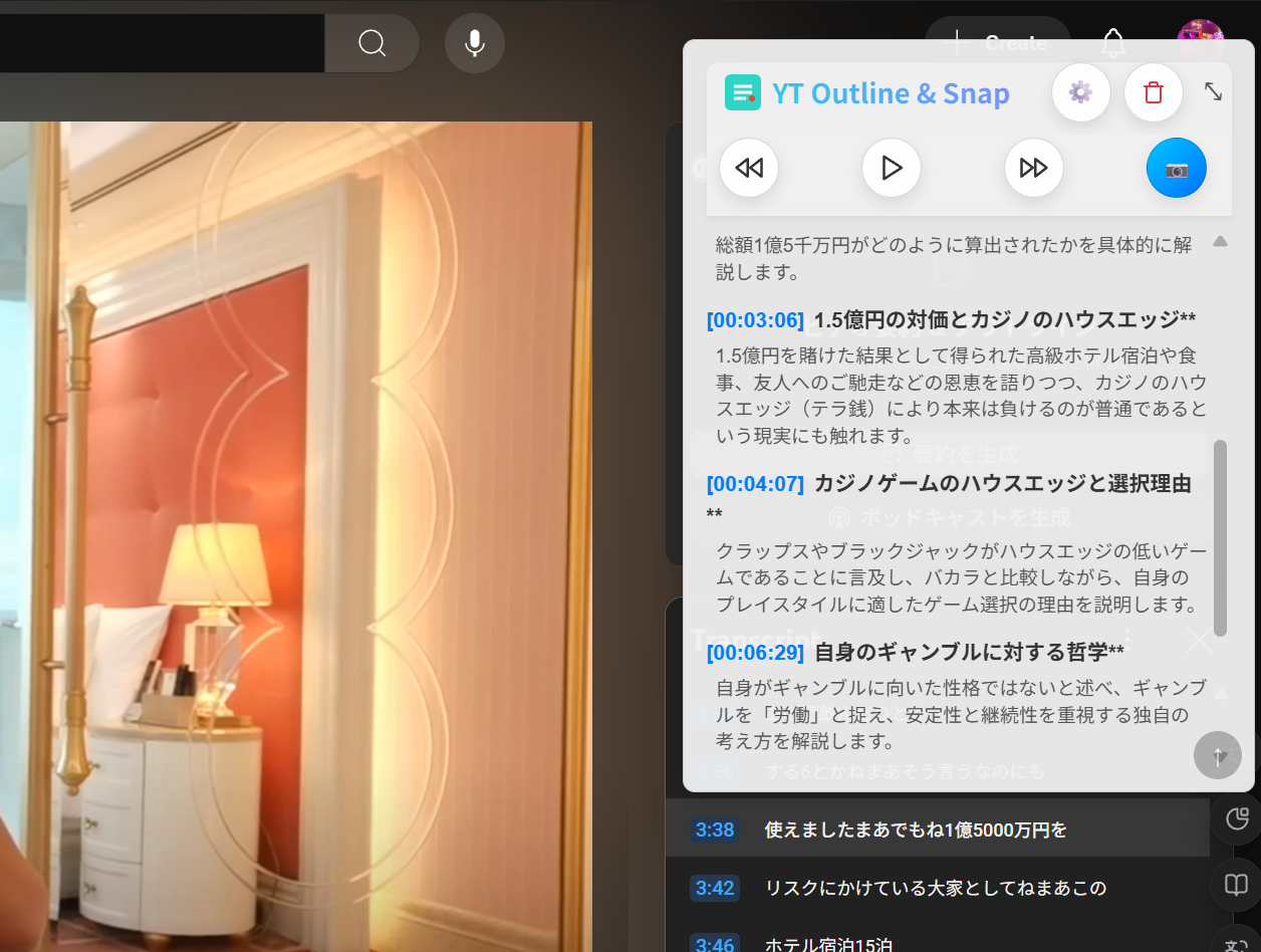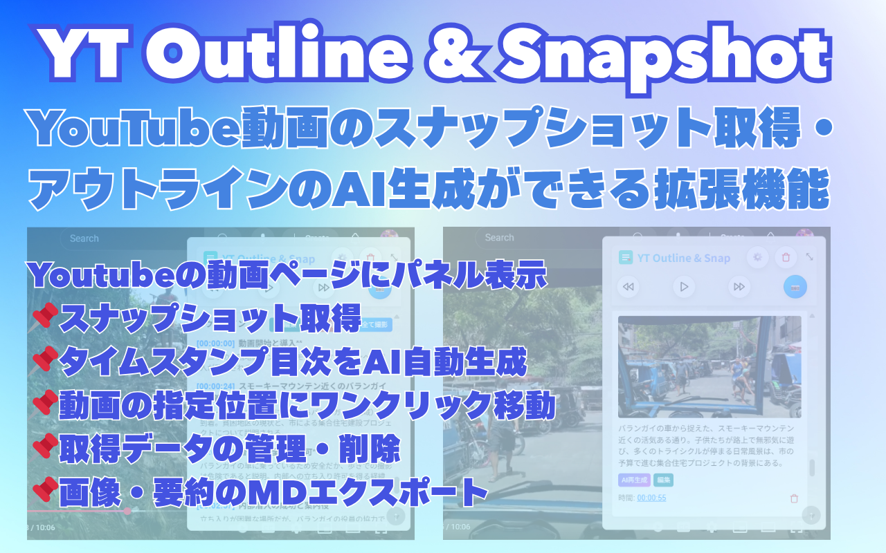 YouTube動画を視聴しながら、重要なポイントをスナップショットとして保存し、AIによる動画のアウトラインを自動生成できるChrome拡張機能です。