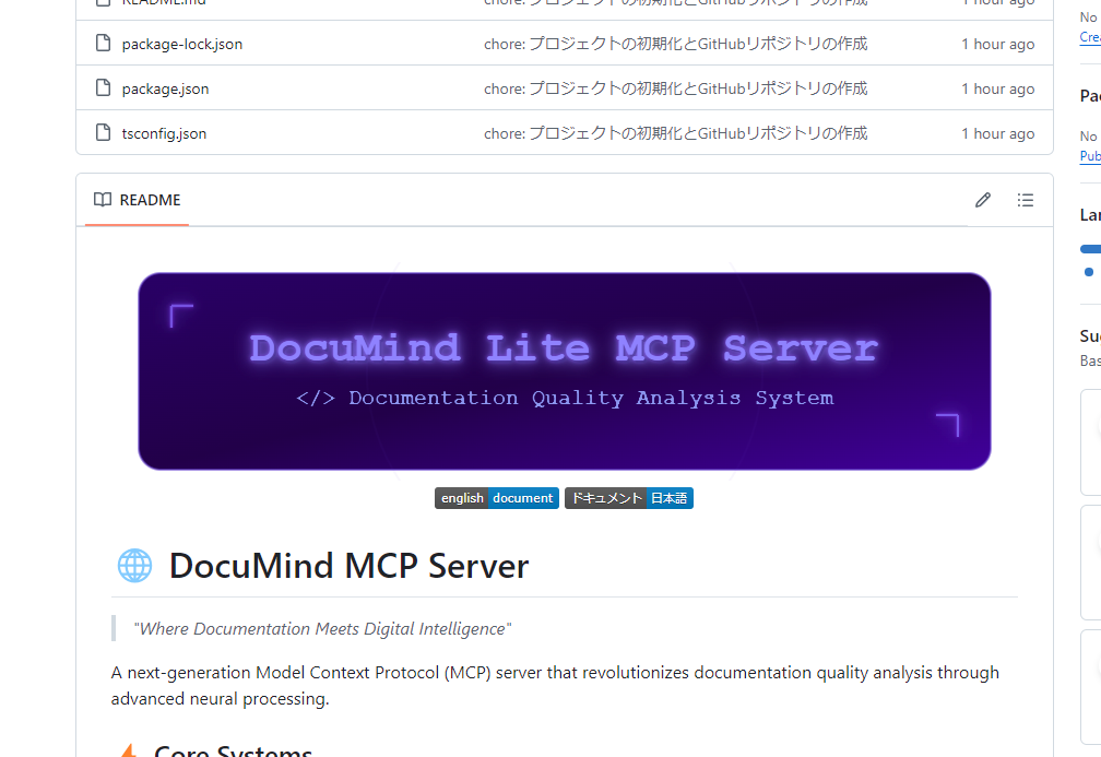 DocuMind MCP Serverは、開発チームのドキュメント品質を自動的に向上させる文書分析システムです。READMEなどの技術文書を分析し、具体的な改善点を提案します。 主な機能: - ドキュメントの構造、完成度、読みやすさをスコアリング - 画像、コードブロック、バッジなどの技術文書の要素を自動チェック - 日本語・英語の多言語ドキュメントの一貫性を検証 - 具体的な改善提案(例:「目次の追加」「コード例の補完」など) Node.js 18+で簡単に導入でき、GitHubのプロジェクトに組み込んで継続的なドキュメント品質の維持を実現できます。MITライセンスで提供される、開発チーム向けの実用的な文書品質管理ツールです。