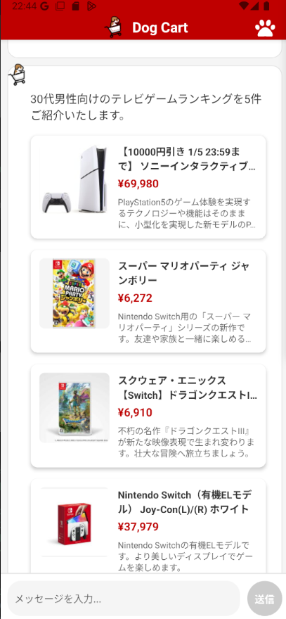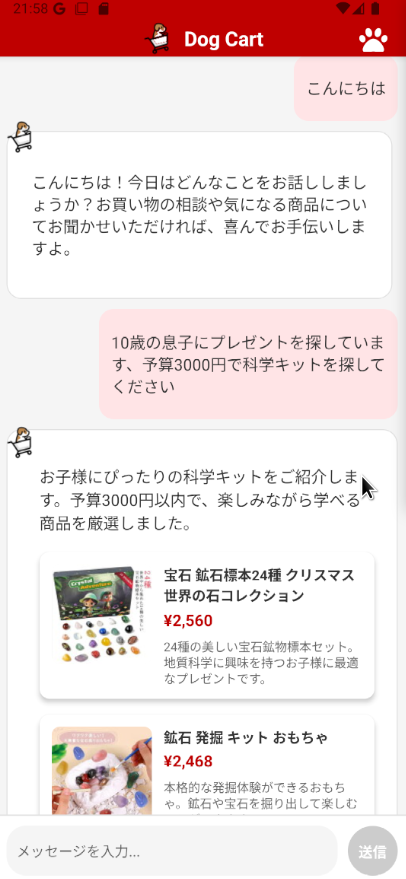 Dog Cart - AIショッピングアシスタント 🎯 パーソナライズされた商品提案 - スマートな対話型検索: 予算や用途を自然な会話で伝えるだけで最適な商品を提案 - プロフィール連動: 年齢層や性別に基づいたカスタマイズされたレコメンデーション 🔄 リアルタイムコミュニケーション - インタラクティブな応答: AIがリアルタイムで商品を探索・提案 - ストリーミング表示: 検索過程をリアルタイムで表示し、待ち時間を軽減 📱 使いやすいUI/UX - 直感的な操作: タップで商品詳細を表示、長押しで商品情報をシェア - スマートな画像表示: 商品画像の拡大表示 - チュートリアルガイド: 丁寧な機能説明 🏆 トレンド把握 - ランキング機能: カテゴリー別の人気商品をリアルタイムで表示 - ジャンル別推薦: 多様な商品カテゴリーに対応した柔軟な提案 🔐 プライバシー重視 - ローカルデータ管理: ユーザー情報はデバイス内で安全に保管 - 任意の情報提供: 必要最小限の情報のみを使用 💫 その他の特徴 - マルチプラットフォーム対応予定(iOS/Android) - レスポンシブなデザイン - 楽天市場との完全連携
