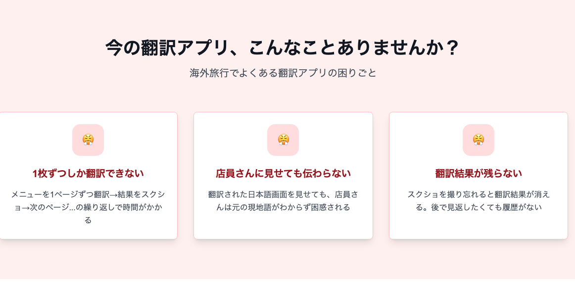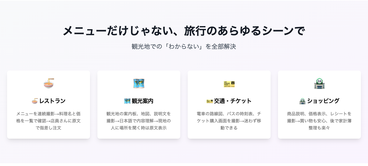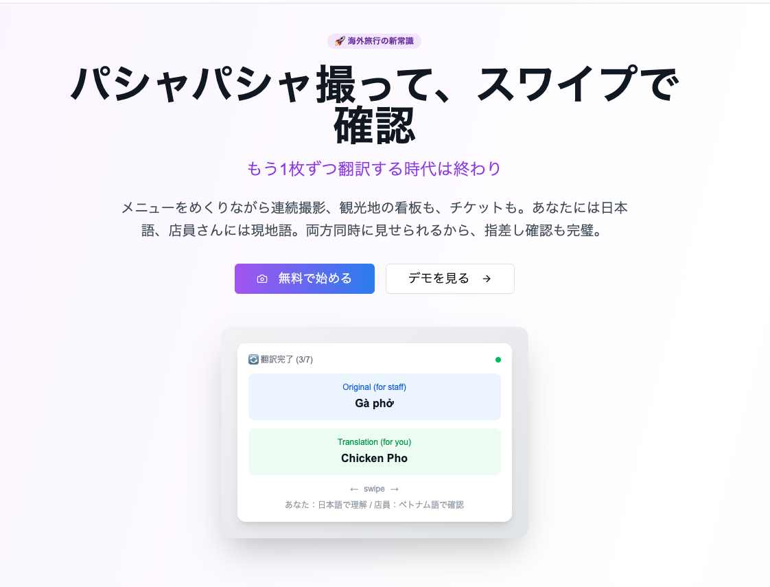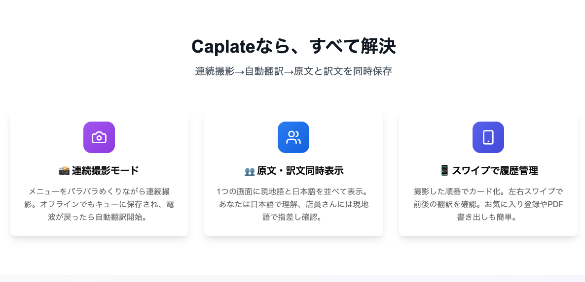 旅行先でメニューや案内板を撮影すると、Caplate が OCR × LLM で文字を抽出し、元のレイアウトをそっくり HTML で再構成。翻訳結果をタップすれば「指さし」モードで原文と訳文を大きく表示でき、店員や現地の人とそのままコミュニケーションできます。複数枚をグループ化してスライド表示すれば、長いメニューや乗換案内も一気に整理。全機能はオフライン PWA 内で完結し、APIキーも端末内保存。「見る・読む・伝える」をワンストップで叶える“旅の言語レンズ” です。 4️⃣ 主な機能 📸 グループ撮影:連続撮影を1グループにまとめて自動整理 🖼 レイアウト再現:メニュー/看板/地図などをHTMLで原寸復元 🌐 瞬間翻訳:120以上の言語ペアを Gemini Vision API で処理 👉 指さしモード:タップした項目を拡大・回転表示し対面会話に最適 🚪 完全ローカル PWA:通信制限のある海外でもオフライン動作 5️⃣ 使い方(3ステップ) 撮る:カメラでメニューや案内図を連続撮影 見る:スライドビューで訳文/原文を切り替え確認 伝える:指さしモードで店員さんに画面を見せてオーダー完了 6️⃣ 想定ユーザー 海外旅行者・デジタルノマド 多言語メニューを扱う飲食店スタッフ 留学・出張で現地言語が不安な方 ===== こんにちは、Caplate 👋 開発者のmotaです。 「スクショ翻訳」ではレイアウトが失われ、どの料理が何か分かりづらい――そんな旅行あるあるを解消したくて、“空間翻訳” コンセプトを形にしました。技術的には Vision OCR ➜ レイアウト推定 ➜ LLM翻訳 ➜ Webコンポーネント化 をフロントだけで実装しています。ぜひフィードバックを頂き、次は リアルタイム動画モード や 多人数共同翻訳 に挑戦したいです。Upvote & コメントお待ちしています! 🙏 ✨