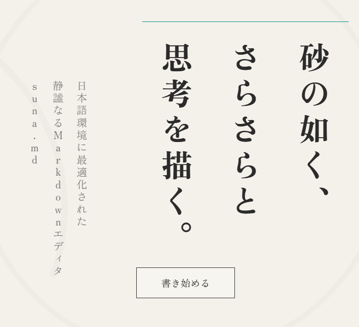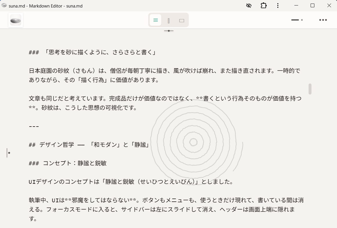 マークダウンを書くとき、半角と全角を行ったり来たり。 思考の流れを妨げられていませんか? そんな苦労をなくすエディタです。 日本語入力環境に最適化しました。 「みだし」→ Return/Enter → 右シフト → #_ など、快適な入力を後押しする機能が満載です。 集中を妨げるものを極力排除し、 静謐な執筆環境を提供します。 さらに、自ら書けば書くほどにエディタ画面で砂紋が育ちます。 あなたの思考、逡巡、決断を肯定し、 砂紋はどんどん大きくなります。