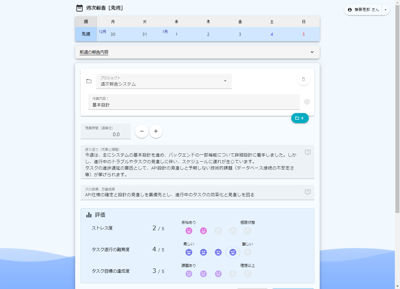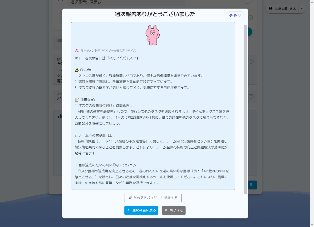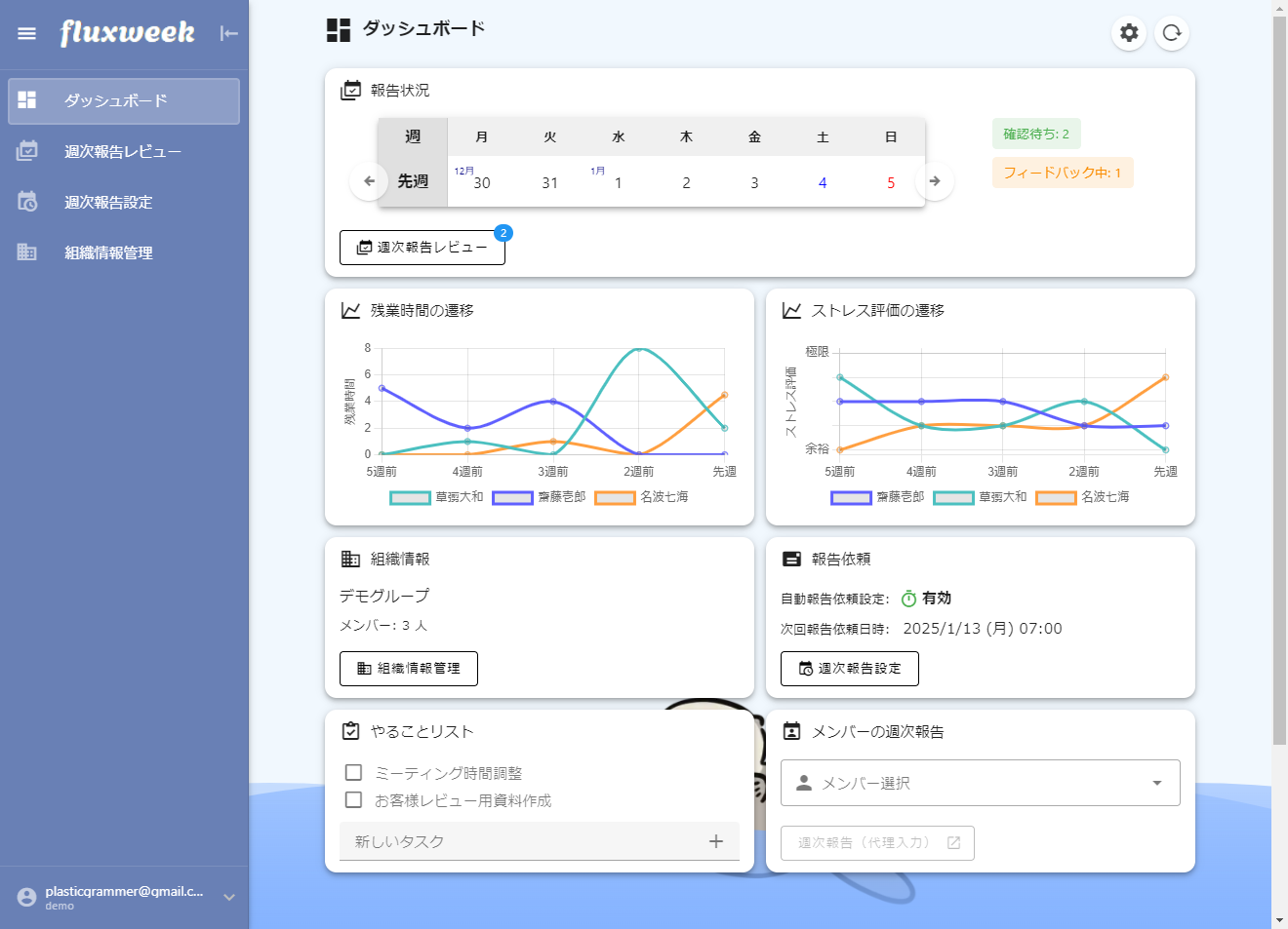 ストレスフリーな管理で 組織の成果をサポートする週次報告システム です。 週次報告が形骸化していませんか? このサービスを利用すると、メンバーのストレス度、タスク難易度、タスク達成度を可視化し、状況を素早く把握できます。 また、AI利用により週次報告に対する具体的なアドバイス提供、および管理者向けに報告分析機能を提供します。 フリープランでもAIアドバイザーが利用できますのでお試しください。 ご意見・フィードバック大歓迎です!