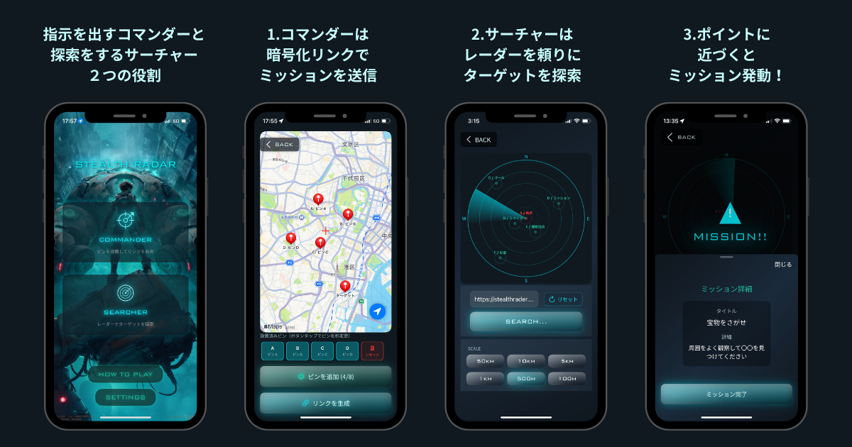 STEALTH RADARは、日常の移動や外遊びを「冒険」に変えるGPS探索レーダーアプリです。 コマンダーは現実の地図上にミッションを生成、サーチャーはレーダーだけを頼りに探索しミッションを遂行。 ゲームや動画に夢中になりがちな子どもも、ステルスレーダーを使えば、いつもの街並みや公園がミッションの舞台に早変わり。自然と外に出たくなるきっかけになります。 スカベンジャーハントとも呼ばれる宝探しやアイテム収集ミッション、街イベントから動画企画まで。 無限の遊び方で、毎日の体験をもっとワクワクに。