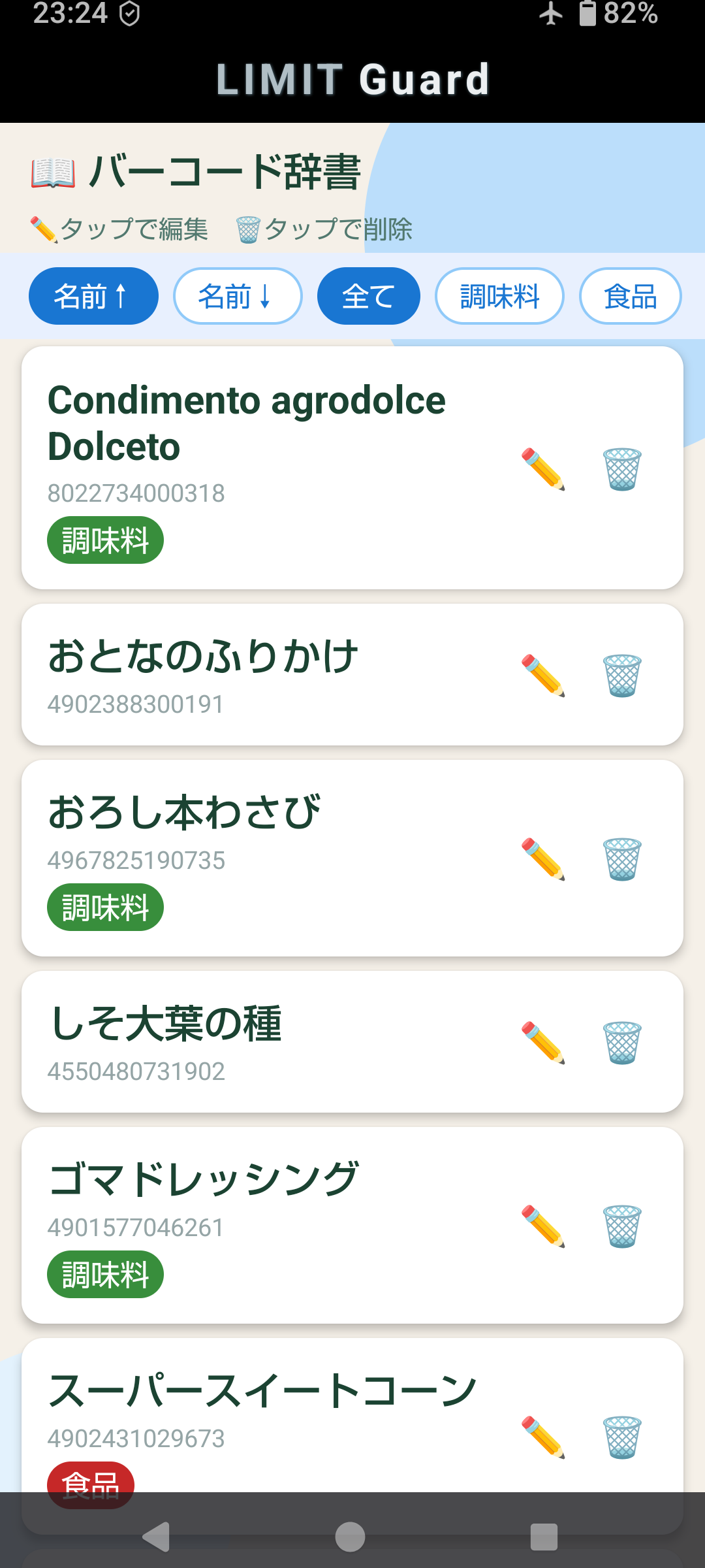 「あ、これ期限切れてる…」を、このアプリでゼロに。 「賞味機嫌(LimitGuard)」は、冷蔵庫の食材や日用品のストックを、カメラで撮るだけで簡単に管理できるアプリです。 面倒な日付の手入力はもう必要ありません。カメラをかざして、スマートに期限管理を始めましょう! 【賞味機嫌が選ばれる3つのポイント】 1. カメラをかざすだけ!期限読み取り機能 文字認識機能を使って、パッケージに印字された「賞味期限」や「消費期限」をカメラでスキャン。日付を自動で入力できるので、登録が驚くほどスムーズです。 2. バーコードスキャンで商品名を自動取得 バーコードを読み取れば、商品名を自動で入力。一度登録した商品は「自分専用辞書」に保存されるので、2回目以降はスキャンするだけで登録が完了します。 3. タグ機能で場所別にスッキリ整理 「冷蔵庫」「冷凍庫」「パントリー」「防災備蓄」など、場所ごとにタグを付けて管理できます。どこに何があるか、アプリを開けば一目でわかります。 【こんな方におすすめです】 ついつい食材を期限切れにしてしまう方 冷蔵庫の在庫管理を楽にしたい方 食品ロス(フードロス)を減らして節約したい方 防災グッズや非常食の期限をまとめて管理したい方 シンプルで使いやすい管理アプリを探している方 【使い方はとても簡単】 アプリを起動し、商品のバーコードをスキャン。 パッケージの期限印字にカメラをかざして日付を読み取り。 必要に応じてタグを選んで保存! 日々の期限管理を「面倒な作業」から「安心できる習慣」へ。 「賞味機嫌」と一緒に、無駄のないスマートなキッチンライフを楽しみましょう!
