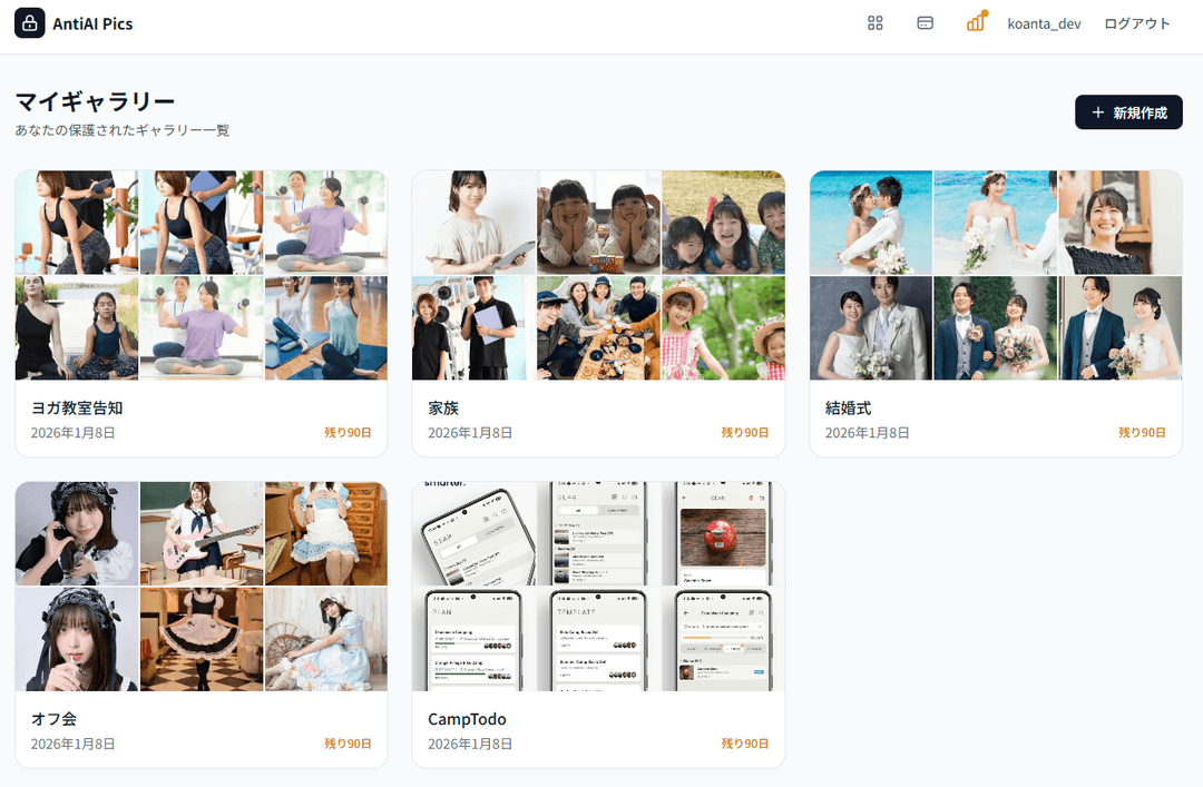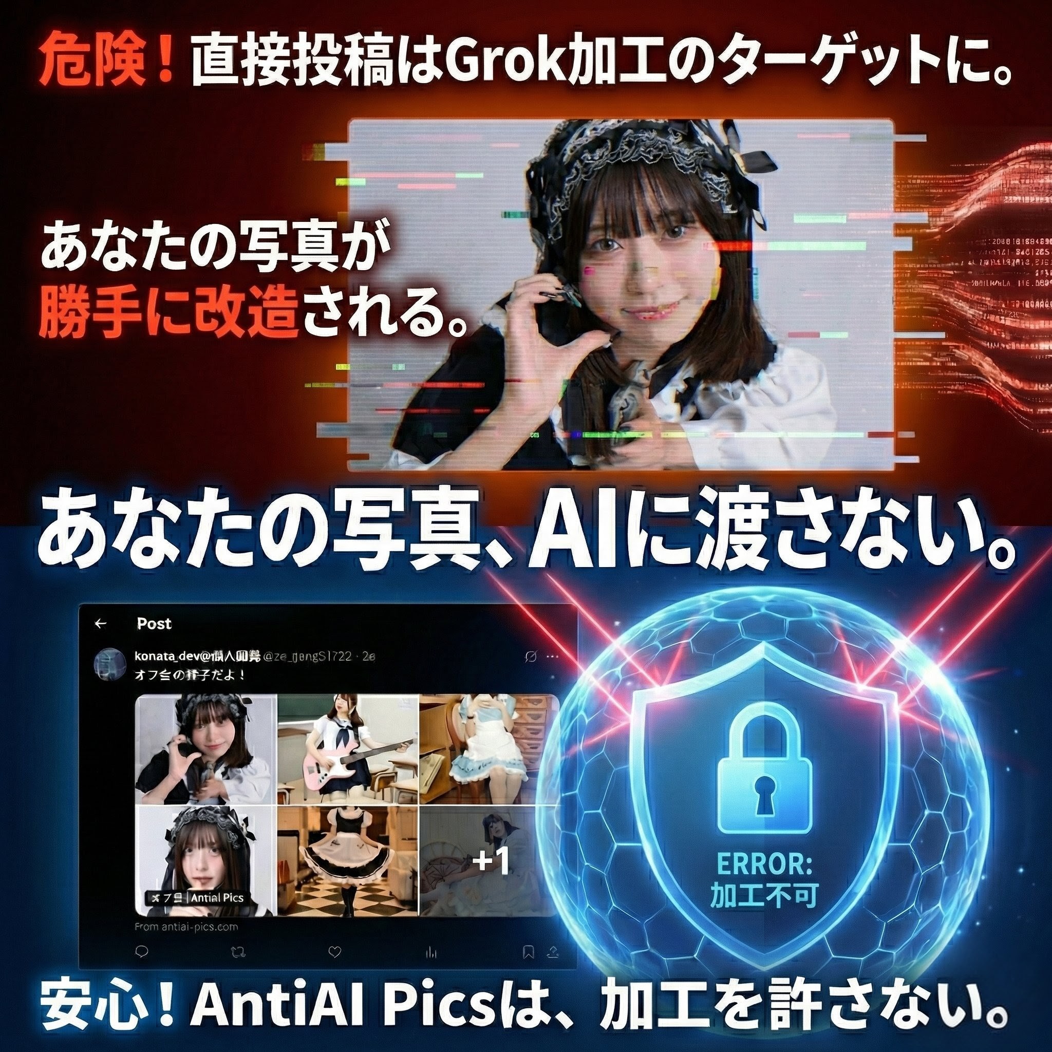 Grokの無断加工からあなたを守る、お手軽フォトシェアサービス ■どんなサービス? Xに投稿した写真がGrokで無断加工される被害が急増しています。AntiAI Picsは「長押し保存をブロック」+「保存されてもGrokに読み取らせない」二重の保護で、安心して写真をシェアできるギャラリーサービスです。 ■主な機能 ・AI読み取り防止:特殊な加工でGrokがエラーを起こす ・長押し保存ブロック:カジュアルな無断保存を防止 ・OGP対応:Xでシェアするとカードにプレビュー表示 ■こんな人に使ってほしい コスプレイヤー / ポートレートモデル / インフルエンサー / フォトグラファー / 撮影会主催者 / 家族写真を守りたい方