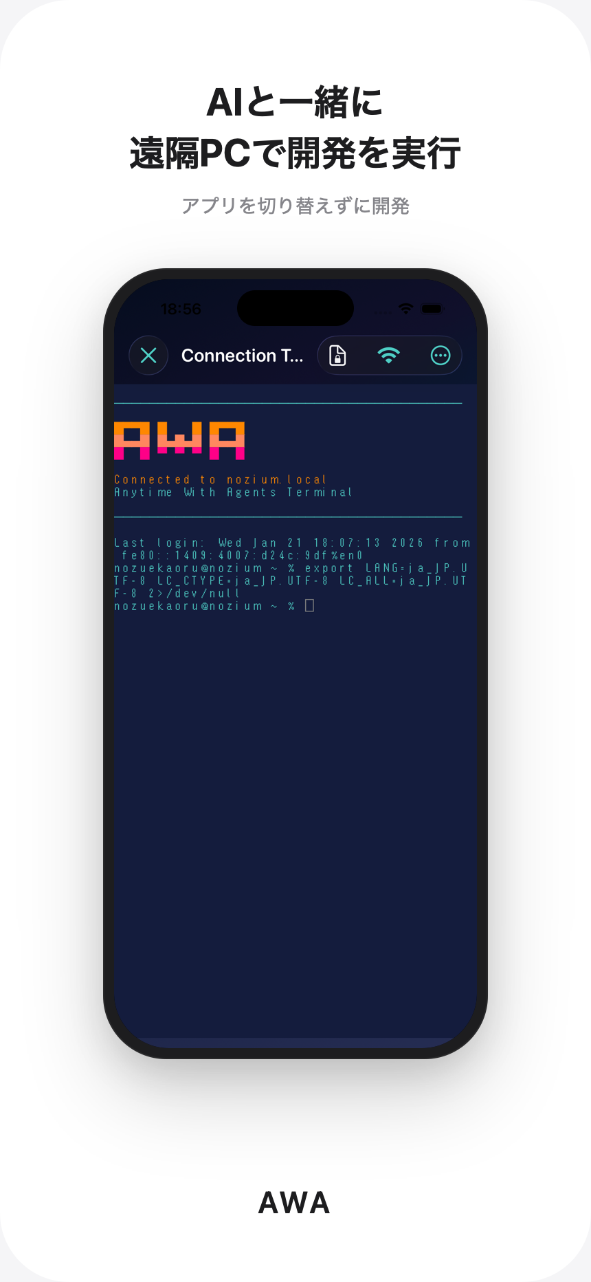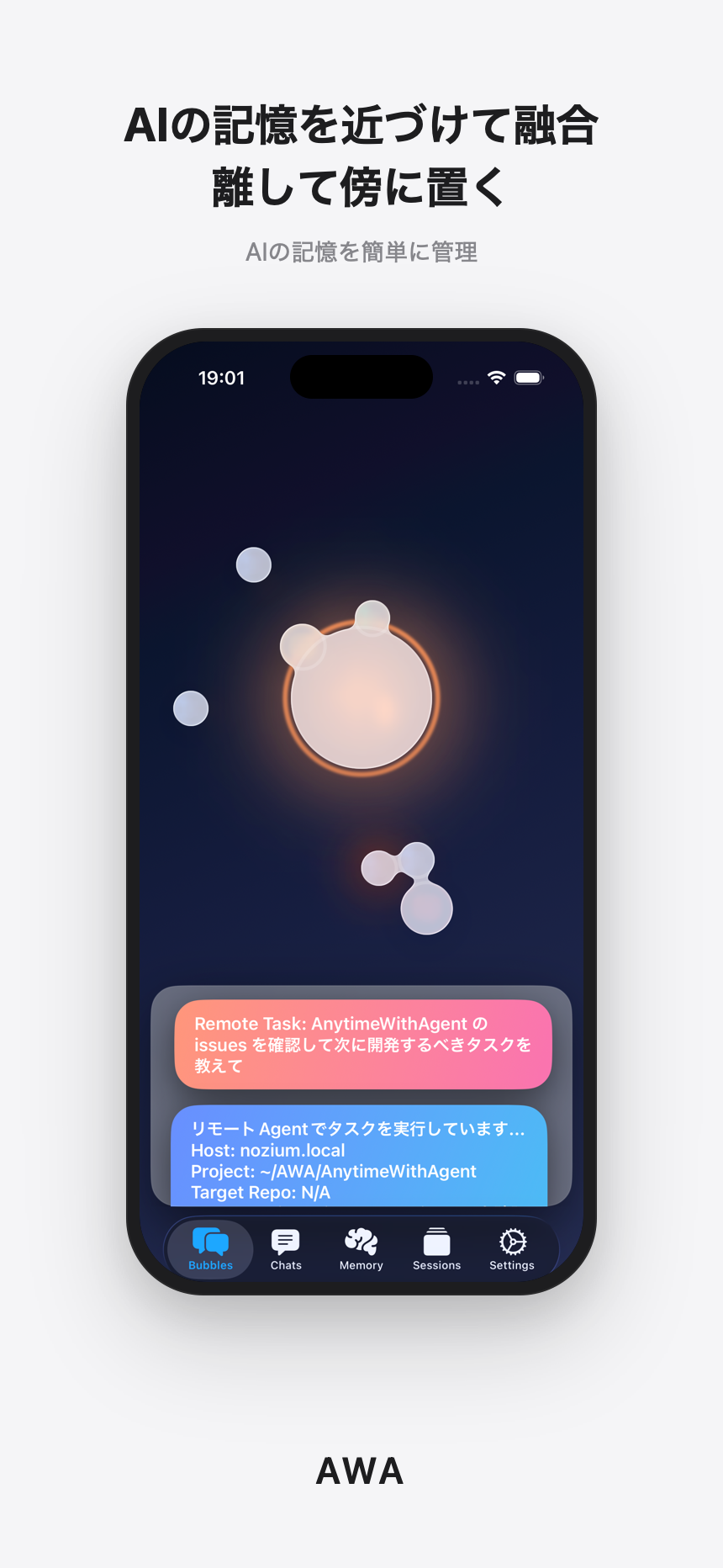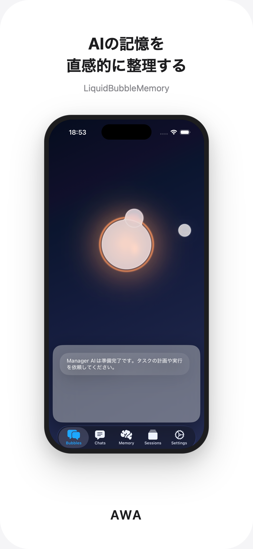 画面に浮かぶ、透明な泡。 触れると、ふわりと動く。近づけると、溶け合うように重なる。 AWA(泡)は、AIとの会話を「泡」にしました。 Liquid Glassで描かれた泡が、物理演算で画面上を漂います。 大事な会話は中心へ。終わった話題は外側へ。 ドラッグするだけで、AIとの記憶が空間になる。 話しかければ、泡が光る。 Apple Intelligenceがあなたの声を聴いている合図です。 月額課金なし。買い切りで、好きなだけ話せます。 そしてAWAは、SSHターミナルでもあります。 サーバーに繋ぎながら、AIに相談する。 コードを書きながら、別の泡でリサーチを続ける。 開発者のための、AIとターミナルの融合。