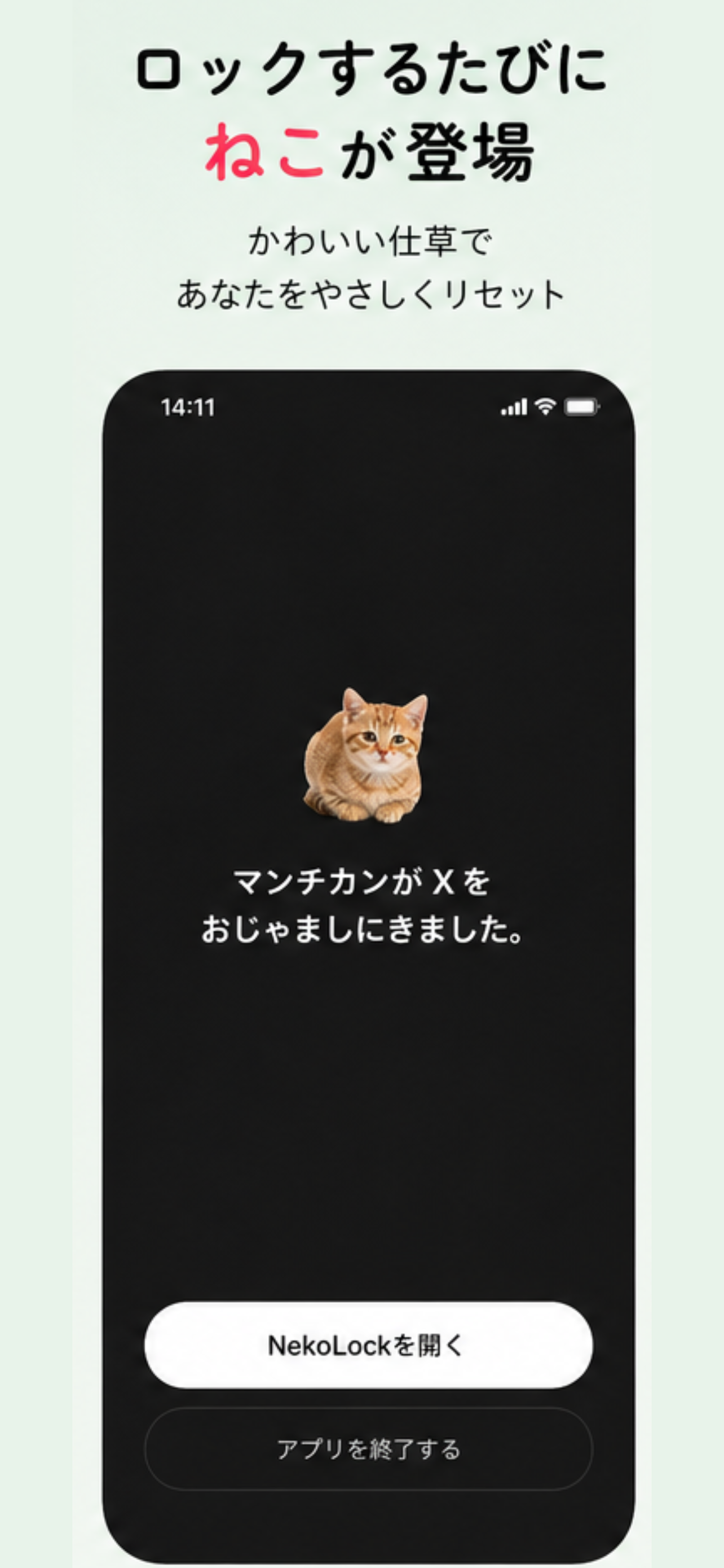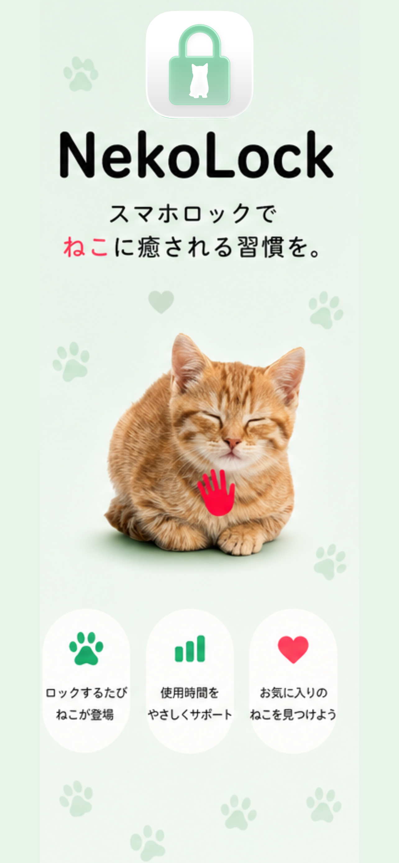 NekoLock(ネコロック)は、SNSを使いすぎるとねこが邪魔してくるアプリです。 1. ねこが邪魔してきた場合、ねこを撫でて満足させないとSNSが使えません。 2. ねこが満足していなくなったら、次にSNSを何分使うか決めます。 3. 指定した時間後にランダムで別のねこがお邪魔しにきます。