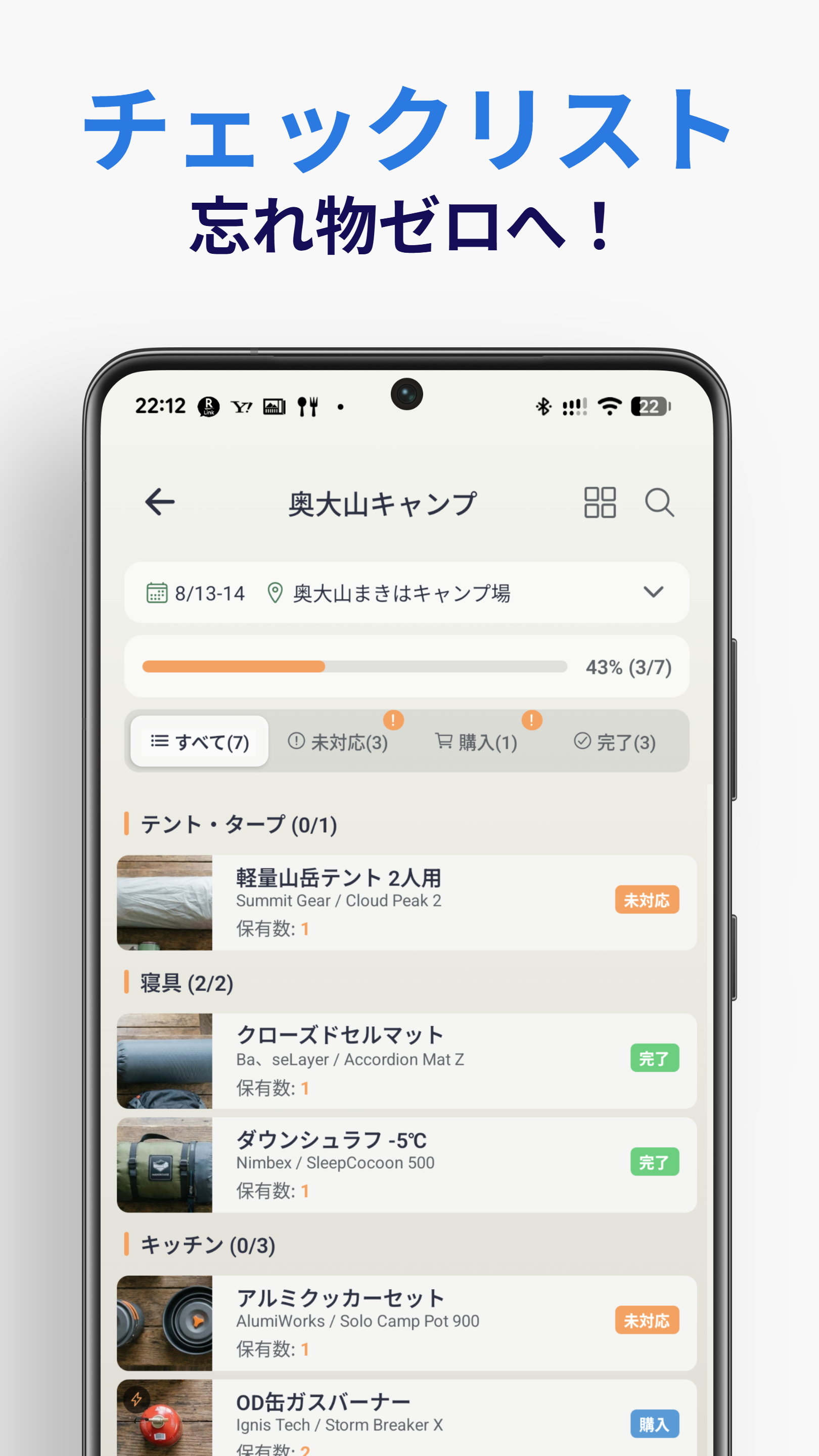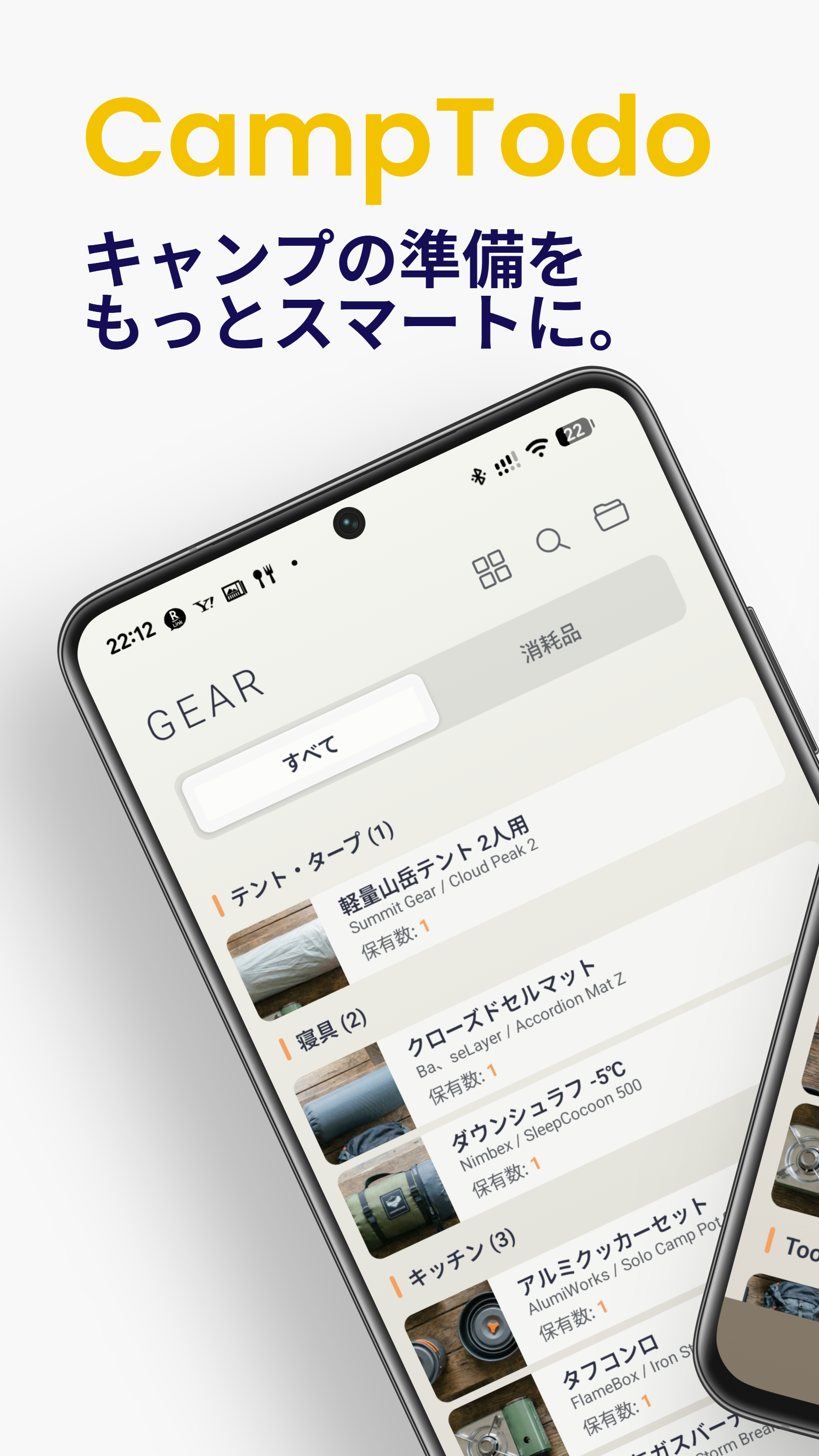 「また忘れ物した...」そんな経験、ありませんか? CampTodoは、キャンプの準備を劇的に効率化するギア管理アプリです。 ⛺ こんな悩みを解決します ━━━━━━━━━━━━━━━━━━━━ ✓ 毎回キャンプの持ち物リストを作り直している ✓ 現地で「あれ持ってくればよかった」と後悔する ✓ 何を持っているか把握しきれない ✓ 季節や場所によって持ち物が変わって管理が大変 🎒 主な機能 ━━━━━━━━━━━━━━━━━━━━ 【マイギア管理】 持っているキャンプ用品をカテゴリ別に登録。写真付きで一目で確認できます。テント、タープ、寝袋、調理器具...すべてのギアを一元管理。 【テンプレート機能】 「ソロキャンプ用」「ファミリーキャンプ用」など、よく使う持ち物セットをテンプレートとして保存。次回からはワンタップで準備リストを作成できます。 【プラン管理】 キャンプの予定ごとに持ち物リストを作成。テンプレートから必要なものを選んで、自分だけのリストをカスタマイズ。 【チェックリスト】 ワンタップで準備状況を更新。直感的な操作で、準備の進捗が一目でわかります。「準備完了」「買い足しが必要」など、状況に応じてサクサク管理。