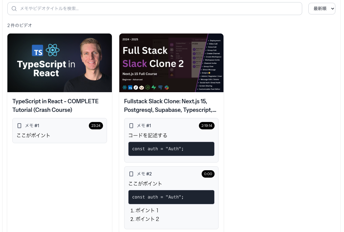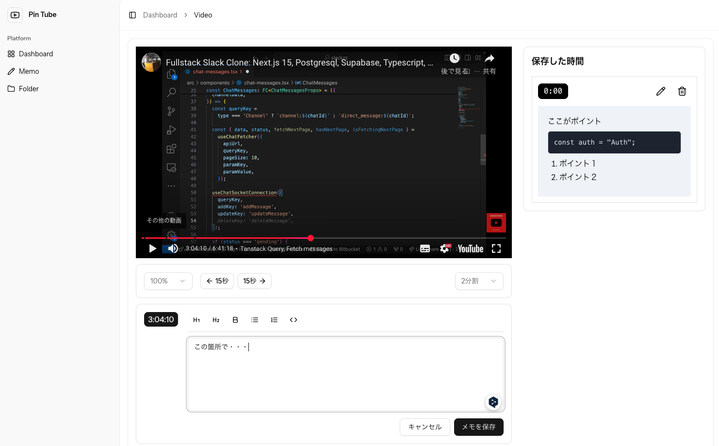 長時間のエンジニア向け動画でも、重要な箇所にピンを立てていつでも好きな時間から再生できるWEBアプリ。 ピンと同時にメモ機能もあるので動画内の重要な実装を保存し、管理することで後から見返すことも可能。
