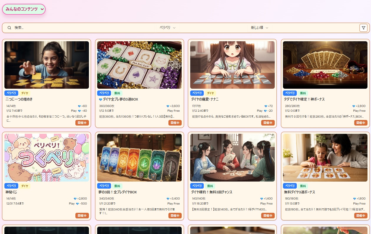 「つくペリ」は、オリジナルのくじ(ペリペリ)を誰でも簡単に作成・公開し、みんなで楽しむことができる新しいエンターテインメント・プラットフォームです。 【つくペリの3つの楽しみ方】 クリエイターになる(作る): あなたのアイデアがコンテンツに!直感的な操作で、世界に一つだけのオリジナル「ペリペリ」を作成。企画力でみんなを熱狂させましょう。 チャレンジャーになる(遊ぶ): 多彩なテーマのくじに挑戦!必要なのは「直感」と「戦略」。ただ運に任せるだけでなく、あなたの選択が結果を左右する新しい体験が待っています。 報酬を手にする(繋がる): 見事当たりを引けば、豪華な報酬をゲットするチャンスも。「作る人」と「遊ぶ人」が興奮を共有できる、次世代の遊び場へようこそ。 さあ、あなたも無料でアカウントを作成して、「選択」の世界へ飛び込みましょう!