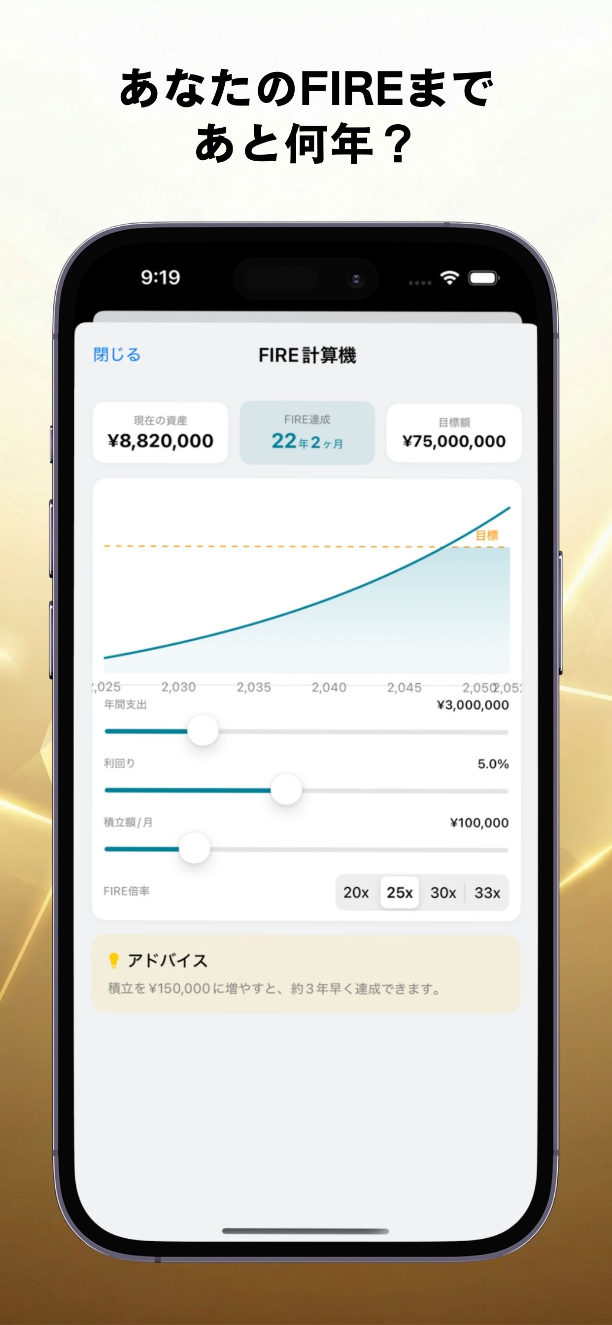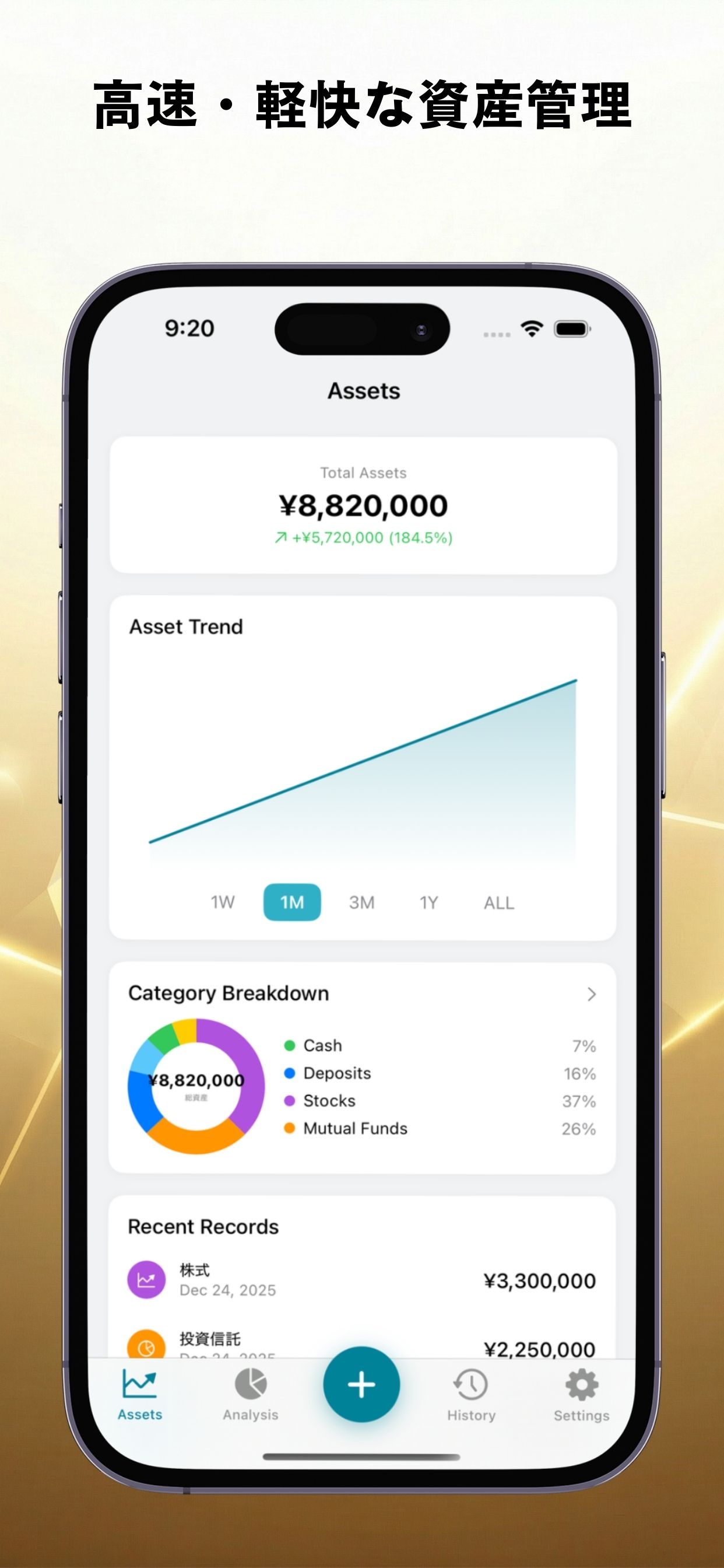 # 資産管理アプリ「資産管理」機能紹介 シンプルに資産を記録・管理できるiOSアプリです。 高速、軽快な動作にこだわりました。 --- ## 基本機能 **資産の記録** - 電卓スタイルで金額を入力 - カテゴリ・口座・日付を選択して保存 **総資産の確認** - 総資産額をホーム画面に表示 - 前期比の増減もわかる **資産推移グラフ** - 折れ線グラフで資産の変化を可視化 - 期間を選択して表示 **カテゴリ別管理** - 現金・預金・株式・投資信託・不動産・暗号資産・年金/保険・その他 - ドーナツチャートで構成比を表示 **口座別管理** - 銀行・証券・暗号資産・現金など - 口座ごとに資産を分類 --- ## 分析機能 **FIRE計算** - 年間支出・利回り・積立額を設定 - FIRE達成までの年数を自動計算 - グラフで資産成長をシミュレーション **資産予測** - 現在のペースで将来の資産額を予測 **目標設定** - 目標金額と期限を設定 - 達成度を追跡 --- ## その他の機能 - 履歴の検索・編集・削除 - 10種類の通貨に対応(JPY, USD, EURなど) - 日本語・英語対応 - カラーテーマのカスタマイズ - データのバックアップ(オプション)