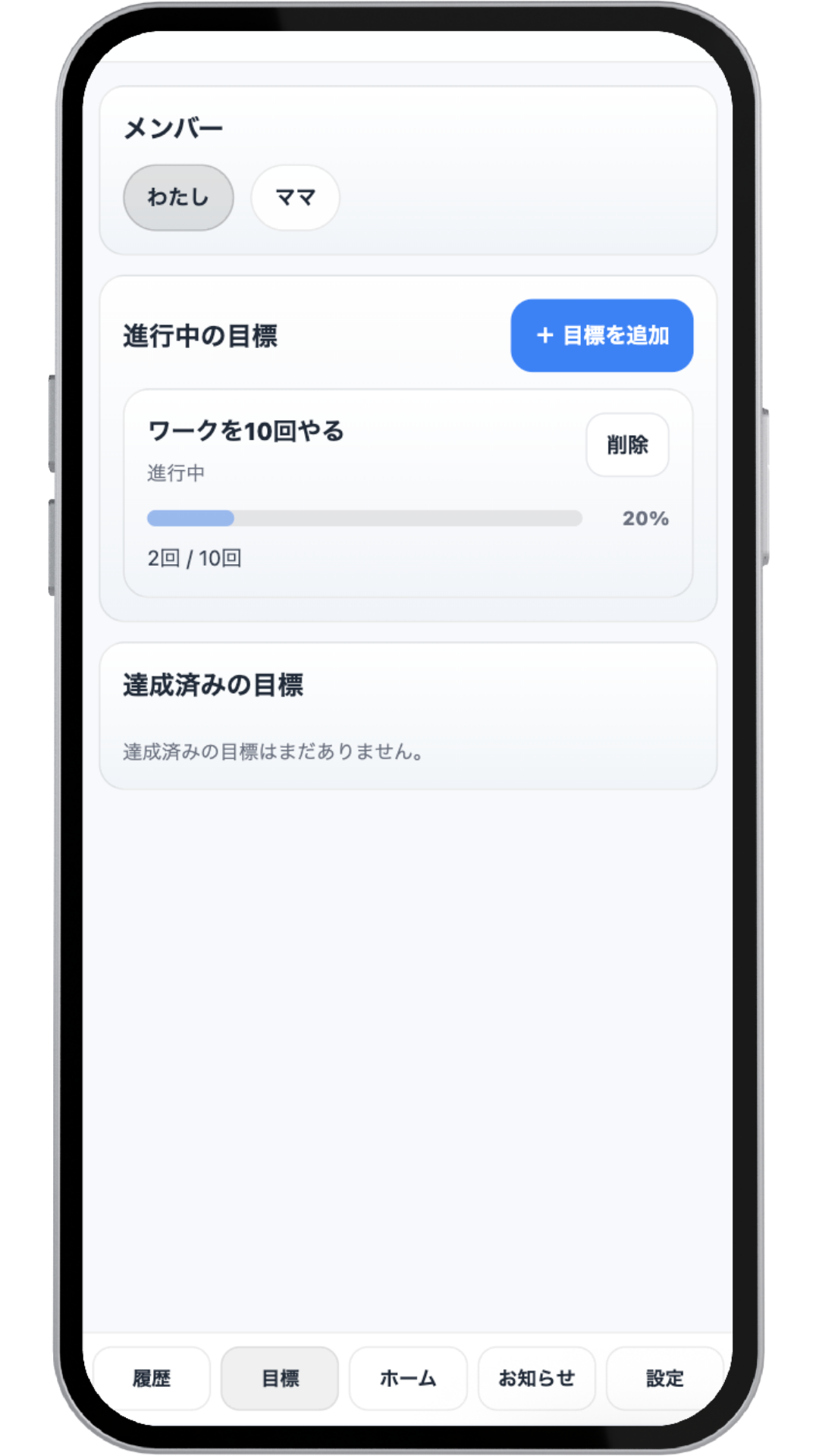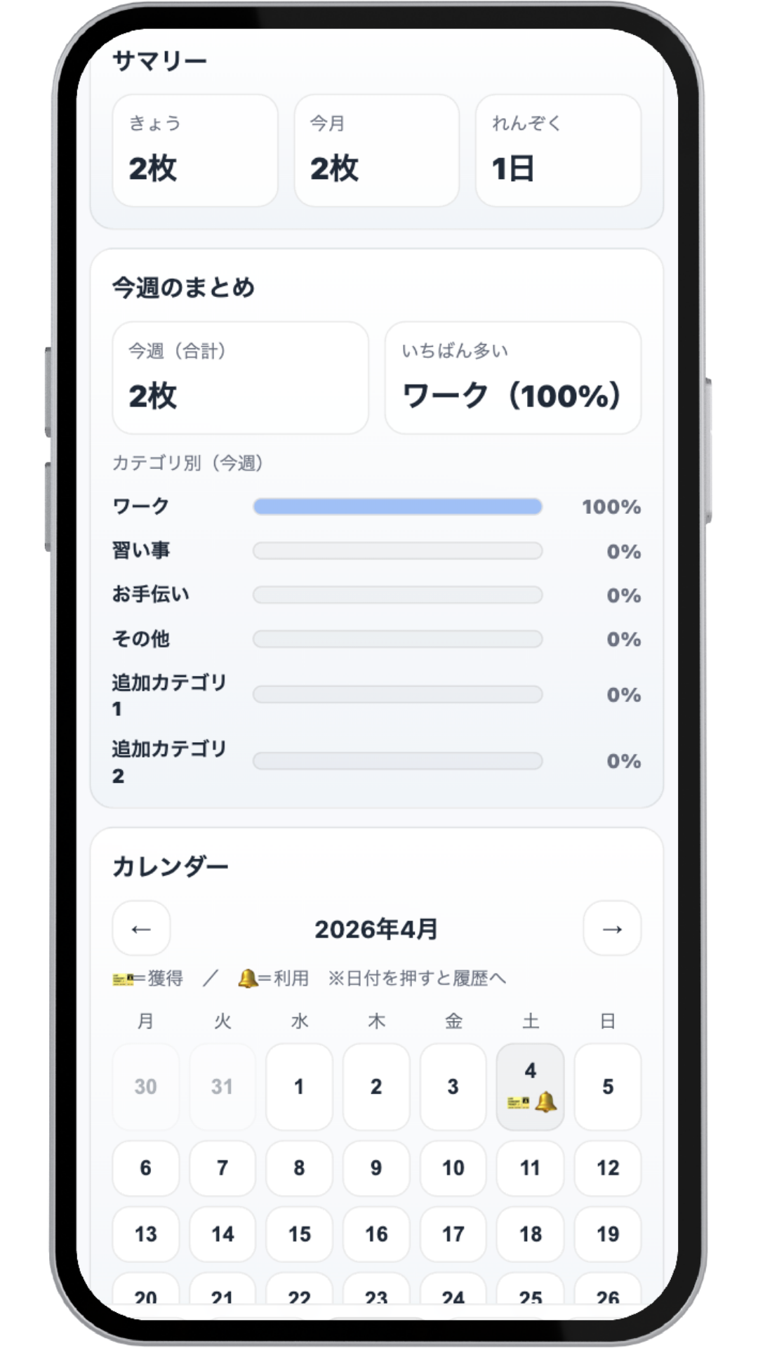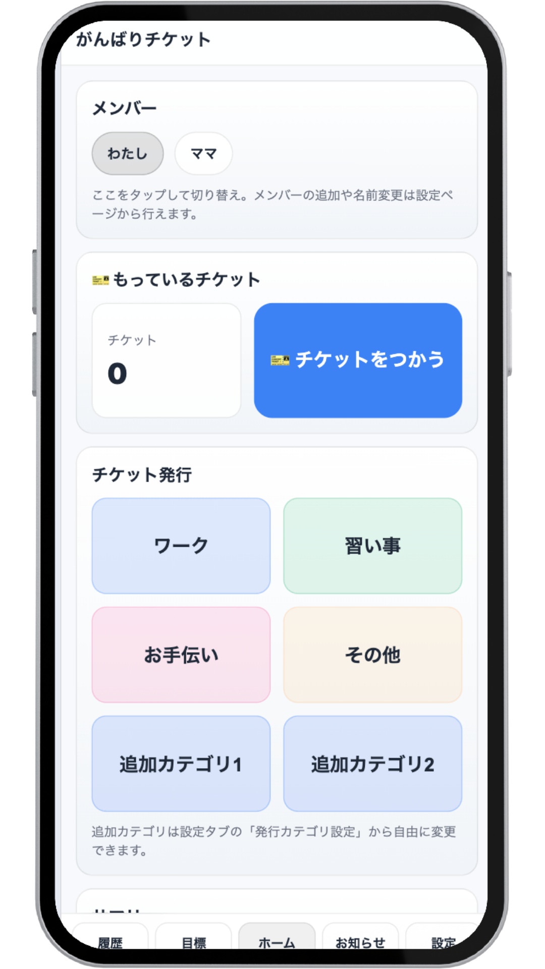 がんばりチケットは、子どものワークや習い事・お手伝いなどの“がんばり”をチケットとして記録し、楽しく習慣化できるWebアプリです。家族で「がんばり」を共有しながら、履歴・目標・進捗も確認できます。