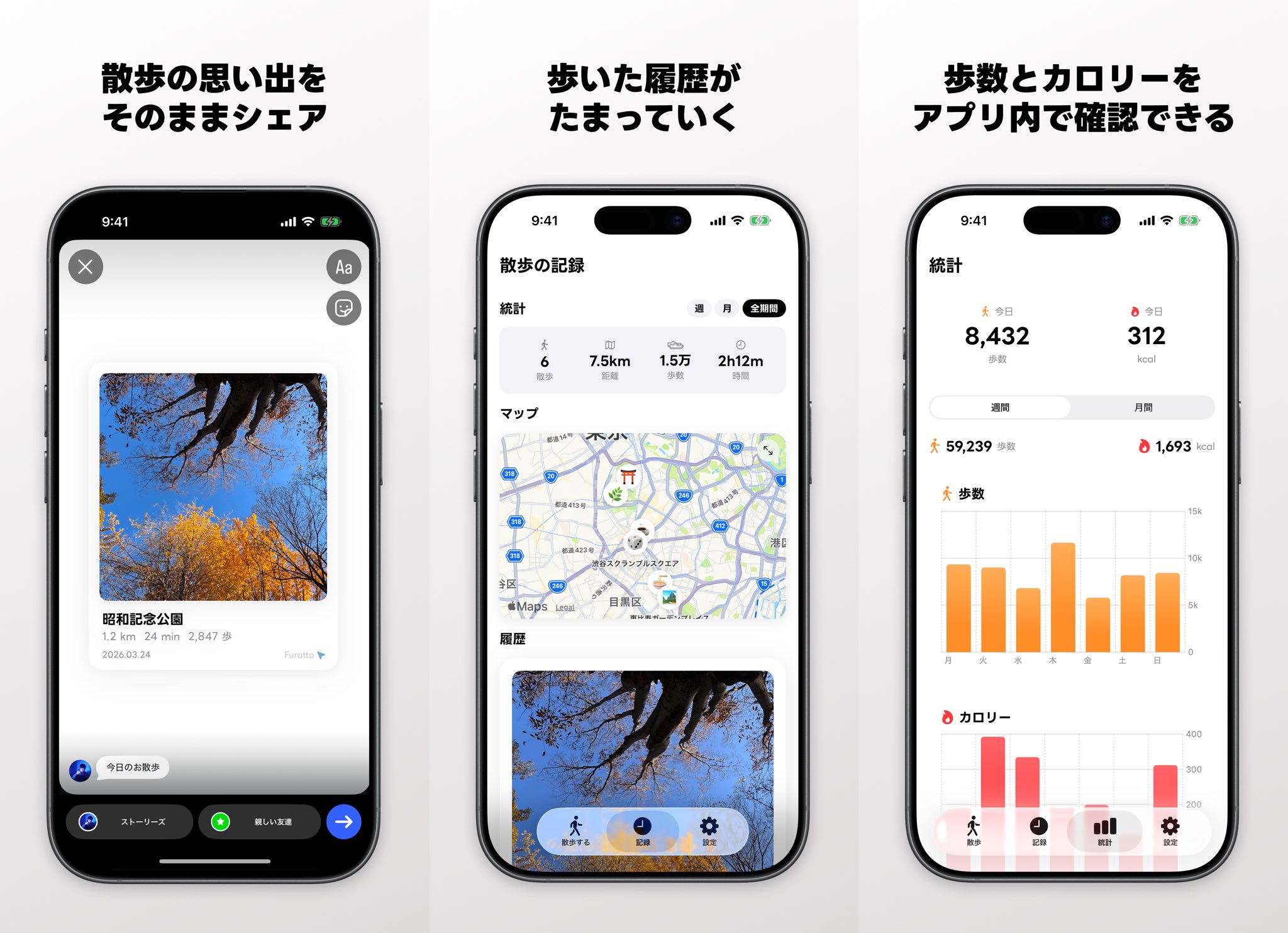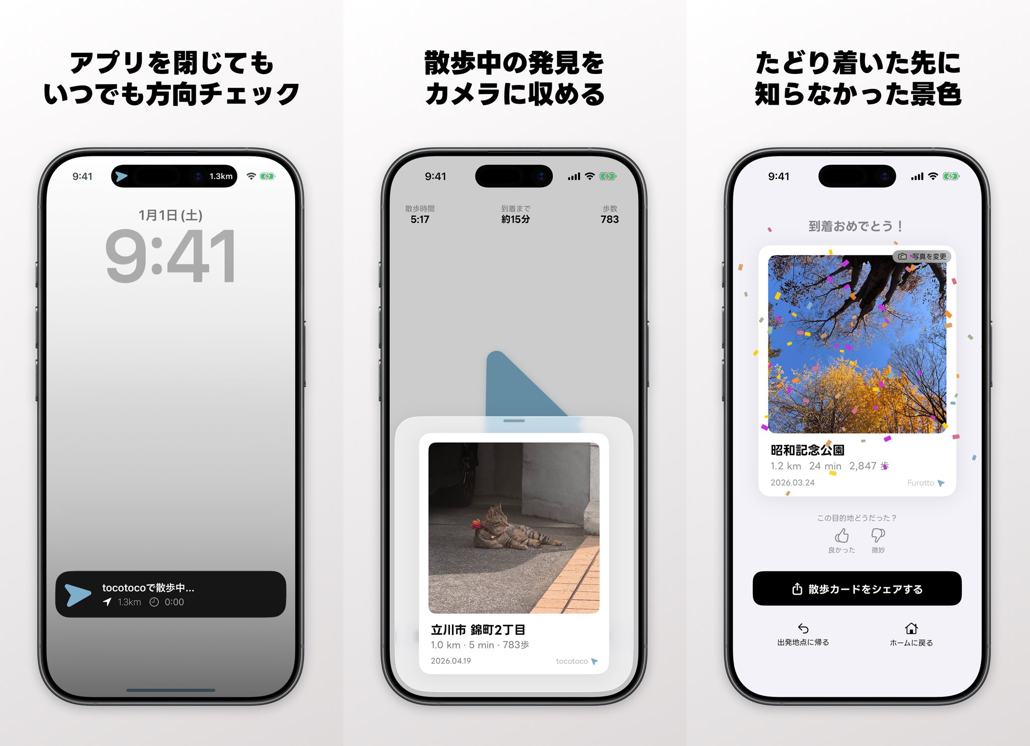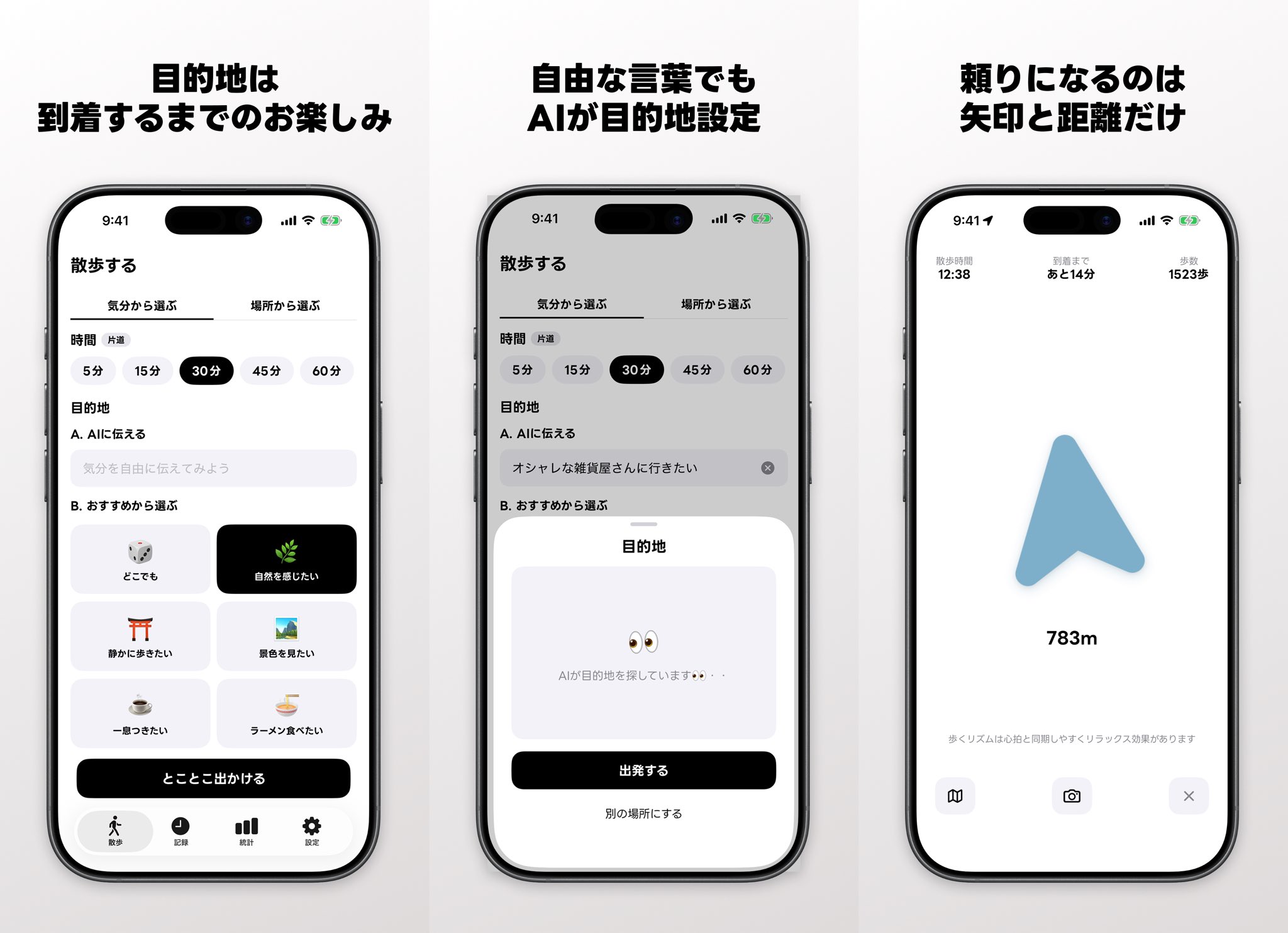 目的地は到着するまでのお楽しみ。 気分を選ぶだけで、AIが秘密の行き先を設定。 頼りになるのは矢印と距離だけ。地図も住所もない。 道中で見つけた景色は、写真に残してシェアしよう。 いつもの道に飽きたら、トコトコと出かけよう。