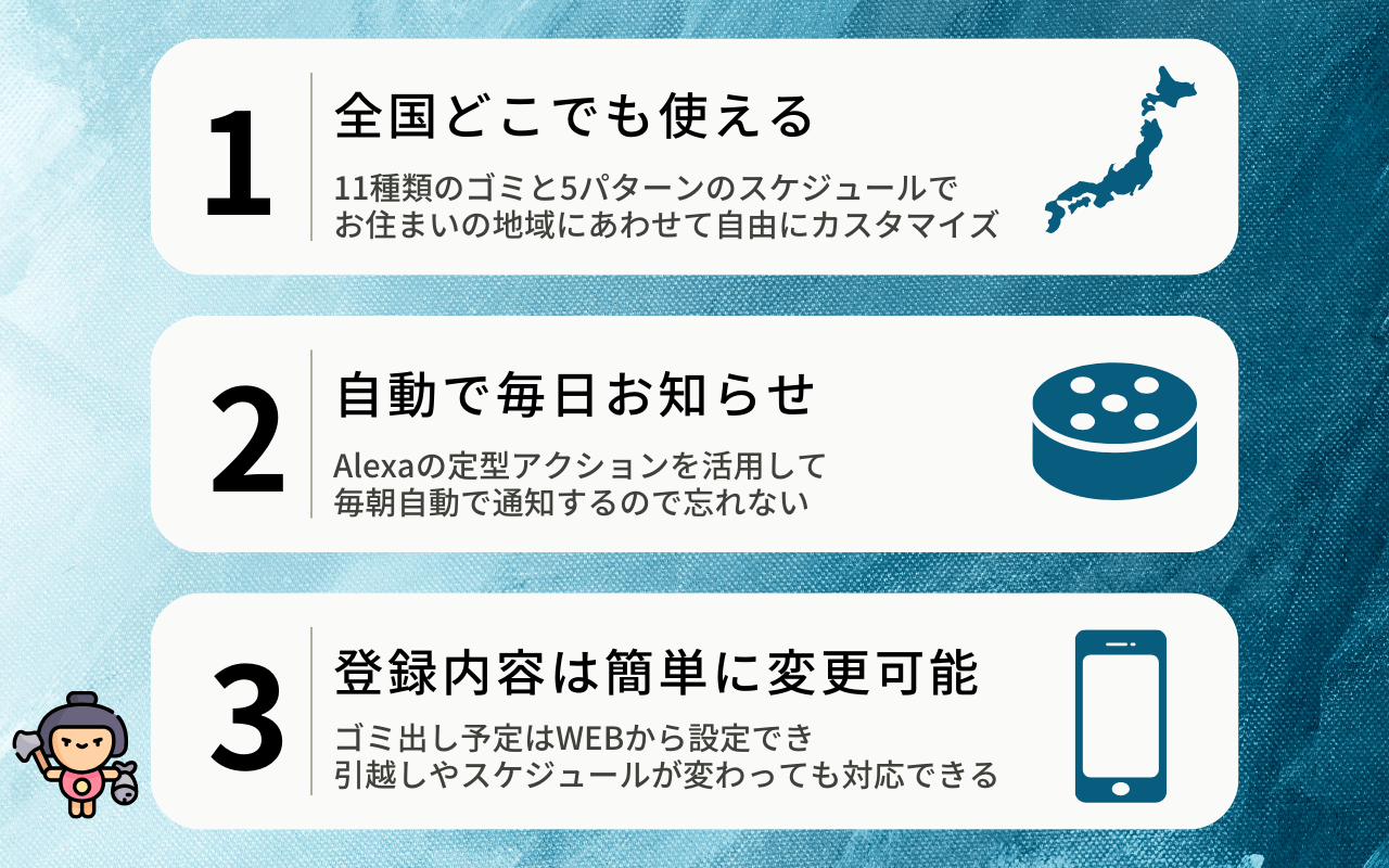 【全国対応】 登録したゴミ出し予定の通知と確認ができます。 ゴミの出し忘れをなくして、ゴミ出しの悩みを解決しよう! ■ ゴミ出し太郎の特徴 1. 全国どこでも使える 11種類のゴミと5種類のスケジュールでお住まいの地域に合わせてゴミ出し予定を自由にカスタマイズできます 2. 決まった時刻に自動でお知らせ Alexaの定型アクションを活用して毎日自動で通知できるので忘れません 当日だけでなく、明日や4日後など1週間先の予定まで確認できます 3. 登録内容は簡単に変更可能 ゴミ出し予定はWEBから設定でき、引越しやスケジュールが変わっても対応できます
