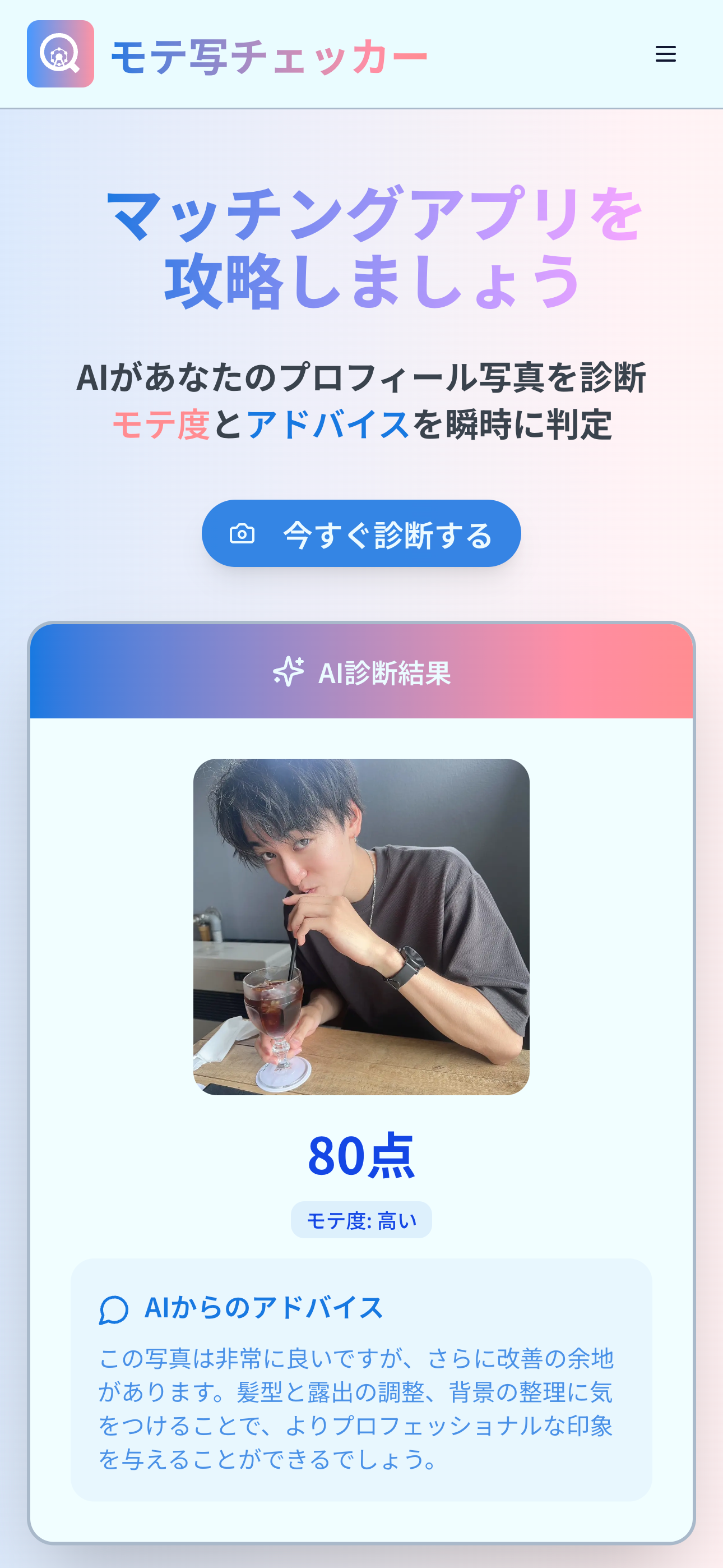 マッチングアプリで 「なぜかマッチしない」「いいねが伸びない」 そんな経験はありませんか? 多くの場合、原因はプロフィール写真にあります。 「モテ写チェッカー」は、 AIがあなたの写真を解析し、 ・マッチしやすさ(モテ度)を数値化 ・第一印象の良し悪しを言語化 ・どこをどう直せばいいかの具体的な改善アドバイス を提供する写真診断サービスです。 さらに、 AIが“実際にマッチしやすい写真”を生成・編集する 「モテ写メーカー」も用意しています。 ✔ 何がダメか分からない ✔ 撮り直すのが面倒 ✔ 写真で損している気がする そんな人でも、 「原因を知る → 改善する → 使える写真を手に入れる」 までを一気に解決できます。 恋愛に悩んできた元非モテのエンジニアが、 「過去の自分を救いたい」という想いで作りました。 恋愛がうまくいくと、 自己肯定感も、行動力も、人生も変わる。 その最初の一歩を、写真から。 3回まで無料で診断できるので、 ぜひ一度試してみてください。