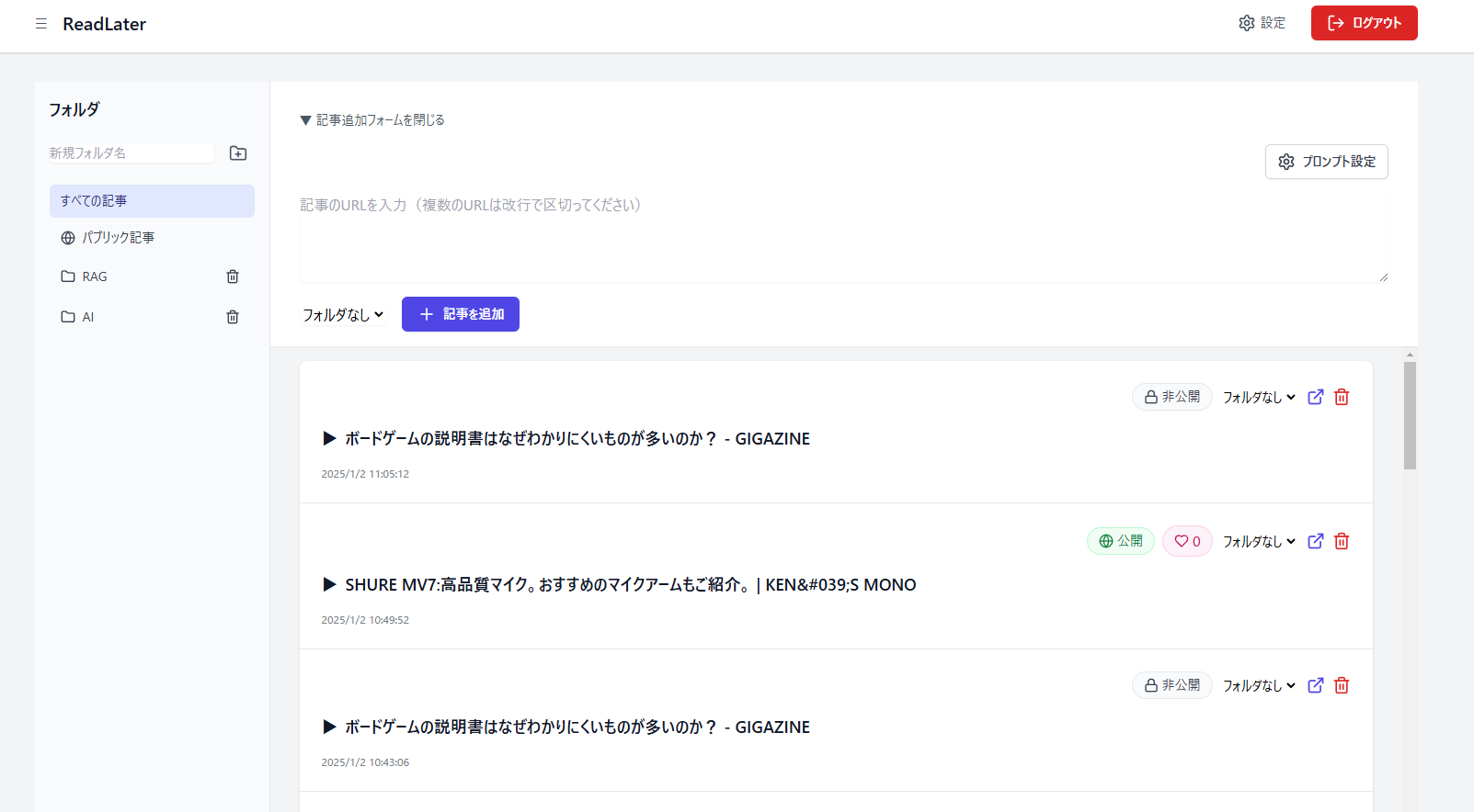 「Readlater」は、気になる記事のURLを入力するだけでAIが自動的に内容を要約し、ダッシュボードで管理できるWebアプリです。オリジナルのテキストを読む前に要点を素早く把握できるので、限られた時間の中でも効率よく情報を収集できます。蓄積された記事の要約は一覧で確認でき、フォルダ管理で、必要な情報をすぐに探し出せます。 さらに、ダッシュボードにある「公開ボタン」を使えば、まとめた記事をワンクリックで会員へシェアできるのが大きな特長。学習やビジネスなどで大量の情報を扱うときでも、情報共有やナレッジの蓄積がスムーズに行えます。また、デザインはシンプルで直感的なので、PCだけでなくスマートフォンやタブレットからのアクセスも快適。情報共有がより円滑になることで、プロジェクトの進行状況を素早く把握しやすくなり、学習・リサーチの成果を整理する際にも役立ちます。「readlater」を活用すれば、あとで読みたいコンテンツの管理から共有までを一括で手軽に行えるため、生産性を大幅に向上させることが可能です。