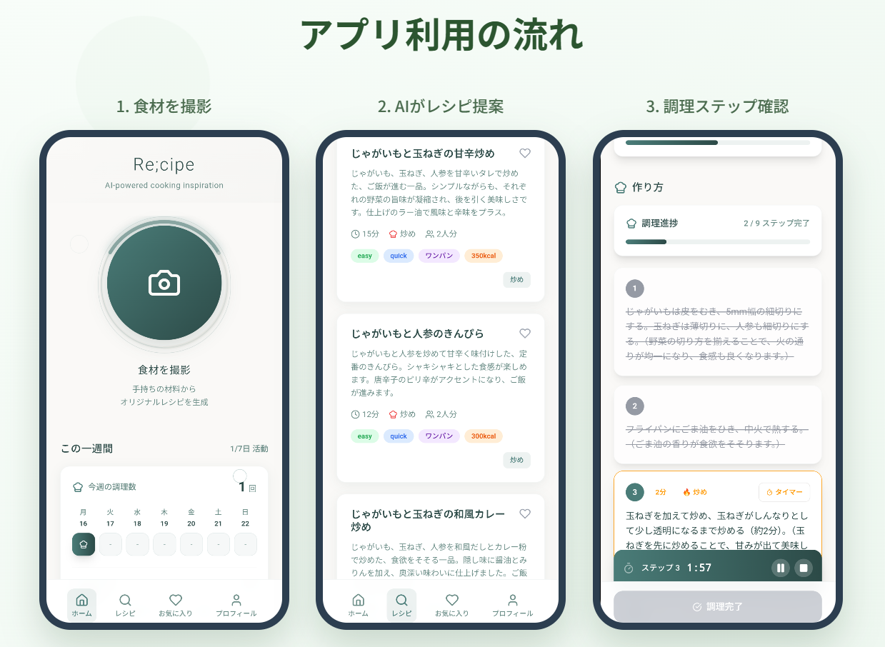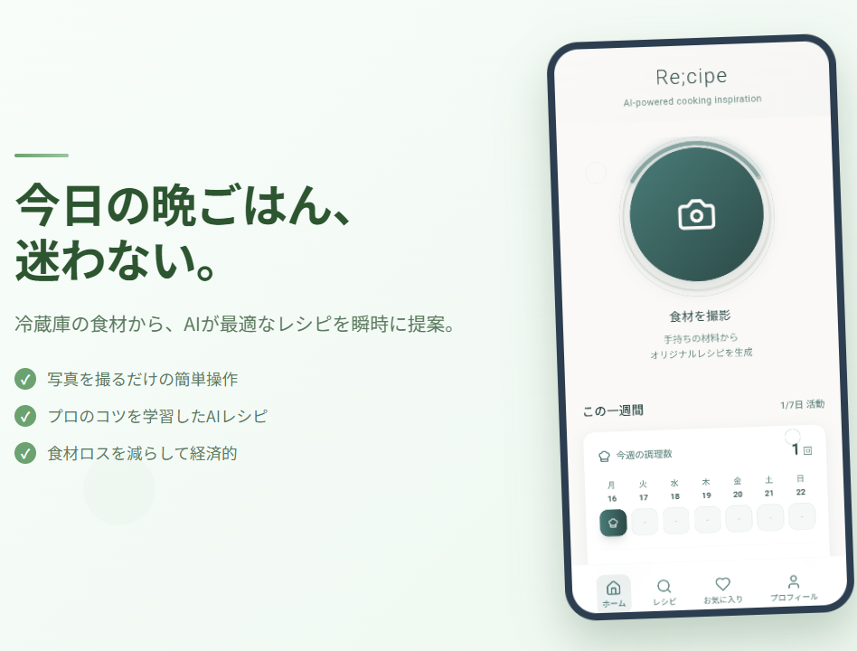 Re;cipe(リサイプ):『今日の晩ごはん、もう迷わない。』AIが「冷蔵庫の食材」から、あなたに最適な献立を提案するアプリ。 冷蔵庫の食材をスマホでパシャッと撮るだけ。 AIが瞬時に認識し、今日ぴったりのレシピを提案します。 「何を作るか」考える時間をなくし、毎日の食卓に心地よい「ひらめき」と「発見」をお届けします。 Re;cipeは、単なるレシピ検索アプリではありません。 私たちは、料理人やシェフ、そして日々の食卓を預かる人々の**『美味しさのコツ』や、科学的な『フレーバーペアリング』**をAIに深く学習させ、共に育んできました。だから、食材の組み合わせや調理法をAIが最適化し、人間では気づきにくい「なぜかすごく美味しい」、そんな奥深い味わいをあなたのキッチンで再現します。 Re;cipeのAIは、あなたの料理の**「相棒」**です。 人間が持つ感性や直感をAIがサポートすることで、毎日の料理はもっと自由で、もっと楽しくなります。 手間なく簡単: 写真を撮るだけで瞬時にレシピ提案。 食材を無駄なく: 冷蔵庫の残り物をAIが賢く使い切り、食品ロスにも貢献。 「美味しい」を追求: 私たちが育んだAIが、「プロのコツ」と「美味しさの科学」で家庭料理を格上げ。 料理初心者にも優しい: ワンパン、包丁なしレシピ、分かりやすい工程表示で、誰でも気軽に挑戦できます。 和モダンな心地よさ: 余白を活かした洗練されたデザインで、毎日使うのが楽しみになります。 毎日の献立に、AIと人が紡ぐ新たな「ひらめき」を。 さあ、Re;cipeで、あなたの料理をもっと自由に、もっと楽しく、そしてもっと美味しくしませんか?
