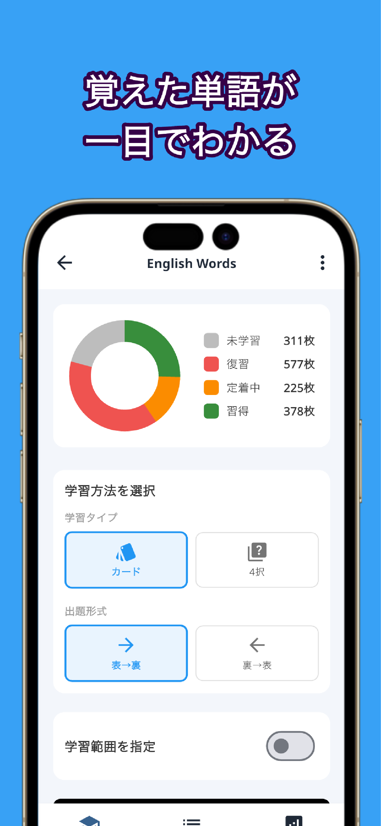 暗記は、もっと効率的になれる あなたは、こんな経験をしたことはありませんか? ・既に覚えた単語を、何度も何度も見返してしまう ・久しぶりに開いた参考書で、「あれ、これ覚えたはずなのに...」と愕然とする ・試験直前に焦って詰め込むも、結局忘れてしまう 私は高校生の頃、この非効率さに悩まされていました。紙の単語帳を使っていると、どの単語を覚えていて、どの単語を忘れかけているのか、まったく分からない。結果として、すでに完璧に覚えた単語を何度も復習する一方で、本当に復習すべき単語は放置してしまう。そして試験当日、「あの単語、やったはずなのに出てこない...」という経験を何度も繰り返しました。 暗記は、もっと効率的になれるはずだ。 そう信じて、Flipsを作りました。 --- Flipsのビジョン: 科学的な暗記を、すべての学習者に Flipsが目指すのは、暗記の民主化です。 忘却曲線という科学的な知見は、100年以上前から存在しています。記憶は時間とともに薄れていく。だからこそ、忘れる直前に復習することで、効率的に長期記憶に定着させることができる。この原理は、誰にでも平等に働きます。 Flipsは、この科学的な原理をテクノロジーで実装しました。もう、「いつ復習すべきか」を悩む必要はありません。もう、「覚えたつもりが忘れている」という不安に苦しむ必要もありません。 --- Flipsができること 1. 忘れる前にちょうど出る、スマート復習 Flipsの核心は、忘却曲線に基づいた出題アルゴリズムです。 あなたが各単語を「覚えた」「忘れかけ」「完全に忘れた」のどの状態にあるかを自動で追跡し、忘れる直前の最適なタイミングで復習問題を出題します。スワイプまたは4択回答で学習でき、あなたの回答に応じて次の復習タイミングを自動調整。 復習すべきタイミングでは通知が届くので、「ちょうど良いタイミング」を逃しません。 2. 暗記状況が一目で分かる、可視化機能 紙の単語帳では見えなかった「今の自分の状態」が、Flipsでは一目で分かります。 ・円グラフ: 「覚えた/忘れかけ/未学習」の割合を視覚的に表示 ・ストリーク表示: GitHubの草カレンダー風に、学習習慣の継続状況を見える化 ・忘却ゲージ: 単語一覧で各カードの「忘れやすさレベル」を表示し、優先度が一目瞭然 ・今日の復習数: ホーム画面で「今日やるべきこと」が明確に 「本当に覚えられているのか?」という不安から解放され、安心して学習に取り組めます。 3. 自分だけの単語帳を作れる、自作デッキ機能 公式の英単語デッキ(CEFR A1〜C2レベル対応)に加えて、自作デッキ機能を搭載。 ・自由にカードを作成できる ・CSVファイルから簡単にインポート可能 ・音声読み上げ(TTS)にも対応し、リスニング学習もサポート 受験対策、資格試験、語学学習など、あなたの学習目的に合わせて自由にカスタマイズできます。 4. 世界中の学習者をサポート、7言語対応 英語・日本語・スペイン語・フランス語・ドイツ語・中国語・韓国語に対応。どの言語ペアでもカード生成が可能で、世界中の学習者が利用できます。 --- Flipsが実現する学習体験 「もう暗記で悩まない」体験 従来の暗記法では、「どの単語を復習すべきか」「いつ復習すべきか」を自分で判断する必要がありました。しかしFlipsでは、アルゴリズムがすべて自動で判断。あなたは「今日やるべきこと」に集中するだけで、効率的に記憶を定着させられます。 「暗記が習慣になる」体験 ストリーク表示と復習リマインダーにより、毎日の学習が自然と習慣化。学習の進捗が見えることで達成感とモチベーションが持続し、気づけば暗記が歯磨きのように当たり前の習慣になります。 「安心して学習できる」体験 自分が何を覚えていて、何を忘れかけているか、常に把握できる。円グラフや忘却ゲージで記憶状態が可視化されているので、「本当にこれで大丈夫?」という不安から解放されます。 --- 導入効果 ・忘れにくくなる: 忘却曲線に沿った最適なタイミングでの復習により、一度覚えたことが長期間忘れにくくなる ・短時間で効率的に: 忘れやすいものから優先的に復習するので、限られた時間でも最大の暗記効果を実現 ・学習習慣が身につく: 連続学習日数の表示と復習リマインダーにより、自然と毎日の暗記習慣が形成される --- これからの展望 Flipsは、まだ始まったばかりです。 現在は英単語を中心に提供していますが、今後は大学受験の全科目、各種資格試験、さらには世界中の言語学習へと展開していきます。Flipsを、暗記が必要なすべての学習者にとっての必須ツールにする。それが、私たちの目標です。 暗記は、苦痛であってはいけません。 暗記は、非効率であってはいけません。 暗記は、科学的であるべきです。 Flipsと共に、新しい学習体験を始めましょう。 --- 📲 Flipsをダウンロード 忘れる前にちょうど出る単語帳で、科学的な暗記を今すぐ始めましょう。 ・iOS: App Store からダウンロード [https://apps.apple.com/us/app/flips-ju