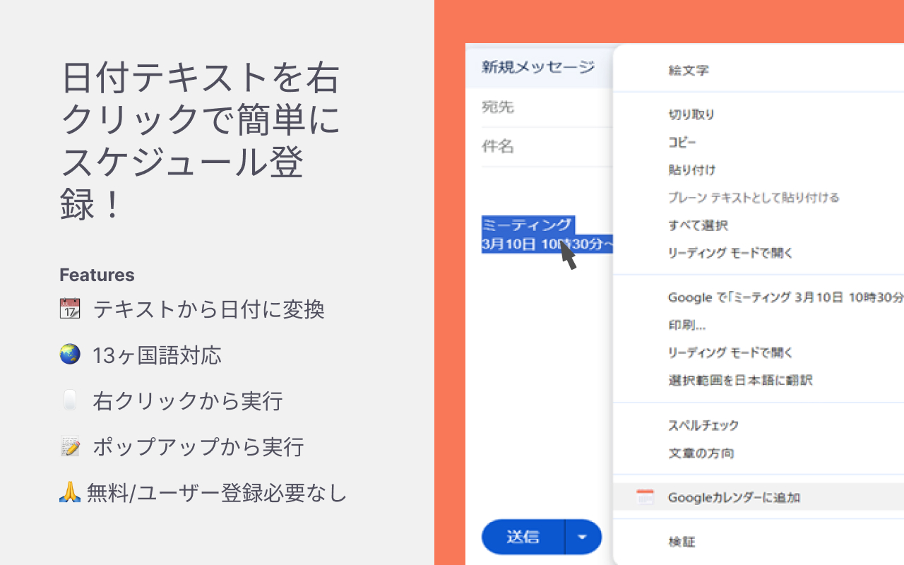 📅 右クリックするだけで、Googleカレンダーに予定を追加! Googleカレンダーにイベントを登録するのが面倒だと感じたことはありませんか? この拡張機能を使えば、選択したテキストを右クリックするだけで、簡単にGoogleカレンダーに予定を追加できます! 🔧 使い方 1️⃣ 予定を含むテキストを選択 2️⃣ 右クリックメニューから「Googleカレンダーに追加」をクリック 3️⃣ Googleカレンダーのイベント作成ページが開くので、確認して保存! 🛠 主な機能 ✅ 右クリックメニューからGoogleカレンダーに追加 ✅ 日付・時間を自動認識してイベントを作成 ✅ 「3月10日 14:00」や「2025/5/20」などの形式に対応 ✅ ワンクリックでGoogleカレンダーを開き、編集可能 🎯 こんな方におすすめ! ✔ メールやチャットの予定をすぐにGoogleカレンダーに登録したい ✔ 日付を手入力せずに、素早くスケジュールを追加したい ✔ 仕事やプライベートの予定を効率よく管理したい 💡 これでスケジュール管理がもっと楽になります! 今すぐ 「Googleカレンダー簡単追加」 をインストールして、あなたの貴重な10秒を節約しましょう 🚀
