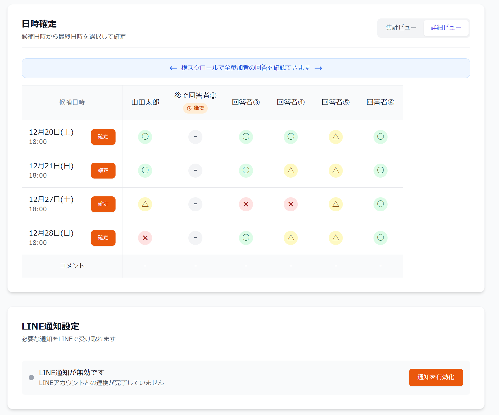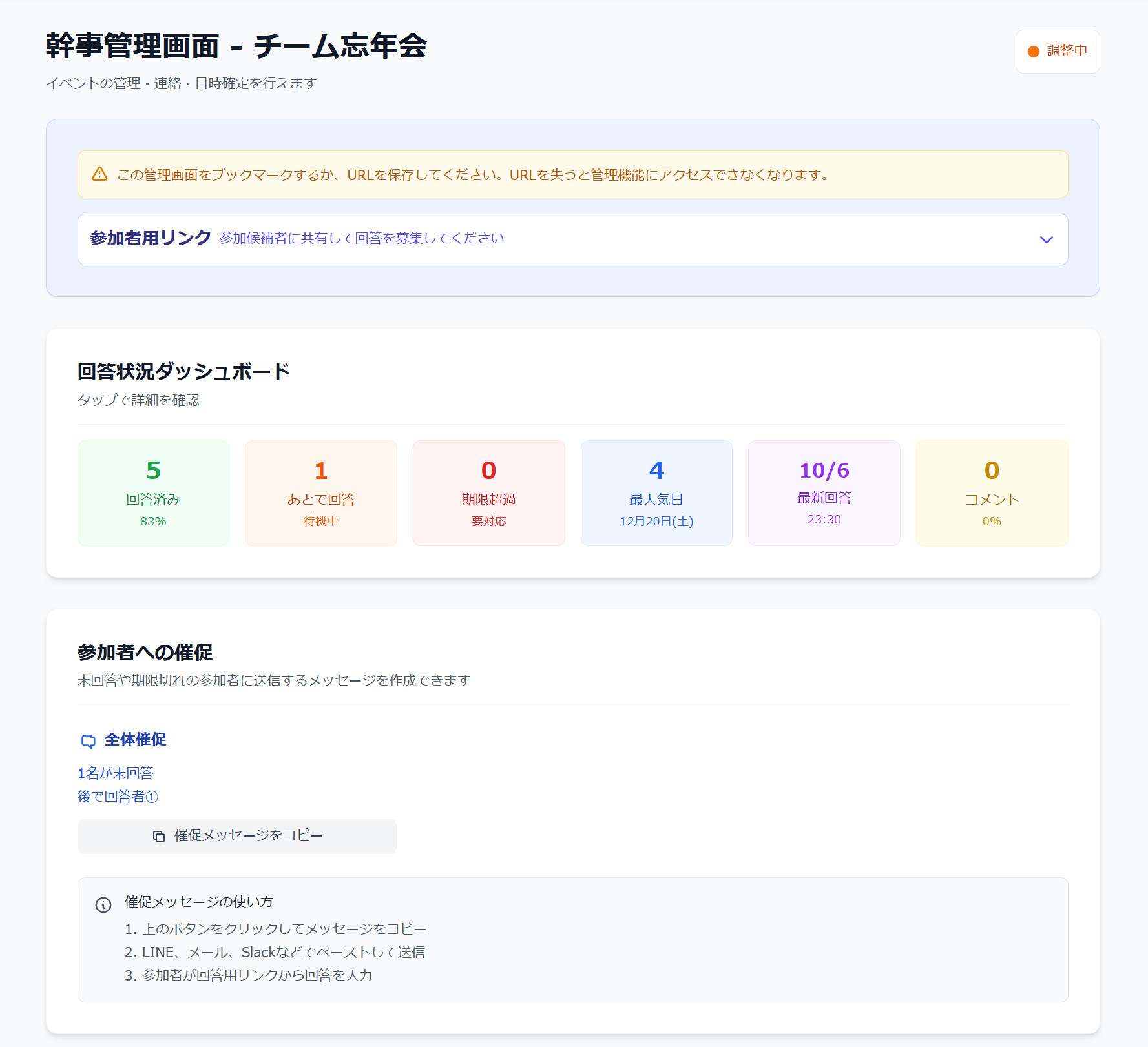 参加者の回答管理・催促から、日時確定後の会費管理まで。 飲み会、勉強会、サークル活動など、あらゆるイベントの幹事の負担を大幅に軽減するサービスです。