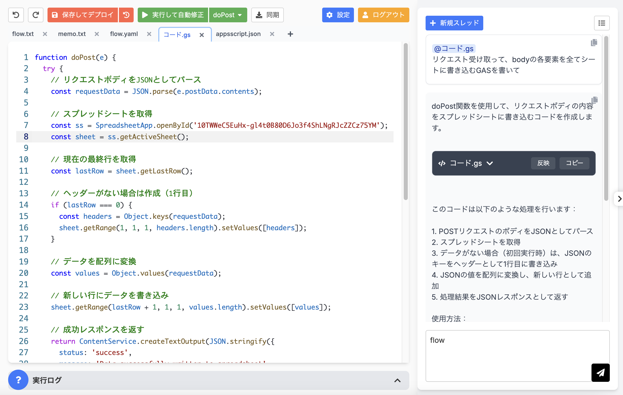 Cursorっていいですよね。 僕もうコーディングにChatGPTツカワナイ。 それに慣れるとGASが面倒で面倒で、AI搭載してくんないかなーって思ってたんですが、Googleのアップデート待ってられなくて作っちゃいました。 コード提案・反映はもちろん、自動デバッグやスプレッドシートの参照など、GASコーディングに最適化されたAIとUI/UX。 Googleログインするだけですぐに使い始められます。 12/25の大型アップデートでは、新時代のコーディング体験を世に提案します。 ノーコードに出来ないことを、ノーコードより簡単に。
