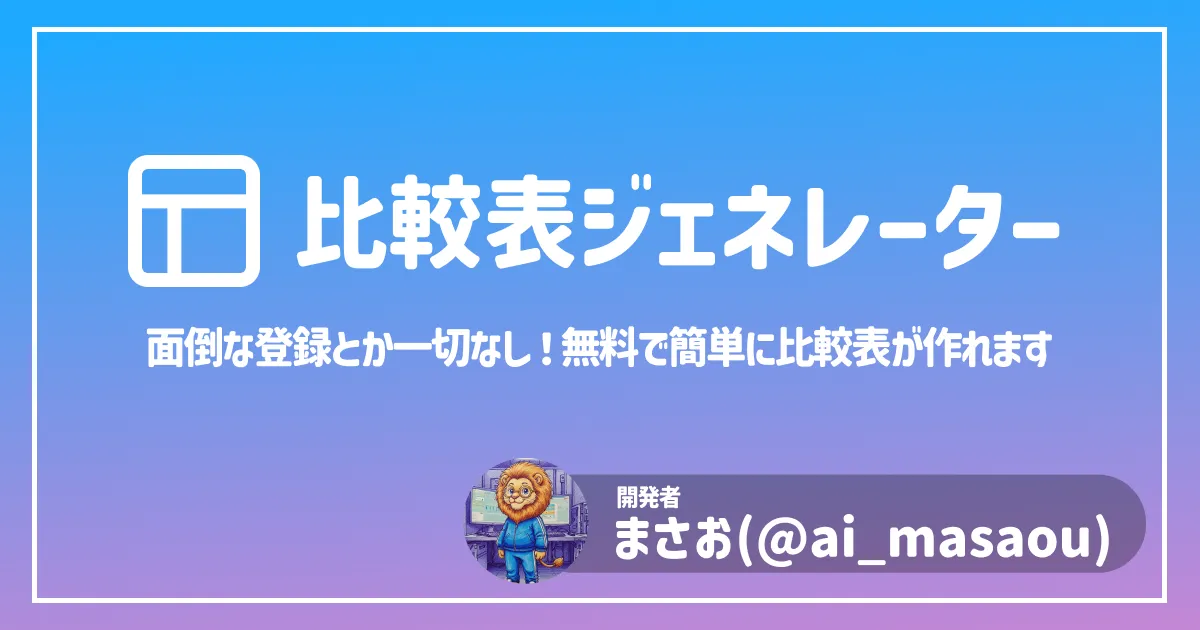 直感的な操作で簡単に比較表が作成できるWebアプリです。 4列までの比較表を作成でき、行の追加も自由自在。 ヘッダーやセルの文字色、背景色、アイコンなどをカスタマイズして、 あなただけの見やすい比較表を作成できます。 作成した比較表は画像として保存可能で、 プレゼンテーションや資料作成にすぐに使えます。