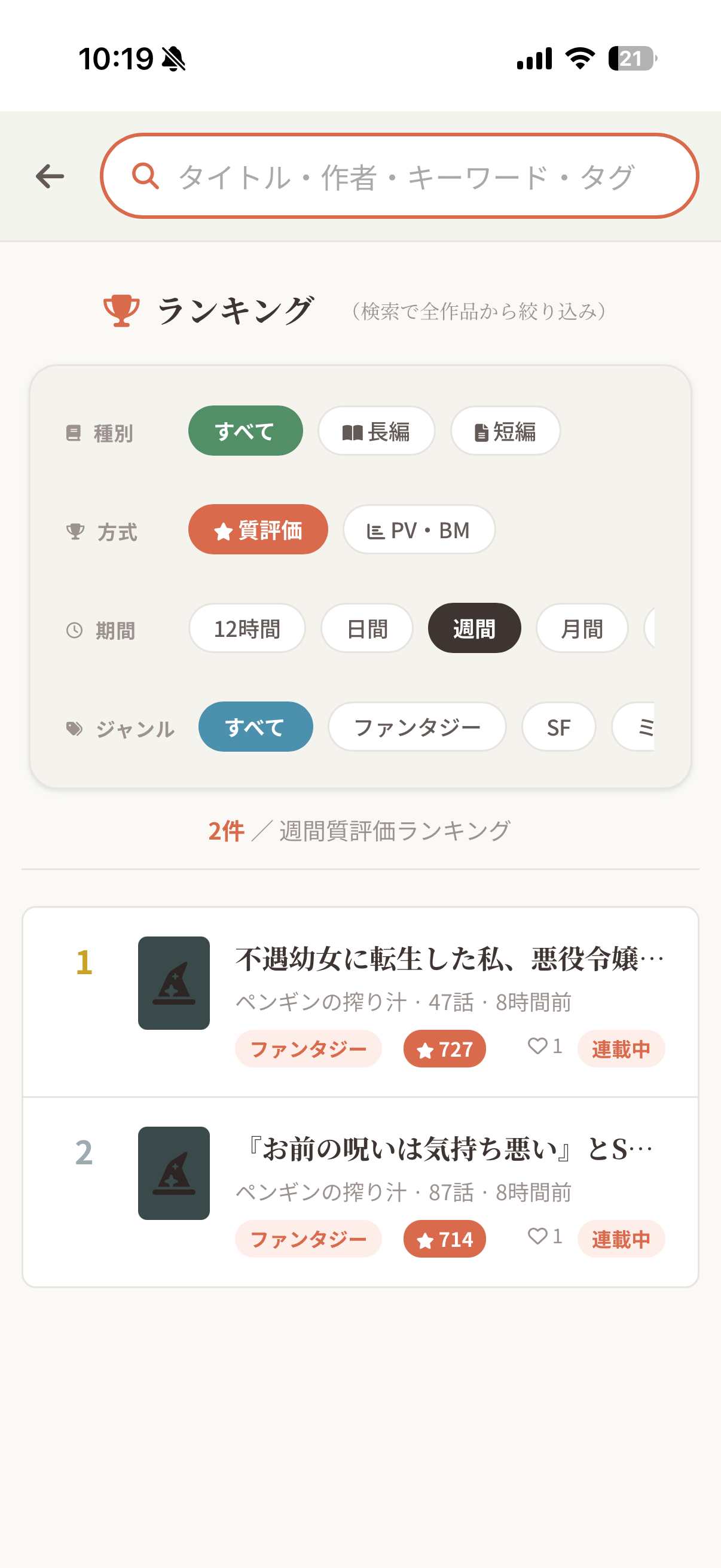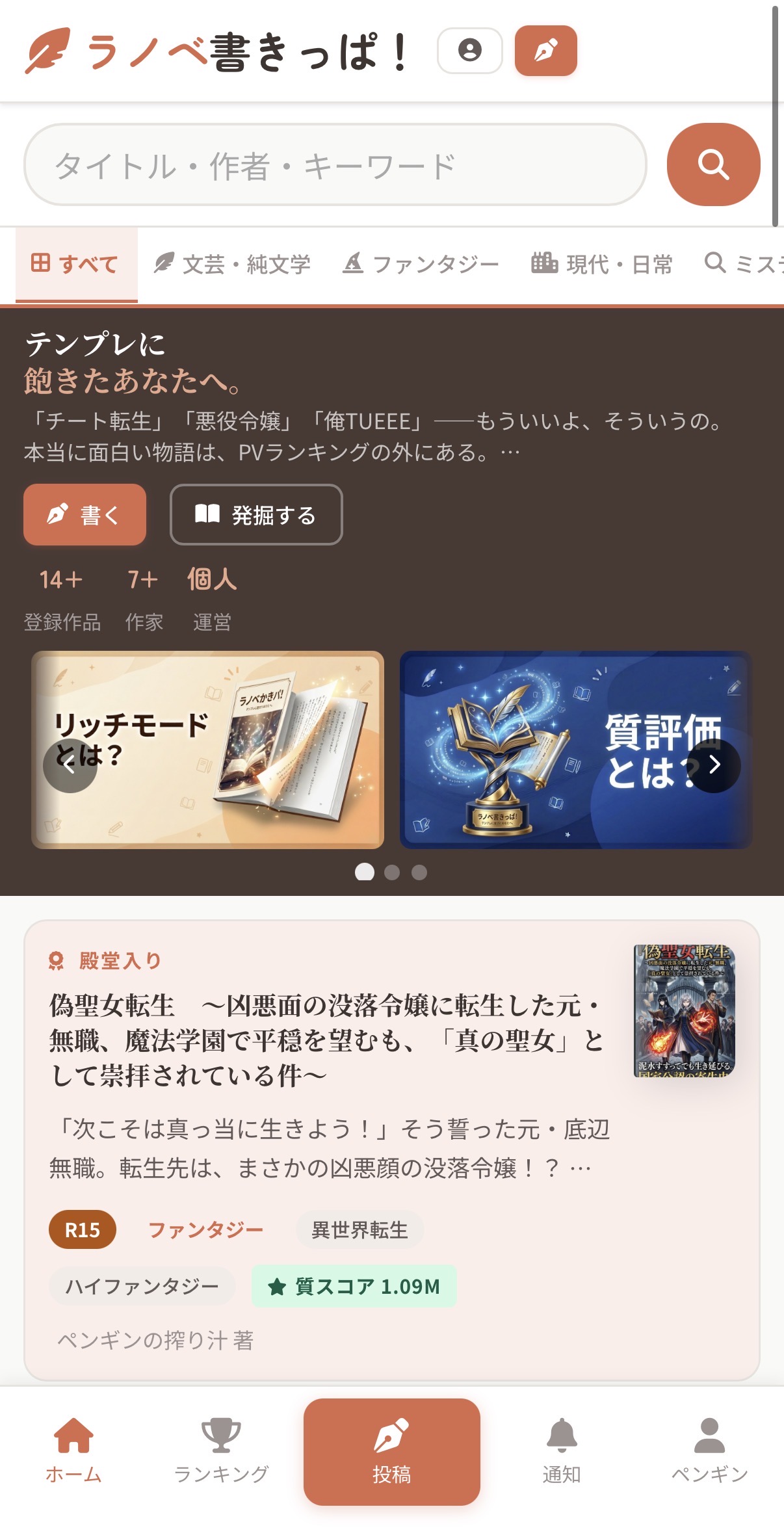 小説家になろうや、カクヨムと違いテンプレ一強ではなく本当に品質の高い物が評価される『質評価システム』搭載の小説投稿サイトです。 cloudflare workersを通してsupabaseでDB管理・アカウント登録をしています。 開発期間は8日です。