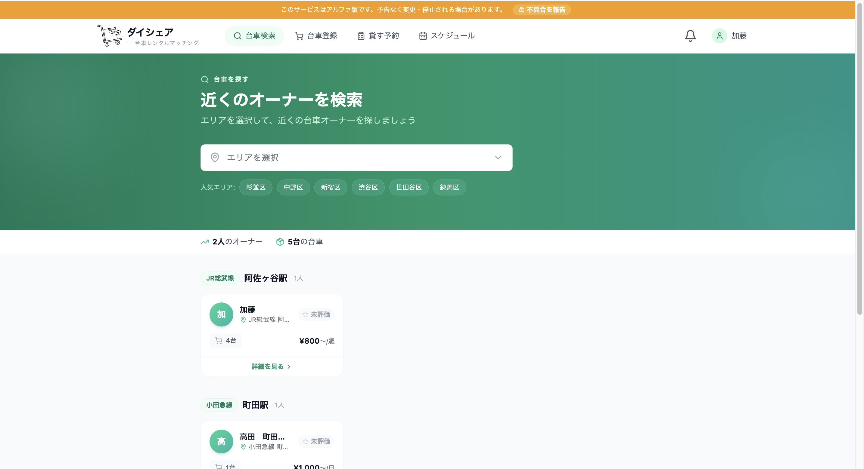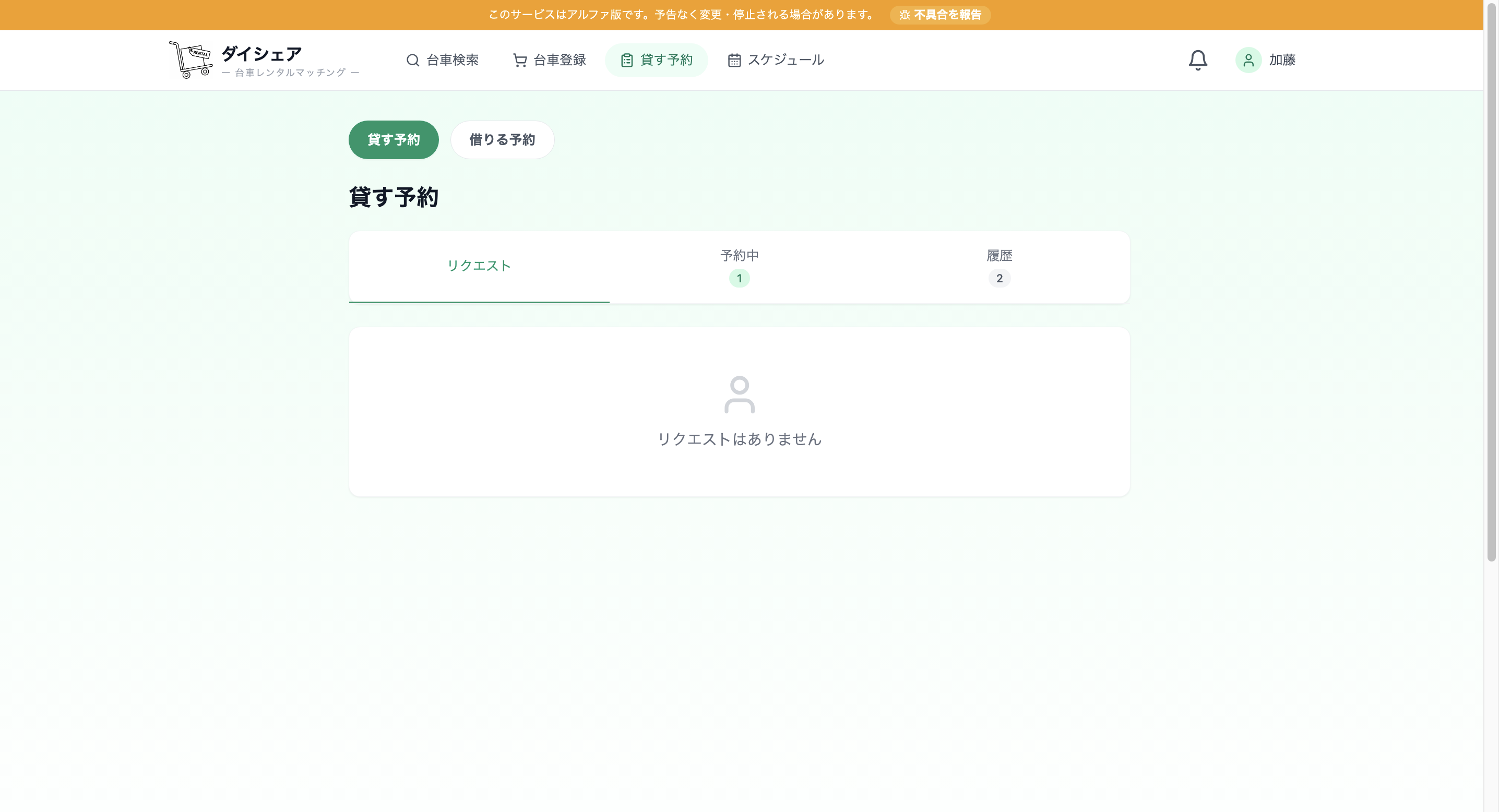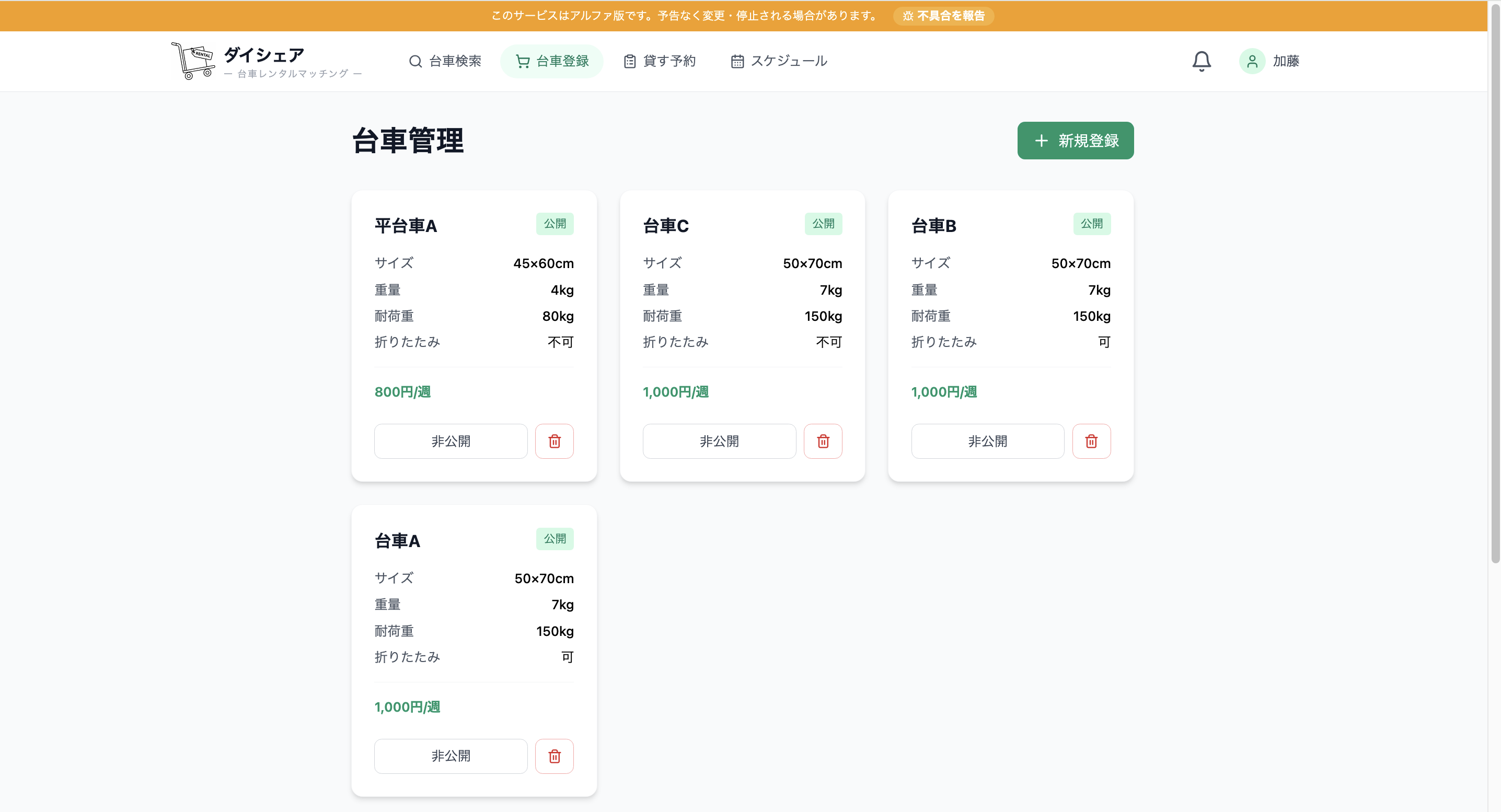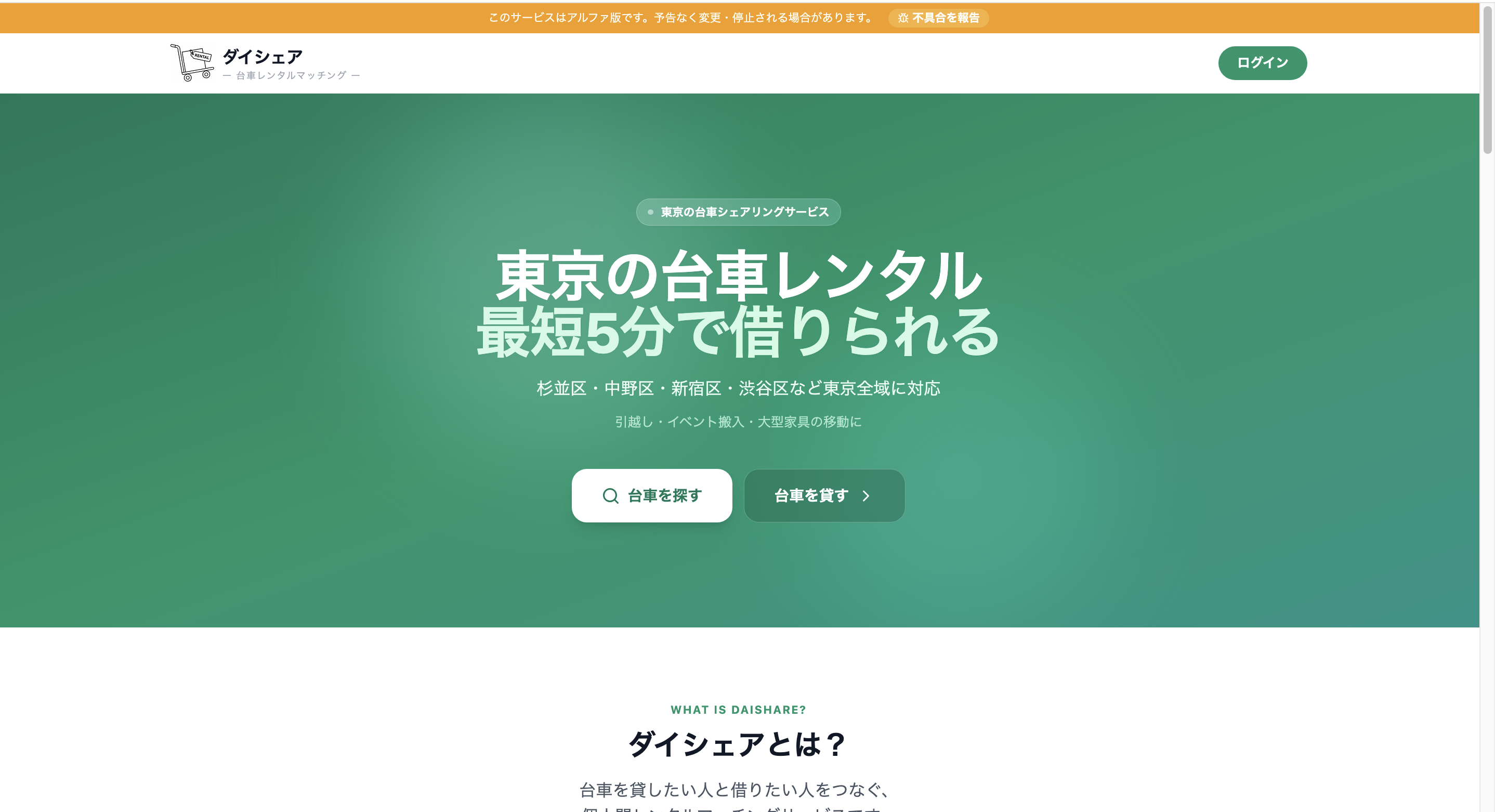 ダイシェアは、近所で台車を貸し借りできるレンタルマッチングサービスです。 引っ越しや家具の運搬、大型の買い物などで 「少しだけ台車が必要」という場面は意外と多いですが、 台車を購入するほどではない場合も多いと思います。 そこで、使っていない台車を持っている人と、 台車を借りたい人をマッチングするサービスを作りました。 台車を貸したい人は登録することで収入を得ることができ、 借りたい人は近くの台車を手軽に見つけることができます。 現在は東京エリアを中心にテスト運用中です。 ぜひ一度使ってみてください!